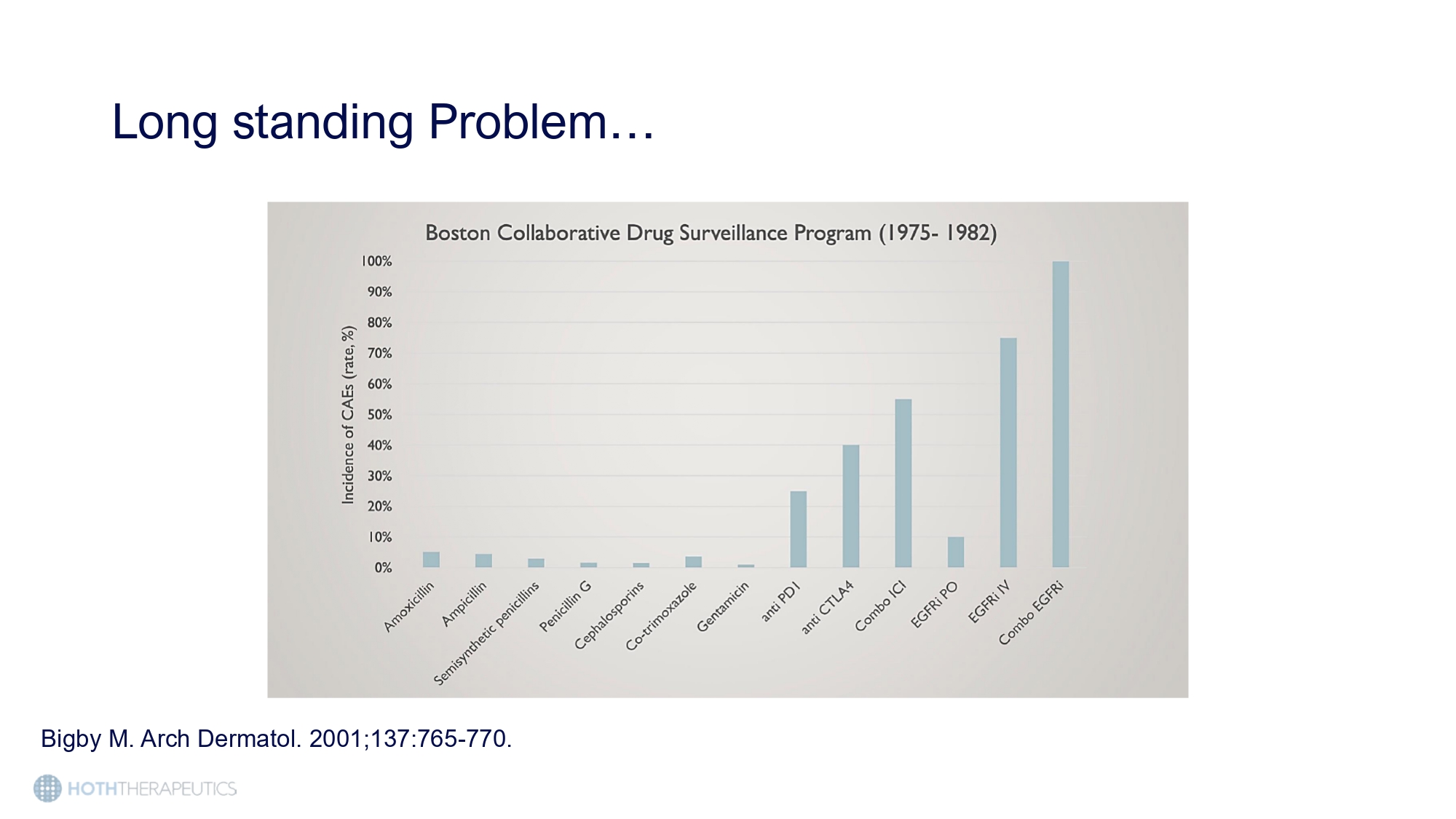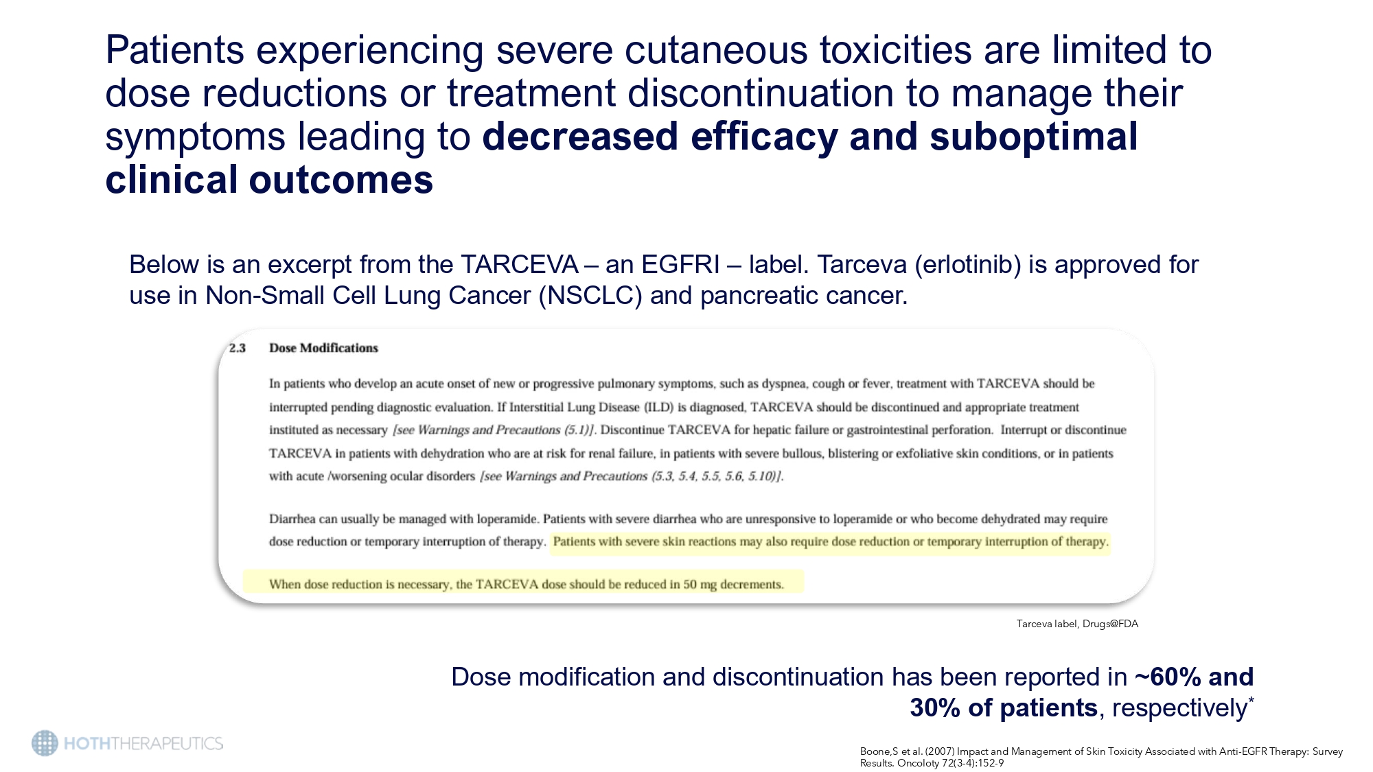 Patients experiencing severe cutaneous toxicities are limited to dose reductions or treatment discontinuation to manage their symptoms leading to decreased efficacy and suboptimal clinical outcomes Below is an excerpt from the TARCEVA – an EGFRI – label. Tarceva (erlotinib) is approved for use in Non - Small Cell Lung Cancer (NSCLC) and pancreatic cancer. Tarceva label, Drugs@FDA Dose modification and discontinuation has been reported in ~60% and 30% of patients , respectively * Boone,S et al. (2007) Impact and Management of Skin Toxicity Associated with Anti - EGFR Therapy: Survey Results. Oncoloty 72(3 - 4):152 - 9 Long standing Problem… Bigby M. Arch Dermatol. 2001;137:765 - 770.