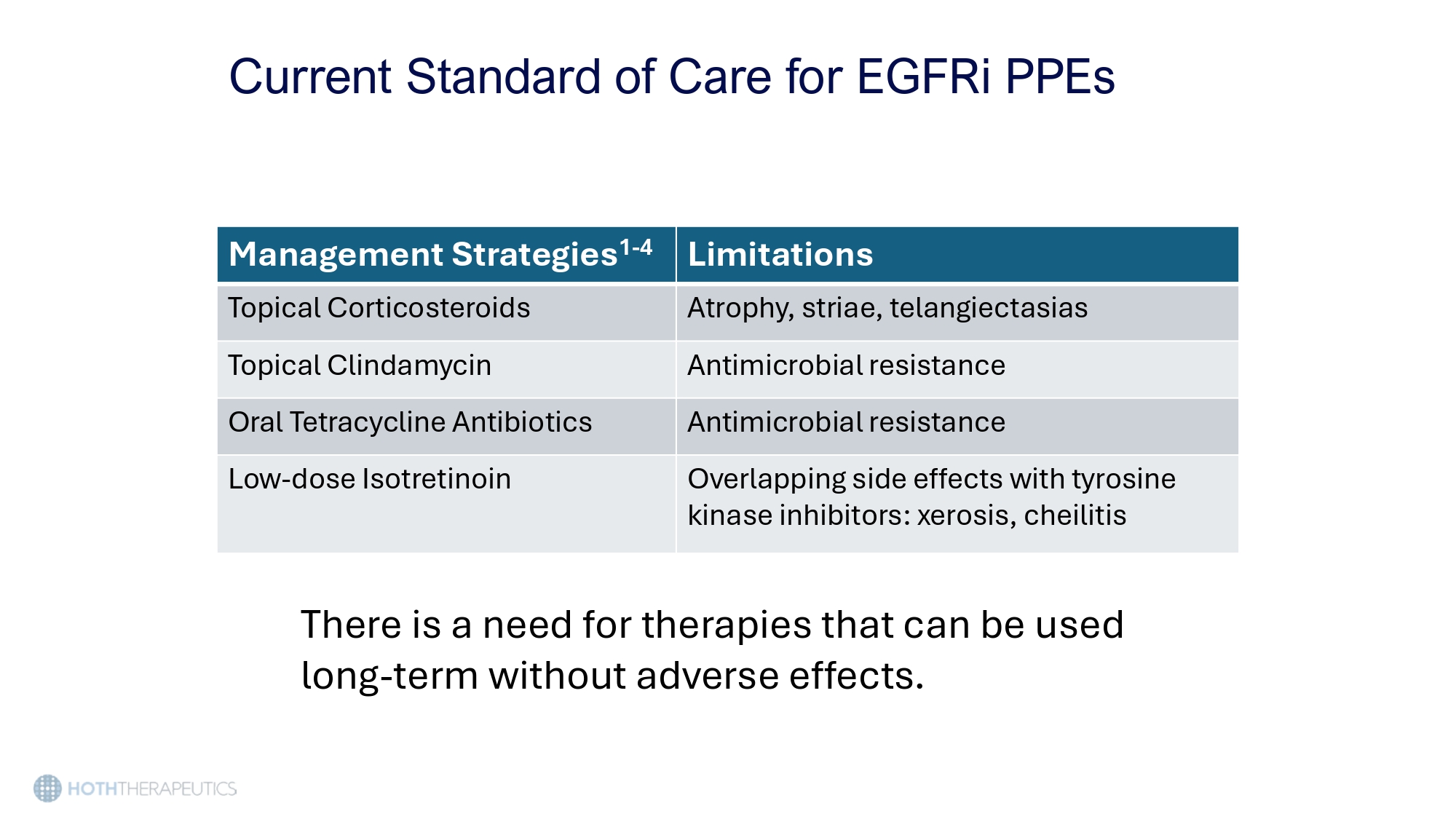 Current Standard of Care for EGFRi PPEs There is a need for therapies that can be used long - term without adverse effects. Limitations Management Strategies 1 - 4 Atrophy, striae, telangiectasias Topical Corticosteroids Antimicrobial resistance Topical Clindamycin Antimicrobial resistance Oral Tetracycline Antibiotics Overlapping side effects with tyrosine kinase inhibitors: xerosis, cheilitis Low - dose Isotretinoin HT - 001 A patient - centric topical solution for EGFRI induced dermal toxicities
