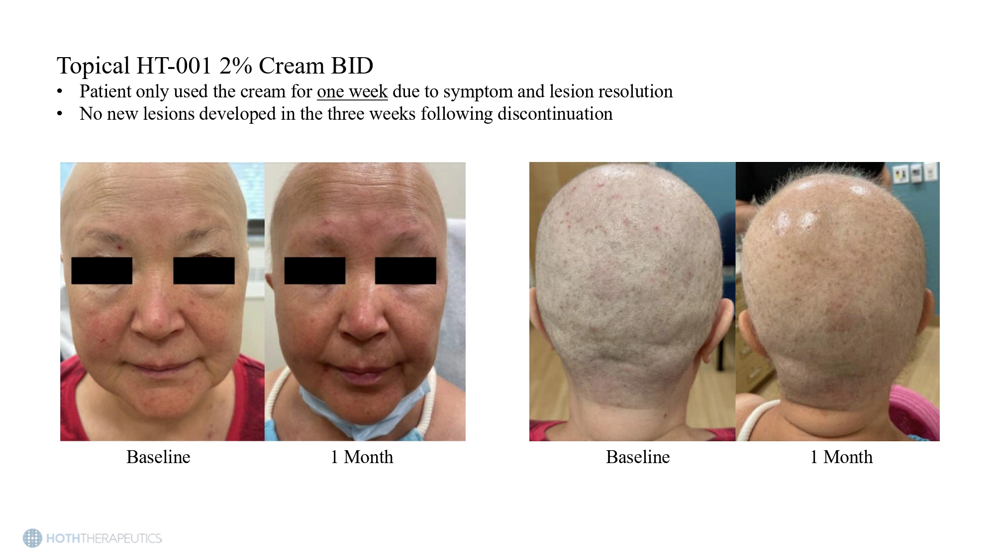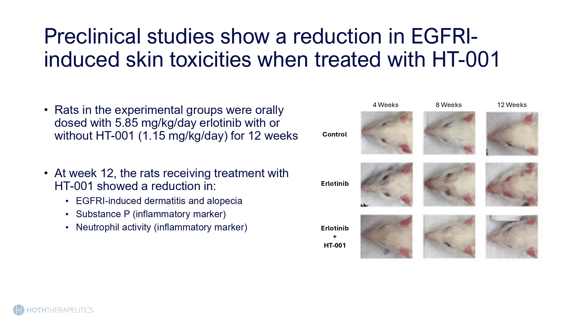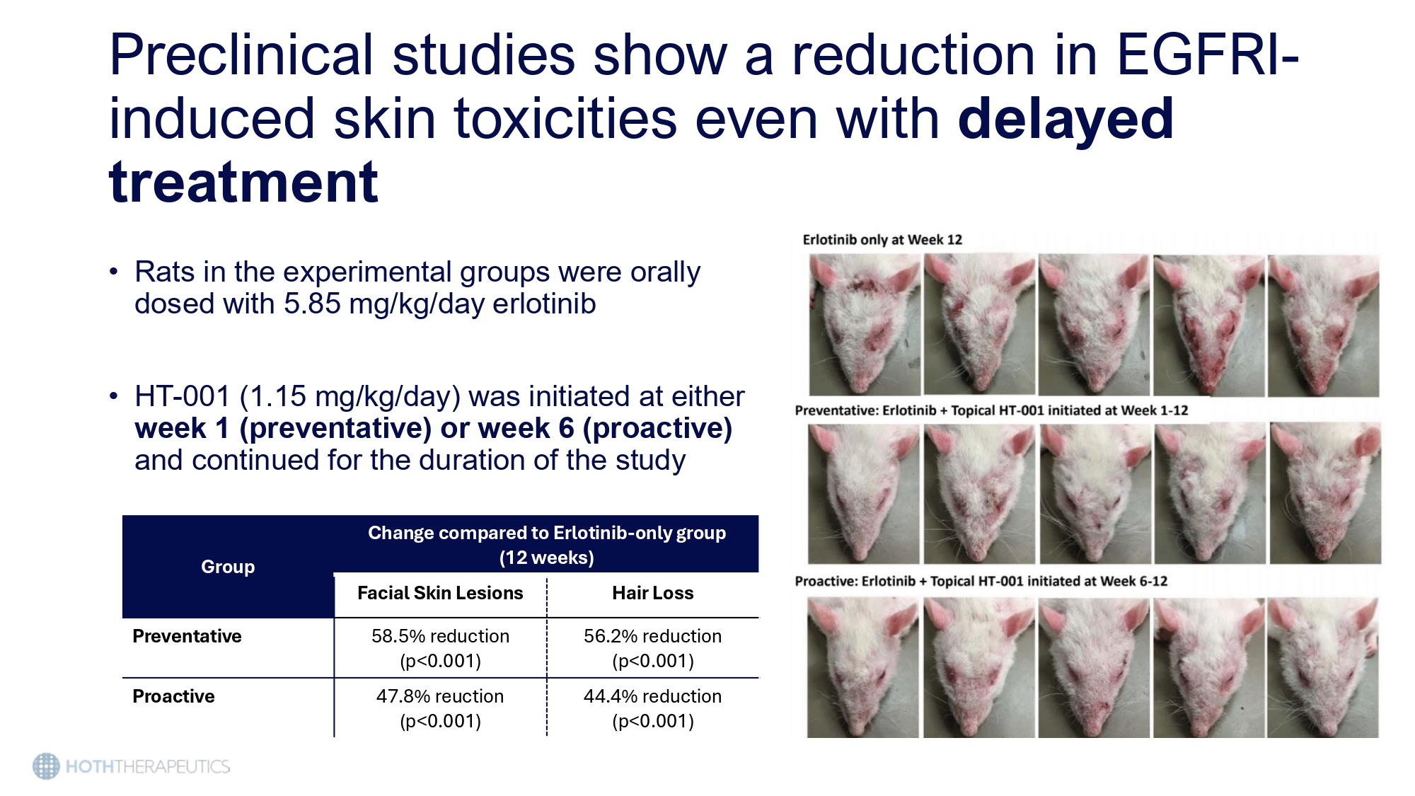 Preclinical studies show a reduction in EGFRI - induced skin toxicities even with delayed treatment • Rats in the experimental groups were orally dosed with 5.85 mg/kg/day erlotinib • HT - 001 (1.15 mg/kg/day) was initiated at either week 1 (preventative) or week 6 (proactive) and continued for the duration of the study Change compared to Erlotinib - only group (12 weeks) Group Hair Loss Facial Skin Lesions 56.2% reduction (p<0.001) 58.5% reduction (p<0.001) Preventative 44.4% reduction (p<0.001) 47.8% reuction (p<0.001) Proactive Topical HT - 001 2% Cream BID • Patient only used the cream for one week due to symptom and lesion resolution • No new lesions developed in the three weeks following discontinuation Baseline 1 Month Baseline 1 Month