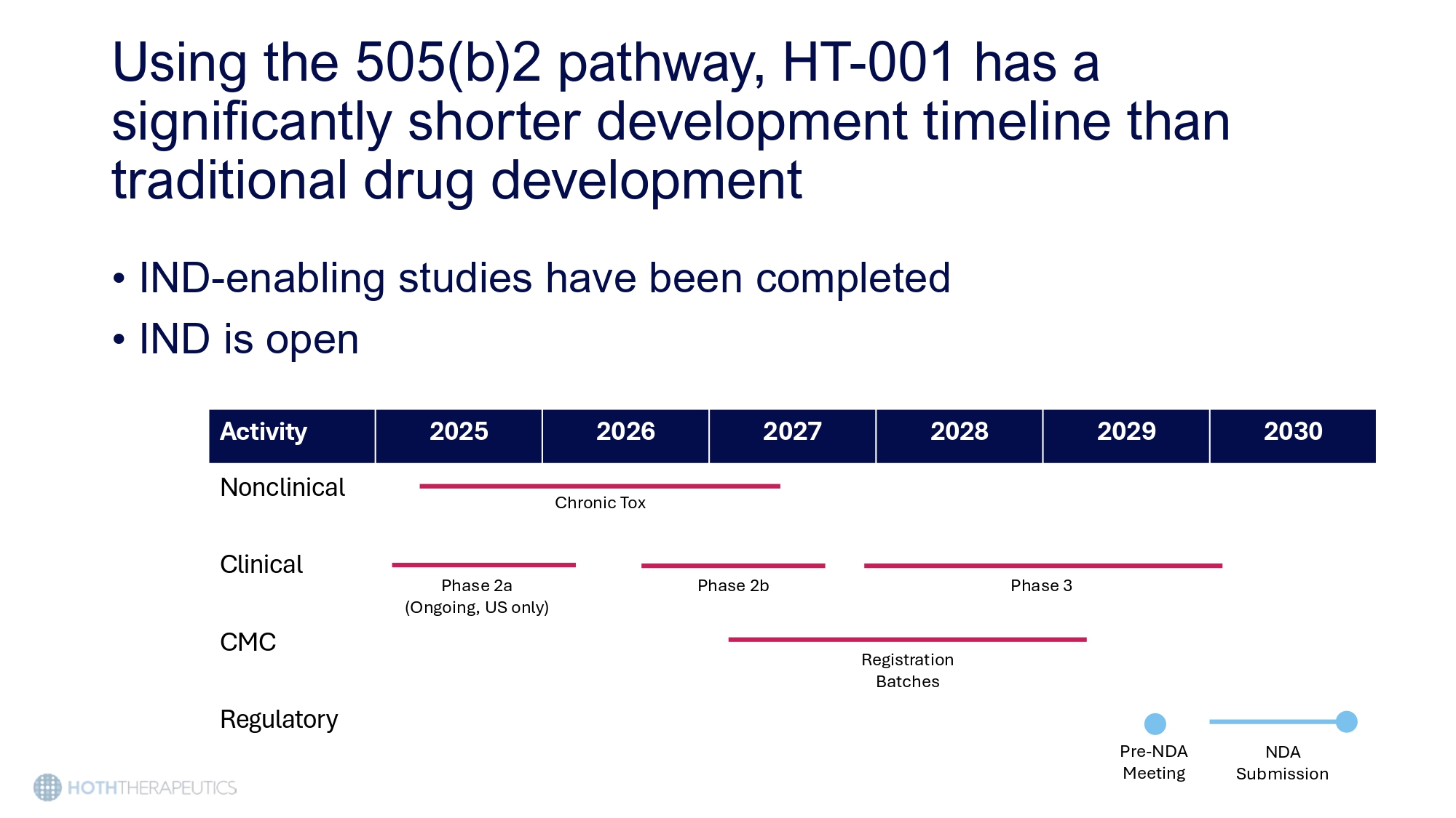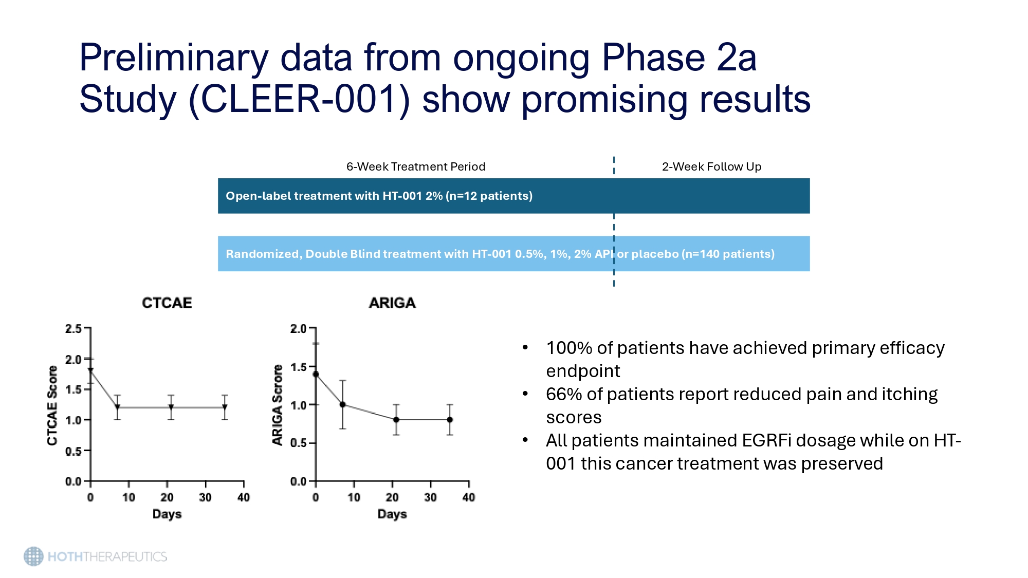 Preliminary data from ongoing Phase 2a Study (CLEER - 001) show promising results 6 - Week Treatment Period 2 - Week Follow Up Open - label treatment with HT - 001 2% (n=12 patients) Randomized, Double Blind treatment with HT - 001 0.5%, 1%, 2% API or placebo (n=140 patients) • 100% of patients have achieved primary efficacy endpoint • 66% of patients report reduced pain and itching scores • All patients maintained EGRFi dosage while on HT - 001 this cancer treatment was preserved Using the 505(b)2 pathway, HT - 001 has a significantly shorter development timeline than traditional drug development • IND - enabling studies have been completed • IND is open 2030 2029 2028 2027 2026 2025 Activity Nonclinical Chronic Tox Clinical e 3 Phas ase 2b Ph ) Phase 2a (Ongoing, US only CMC istration Batches Reg Pre - NDA Meeting Regulatory NDA Submission