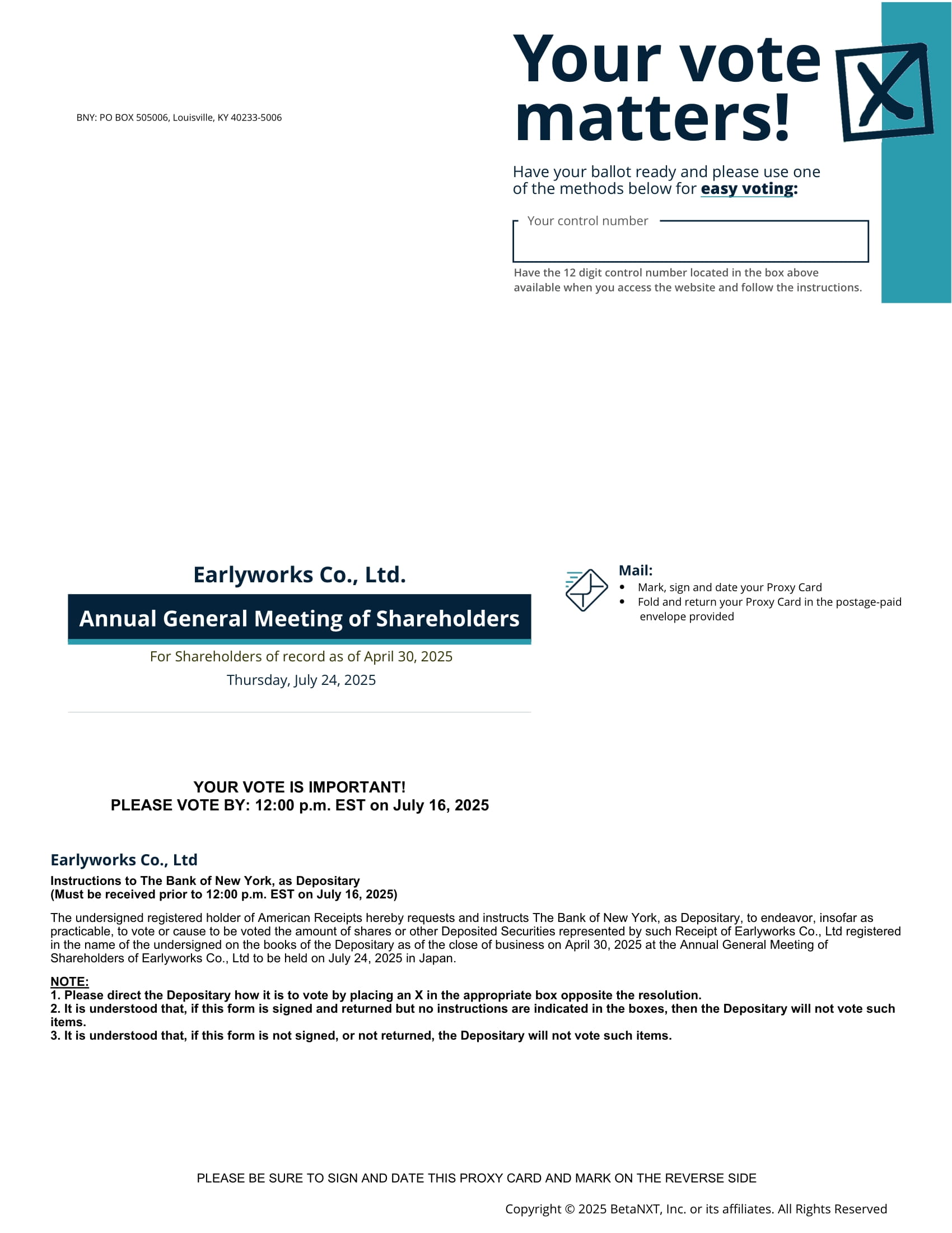 PLEASE BE SURE TO SIGN AND DATE THIS PROXY CARD AND MARK ON THE REVERSE SIDE Copyright © 2025 BetaNXT, Inc. or its affiliates. All Rights Reserved YOUR VOTE IS IMPORTANT! PLEASE VOTE BY: 12:00 p.m. EST on July 16, 2025 Earlyworks Co., Ltd Instructions to The Bank of New York, as Depositary (Must be received prior to 12:00 p.m. EST on July 16, 2025) The undersigned registered holder of American Receipts hereby requests and instructs The Bank of New York, as Depositary, to endeavor, insofar as practicable, to vote or cause to be voted the amount of shares or other Deposited Securities represented by such Receipt of Earlyworks Co., Ltd registered in the name of the undersigned on the books of the Depositary as of the close of business on April 30, 2025 at the Annual General Meeting of Shareholders of Earlyworks Co., Ltd to be held on July 24, 2025 in Japan. NOTE: 1. Please direct the Depositary how it is to vote by placing an X in the appropriate box opposite the resolution. 2. It is understood that, if this form is signed and returned but no instructions are indicated in the boxes, then the Depositary will not vote such items. 3. It is understood that, if this form is not signed, or not returned, the Depositary will not vote such items. Earlyworks Co., Ltd. Annual General Meeting of Shareholders For Shareholders of record as of April 30, 2025 Thursday, July 24, 2025 BNY: PO BOX 505006, Louisville, KY 40233 - 5006 Mail: • Mark, sign and date your Proxy Card • Fold and return your Proxy Card in the postage - paid envelope provided Your vote matters! Have your ballot ready and please use one of the methods below for easy voting : Your control number Have the 12 digit control number located in the box above available when you access the website and follow the instructions.