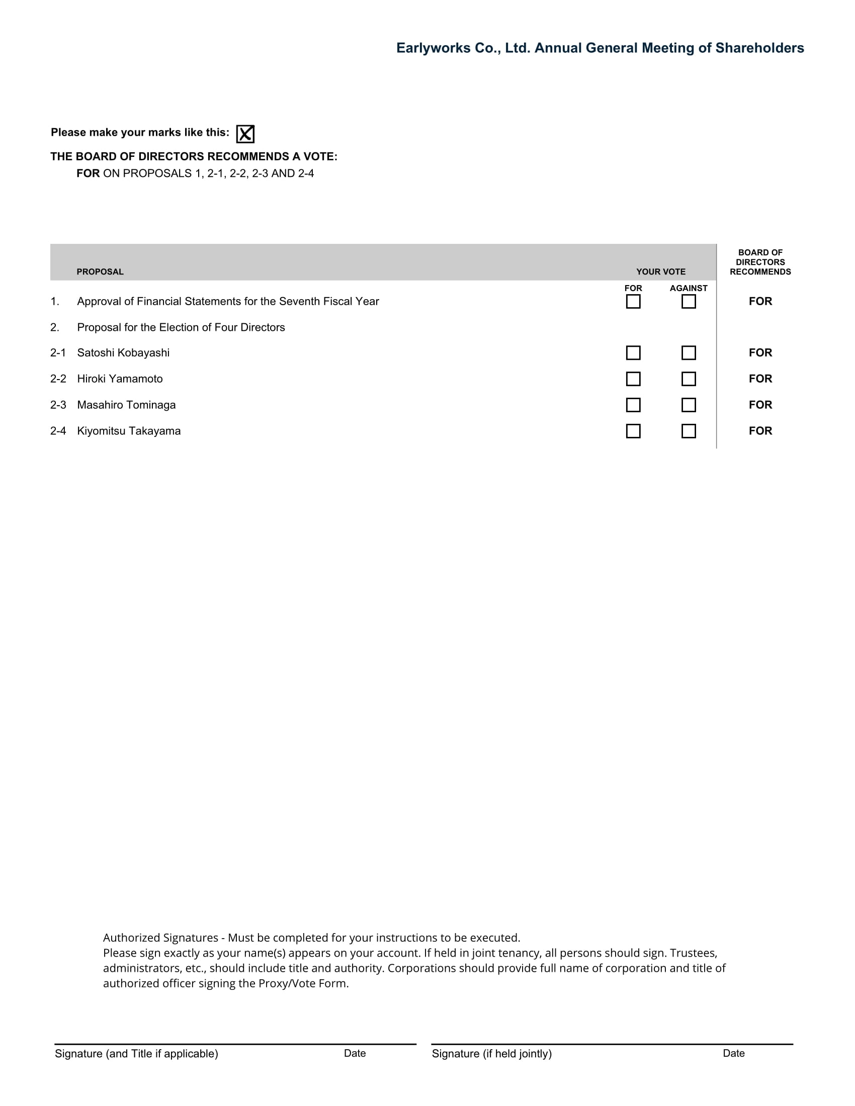 Earlyworks Co., Ltd. Annual General Meeting of Shareholders Please make your marks like this: THE BOARD OF DIRECTORS RECOMMENDS A VOTE: FOR ON PROPOSALS 1, 2 - 1, 2 - 2, 2 - 3 AND 2 - 4 PROPOSAL YOUR VOTE BOARD OF DIRECTORS RECOMMENDS FOR AGAINST 1. Approval of Financial Statements for the Seventh Fiscal Year FOR 2. Proposal for the Election of Four Directors 2 - 1 Satoshi Kobayashi FOR 2 - 2 Hiroki Yamamoto FOR 2 - 3 Masahiro Tominaga FOR 2 - 4 Kiyomitsu Takayama FOR Authorized Signatures - Must be completed for your instructions to be executed. Please sign exactly as your name(s) appears on your account. If held in joint tenancy, all persons should sign. Trustees, administrators, etc., should include title and authority. Corporations should provide full name of corporation and title of authorized officer signing the Proxy/Vote Form. Signature (and Title if applicable) Date Date Signature (if held jointly)