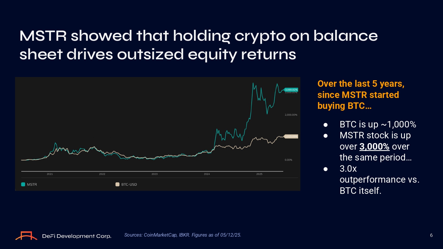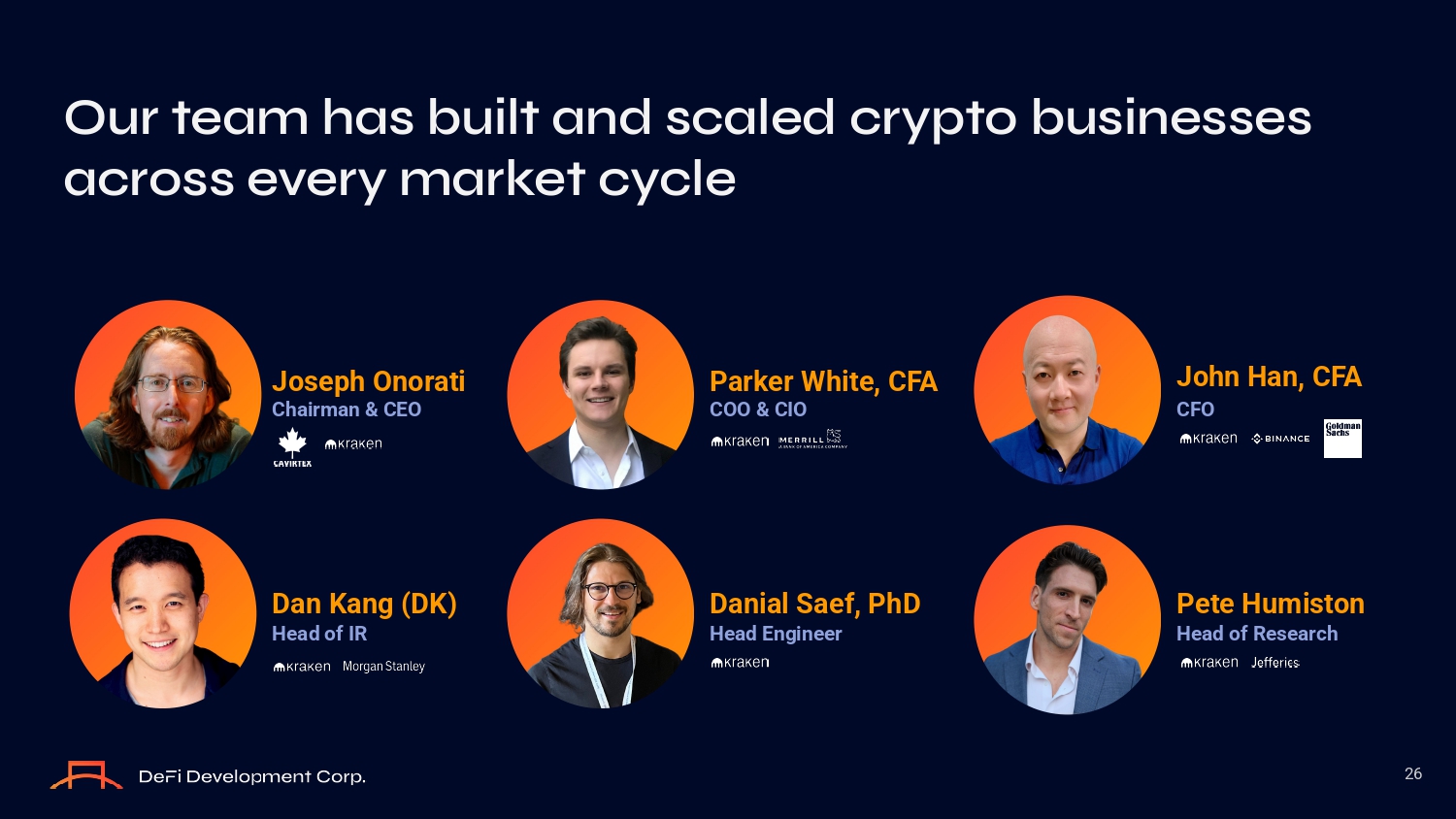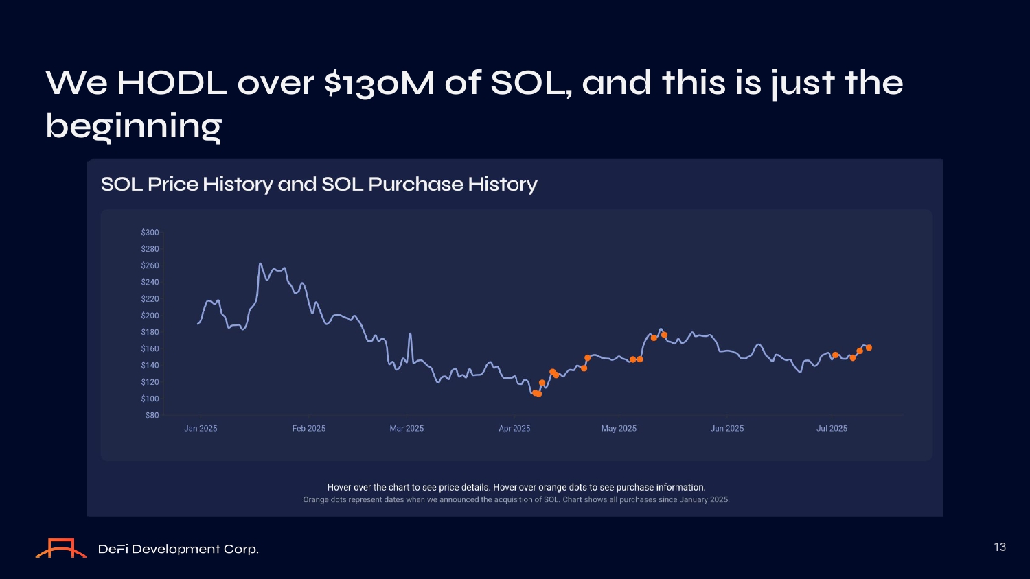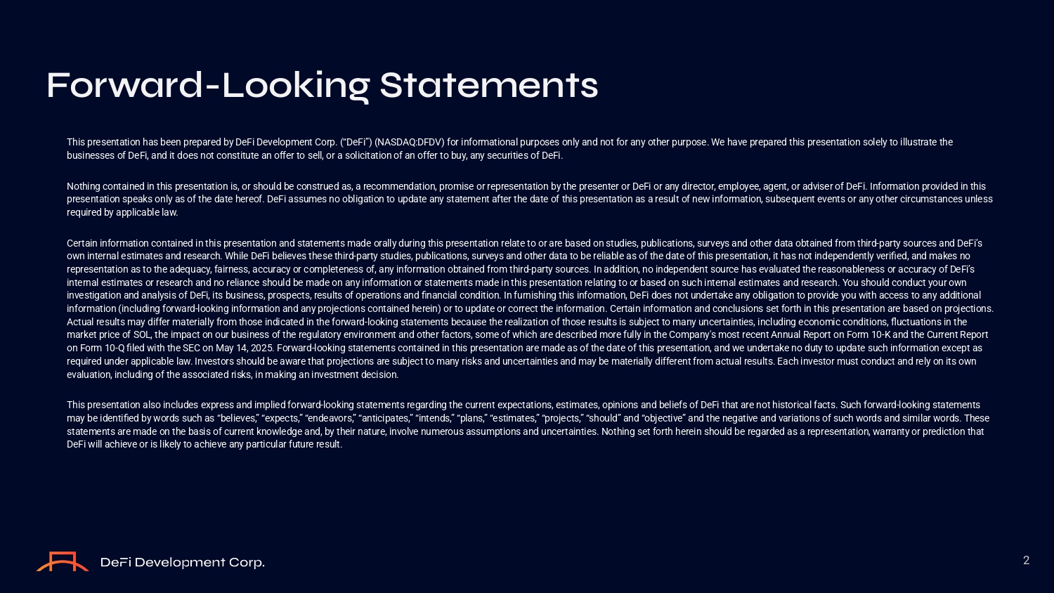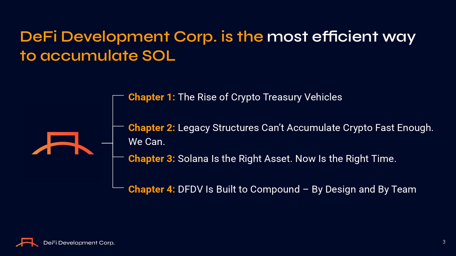 Forward - Looking Statements 2 This presentation has been prepared by DeFi Development Corp. (“DeFi”) (NASDAQ:DFDV) for informational purposes only and not for any other purpose. We have prepared this presentation solely to illustrate the businesses of DeFi, and it does not constitute an offer to sell, or a solicitation of an offer to buy, any securities of DeFi. Nothing contained in this presentation is, or should be construed as, a recommendation, promise or representation by the presenter or DeFi or any director, employee, agent, or adviser of DeFi. Information provided in this presentation speaks only as of the date hereof. DeFi assumes no obligation to update any statement after the date of this presentation as a result of new information, subsequent events or any other circumstances unless required by applicable law. Certain information contained in this presentation and statements made orally during this presentation relate to or are based on studies, publications, surveys and other data obtained from third - party sources and DeFi’s own internal estimates and research. While DeFi believes these third - party studies, publications, surveys and other data to be reliable as of the date of this presentation, it has not independently verified, and makes no representation as to the adequacy, fairness, accuracy or completeness of, any information obtained from third - party sources. In addition, no independent source has evaluated the reasonableness or accuracy of DeFi’s internal estimates or research and no reliance should be made on any information or statements made in this presentation relating to or based on such internal estimates and research. You should conduct your own investigation and analysis of DeFi, its business, prospects, results of operations and financial condition. In furnishing this information, DeFi does not undertake any obligation to provide you with access to any additional information (including forward - looking information and any projections contained herein) or to update or correct the information. Certain information and conclusions set forth in this presentation are based on projections. Actual results may differ materially from those indicated in the forward - looking statements because the realization of those results is subject to many uncertainties, including economic conditions, fluctuations in the market price of SOL, the impact on our business of the regulatory environment and other factors, some of which are described more fully in the Company's most recent Annual Report on Form 10 - K and the Current Report on Form 10 - Q filed with the SEC on May 14, 2025. Forward - looking statements contained in this presentation are made as of the date of this presentation, and we undertake no duty to update such information except as required under applicable law. Investors should be aware that projections are subject to many risks and uncertainties and may be materially different from actual results. Each investor must conduct and rely on its own evaluation, including of the associated risks, in making an investment decision. This presentation also includes express and implied forward - looking statements regarding the current expectations, estimates, opinions and beliefs of DeFi that are not historical facts. Such forward - looking statements may be identified by words such as “believes,” “expects,” “endeavors,” “anticipates,” “intends,” “plans,” “estimates,” “projects,” “should” and “objective” and the negative and variations of such words and similar words. These statements are made on the basis of current knowledge and, by their nature, involve numerous assumptions and uncertainties. Nothing set forth herein should be regarded as a representation, warranty or prediction that DeFi will achieve or is likely to achieve any particular future result.