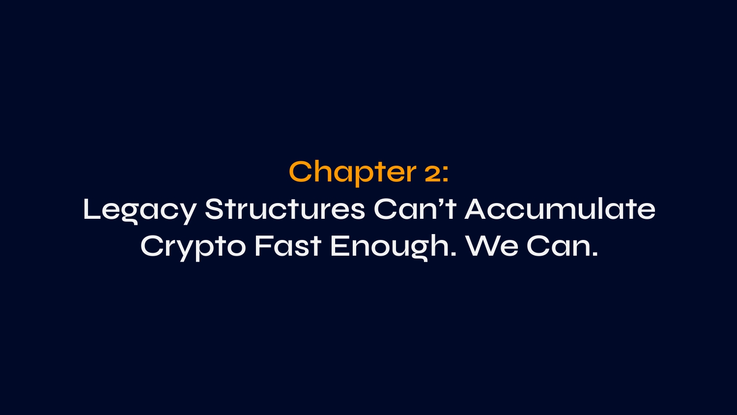 DeFi Development Corp. is the most efficient way to accumulate SOL 3 Chapter 1: The Rise of Crypto Treasury Vehicles Chapter 2: Legacy Structures Can’t Accumulate Crypto Fast Enough. We Can. Chapter 3: Solana Is the Right Asset. Now Is the Right Time. Chapter 4: DFDV Is Built to Compound – By Design and By Team Chapter 1: The Rise of Crypto Treasury Vehicles