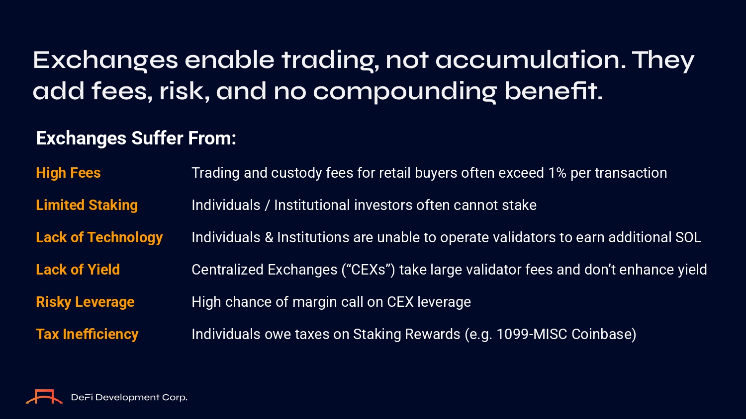 Exchanges Suffer From: High Fees Trading and custody fees for retail buyers often exceed 1% per transaction Limited Staking Individuals / Institutional investors often cannot stake Lack of Technology Individuals & Institutions are unable to operate validators to earn additional SOL Lack of Yield Centralized Exchanges (“CEXs”) take large validator fees and don’t enhance yield Risky Leverage High chance of margin call on CEX leverage Tax Inefficiency Individuals owe taxes on Staking Rewards (e.g. 1099 - MISC Coinbase) Exchanges enable trading, not accumulation. They add fees, risk, and no compounding benefit.