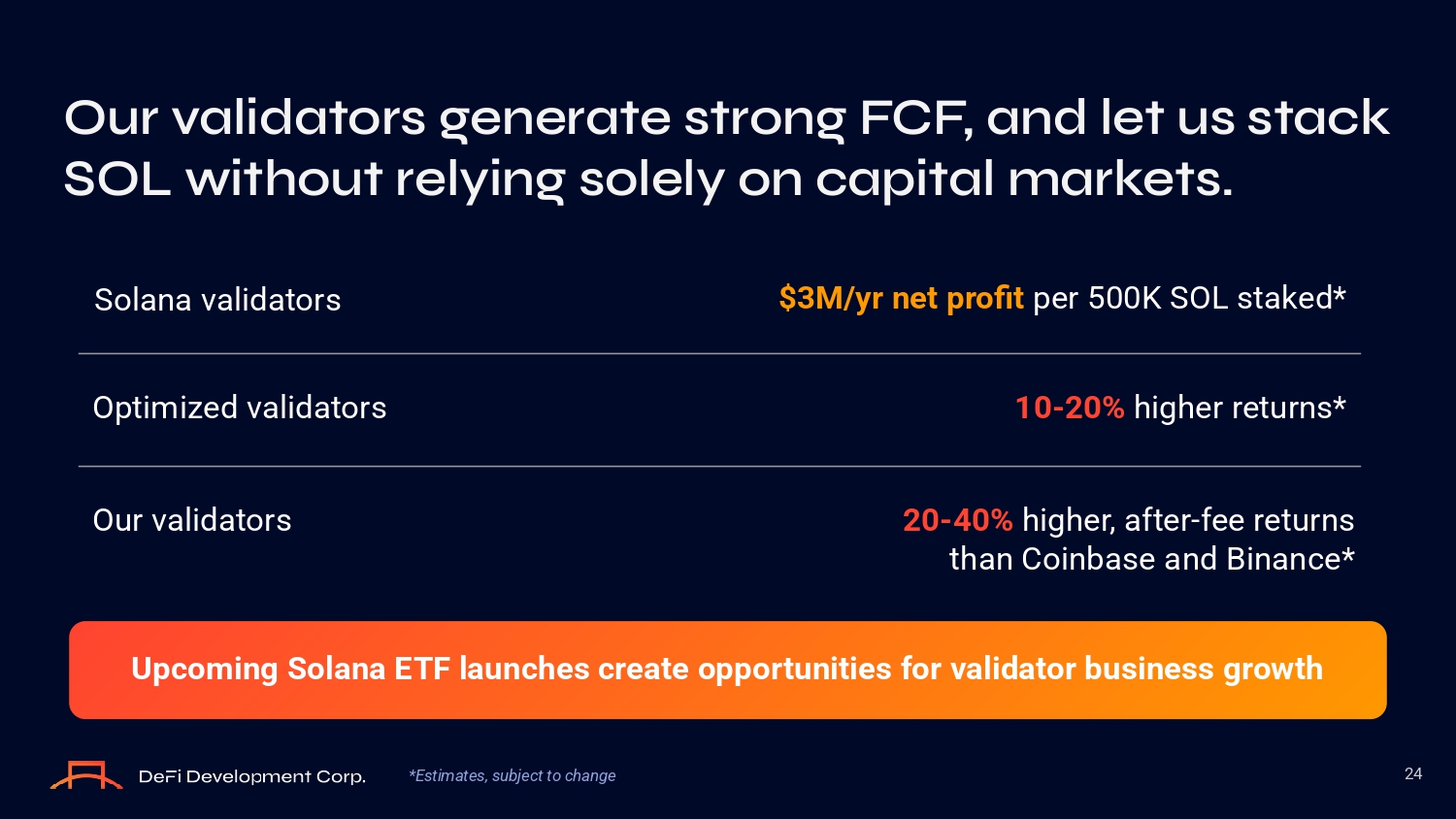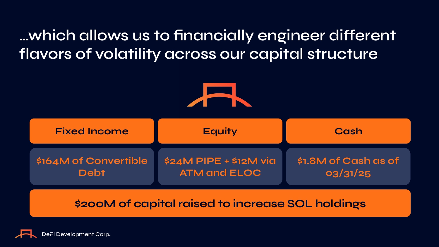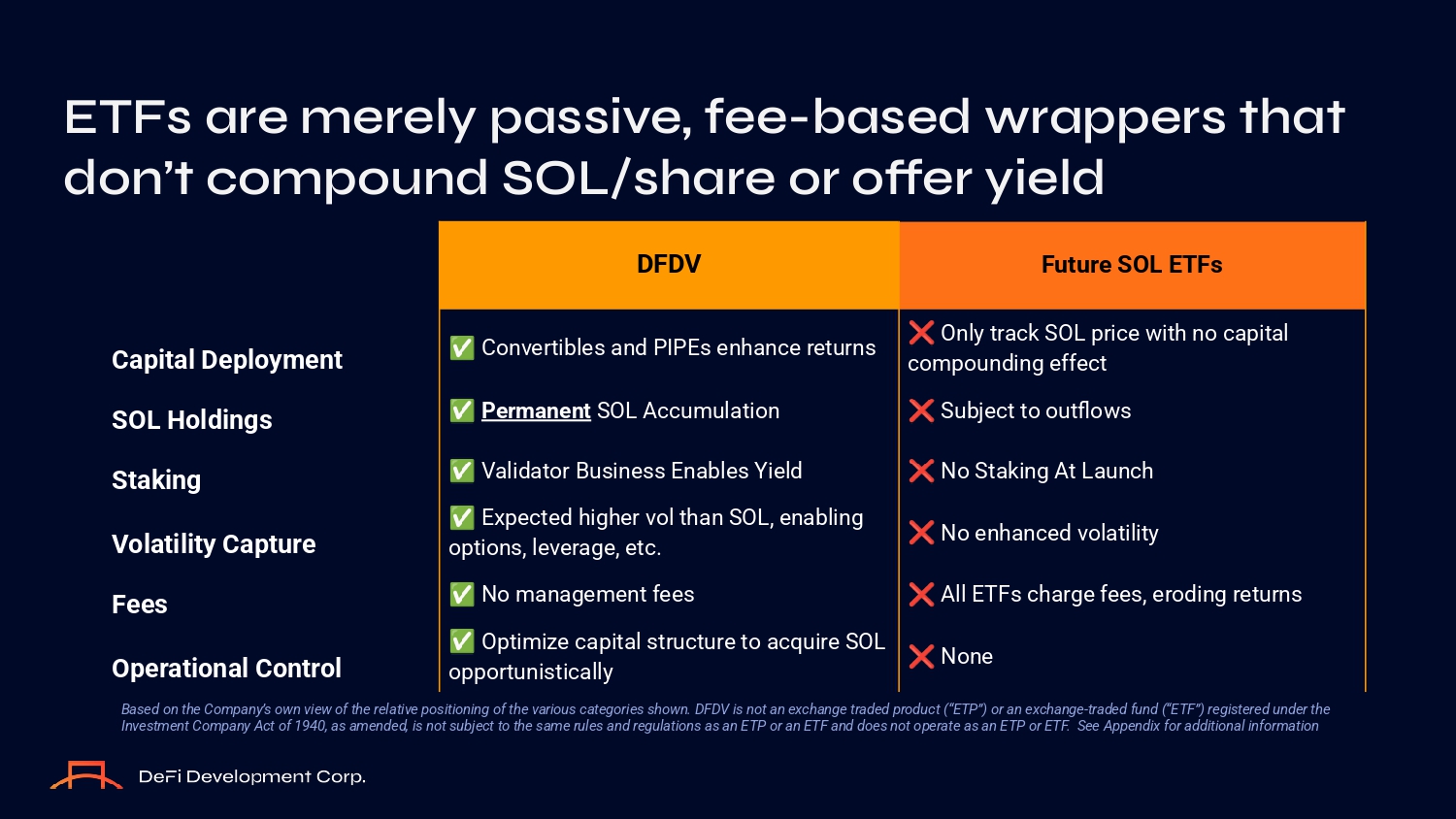 ETFs are merely passive, fee - based wrappers that don’t compound SOL/share or offer yield Capital Deployment SOL Holdings Staking Volatility Capture Fees Operational Control Future SOL ETFs DFDV Only track SOL price with no capital compounding effect Subject to outflows No Staking At Launch No enhanced volatility All ETFs charge fees, eroding returns None Convertibles and PIPEs enhance returns Permanent SOL Accumulation Validator Business Enables Yield Expected higher vol than SOL, enabling options, leverage, etc. No management fees Optimize capital structure to acquire SOL opportunistically Based on the Company’s own view of the relative positioning of the various categories shown. DFDV is not an exchange traded product (“ETP”) or an exchange - traded fund (“ETF”) registered under the Investment Company Act of 1940, as amended, is not subject to the same rules and regulations as an ETP or an ETF and does not operate as an ETP or ETF.