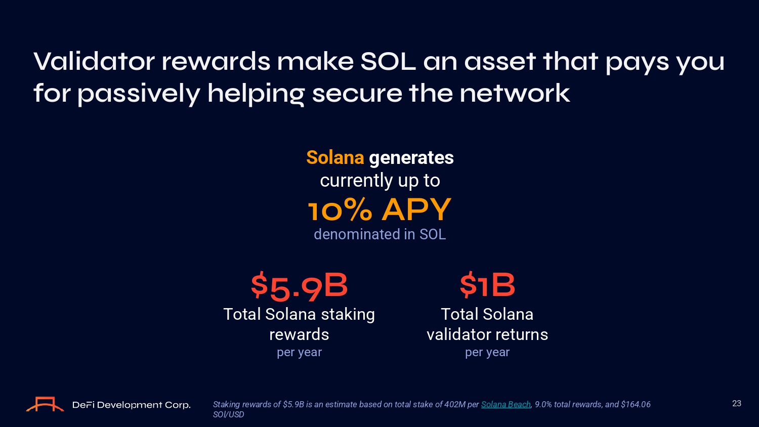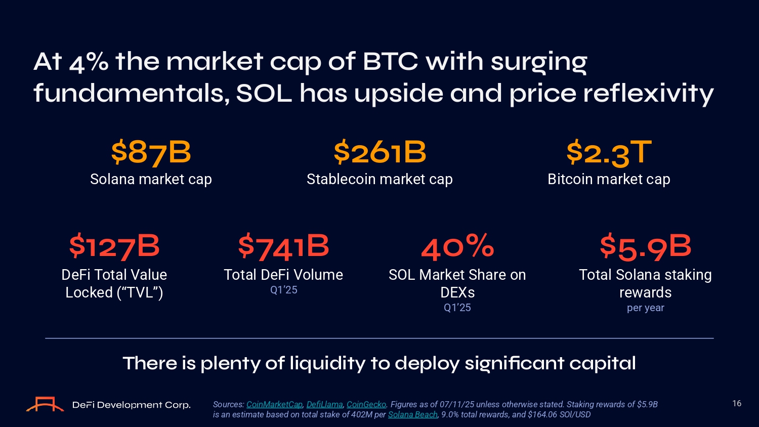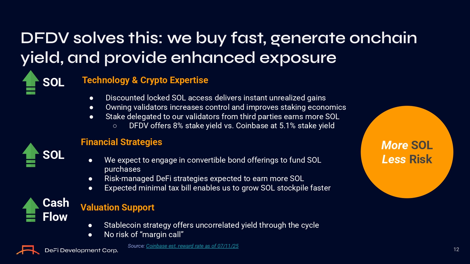 DeFi Development Corp. (Nasdaq: DFDV) has adopted a treasury policy under which the principal holding in its treasury reserve is allocated to SOL. Through this strategy, the Company provides investors with direct economic exposure to SOL, while also actively participating in the growth of the Solana ecosystem. In addition to holding and staking SOL, DeFi Development Corp. operates its own validator infrastructure, generating staking rewards and fees from delegated stake. The Company is also engaged across decentralized finance (DeFi) opportunities and continues to explore innovative ways to support and benefit from Solana’s expanding application layer.