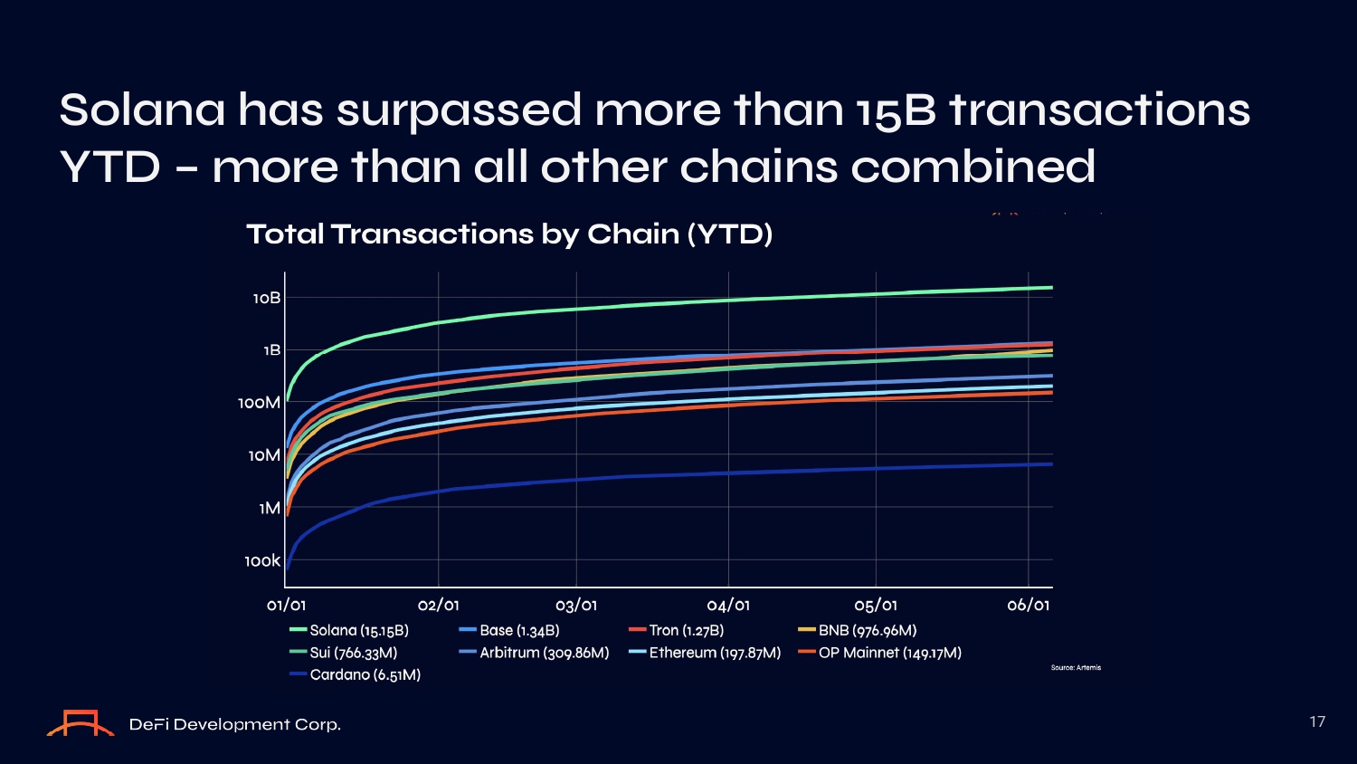 At 4% the market cap of BTC with surging fundamentals, SOL has upside and price reflexivity 16 $87B Solana market cap $261B Stablecoin market cap $2.3T Bitcoin market cap $127B DeFi Total Value Locked (“TVL”) $741B Total DeFi Volume Q1’25 40% SOL Market Share on DEXs Q1’25 There is plenty of liquidity to deploy significant capital $5.9B Total Solana staking rewards per year Sources: CoinMarketCap , DefiLlama , CoinGecko . Figures as of 07/11/25 unless otherwise stated. Staking rewards of $5.9B is an estimate based on total stake of 402M per Solana Beach , 9.0% total rewards, and $164.06 SOl/USD Solana has surpassed more than 15B transactions YTD – more than all other chains combined 17