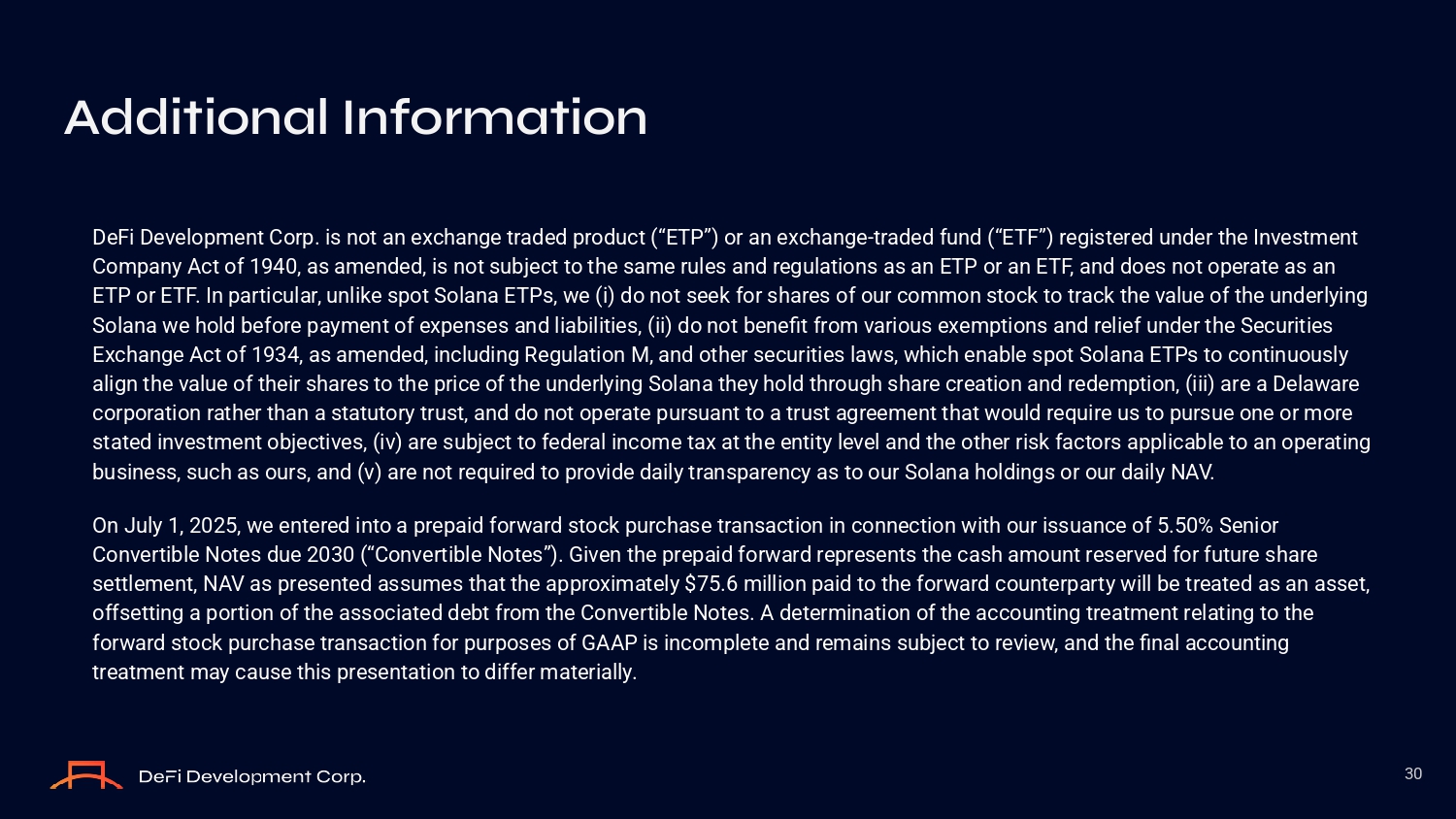 Additional Information 30 DeFi Development Corp. is not an exchange traded product (“ETP”) or an exchange - traded fund (“ETF”) registered under the Investment Company Act of 1940, as amended, is not subject to the same rules and regulations as an ETP or an ETF, and does not operate as an ETP or ETF. In particular, unlike spot Solana ETPs, we (i) do not seek for shares of our common stock to track the value of the underlying Solana we hold before payment of expenses and liabilities, (ii) do not benefit from various exemptions and relief under the Securities Exchange Act of 1934, as amended, including Regulation M, and other securities laws, which enable spot Solana ETPs to continuously align the value of their shares to the price of the underlying Solana they hold through share creation and redemption, (iii) are a Delaware corporation rather than a statutory trust, and do not operate pursuant to a trust agreement that would require us to pursue one or more stated investment objectives, (iv) are subject to federal income tax at the entity level and the other risk factors applicable to an operating business, such as ours, and (v) are not required to provide daily transparency as to our Solana holdings or our daily NAV. On July 1, 2025, we entered into a prepaid forward stock purchase transaction in connection with our issuance of 5.50% Senior Convertible Notes due 2030 (“Convertible Notes”). Given the prepaid forward represents the cash amount reserved for future share settlement, NAV as presented assumes that the approximately $75.6 million paid to the forward counterparty will be treated as an asset, offsetting a portion of the associated debt from the Convertible Notes. A determination of the accounting treatment relating to the forward stock purchase transaction for purposes of GAAP is incomplete and remains subject to review, and the final accounting treatment may cause this presentation to differ materially.