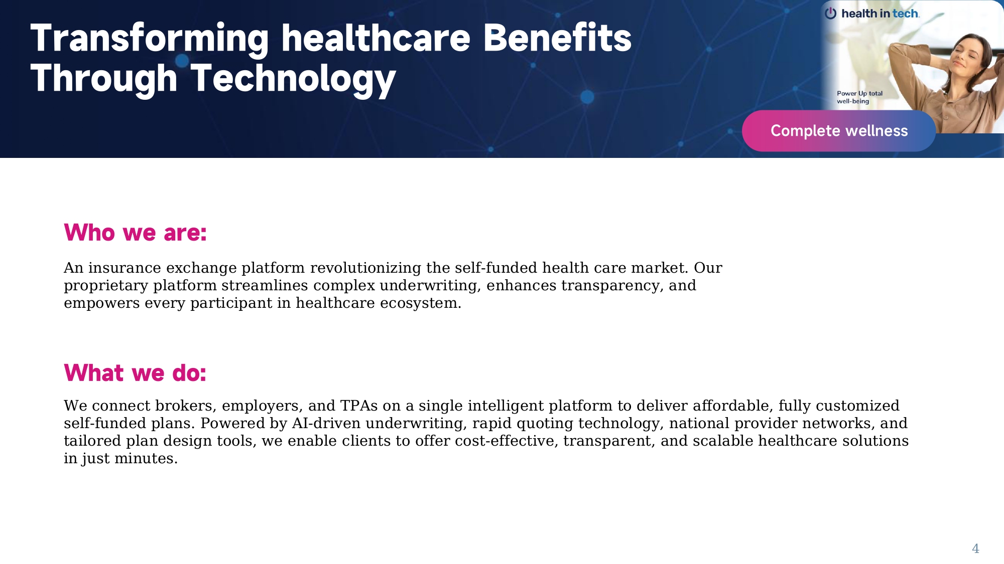 Who we are: An insurance exchange platform revolutionizing the self - funded health care market. Our proprietary platform streamlines complex underwriting, enhances transparency, and empowers every participant in healthcare ecosystem. What we do: We connect brokers, employers, and TPAs on a single intelligent platform to deliver affordable, fully customized self - funded plans. Powered by AI - driven underwriting, rapid quoting technology, national provider networks, and tailored plan design tools, we enable clients to offer cost - effective, transparent, and scalable healthcare solutions in just minutes.