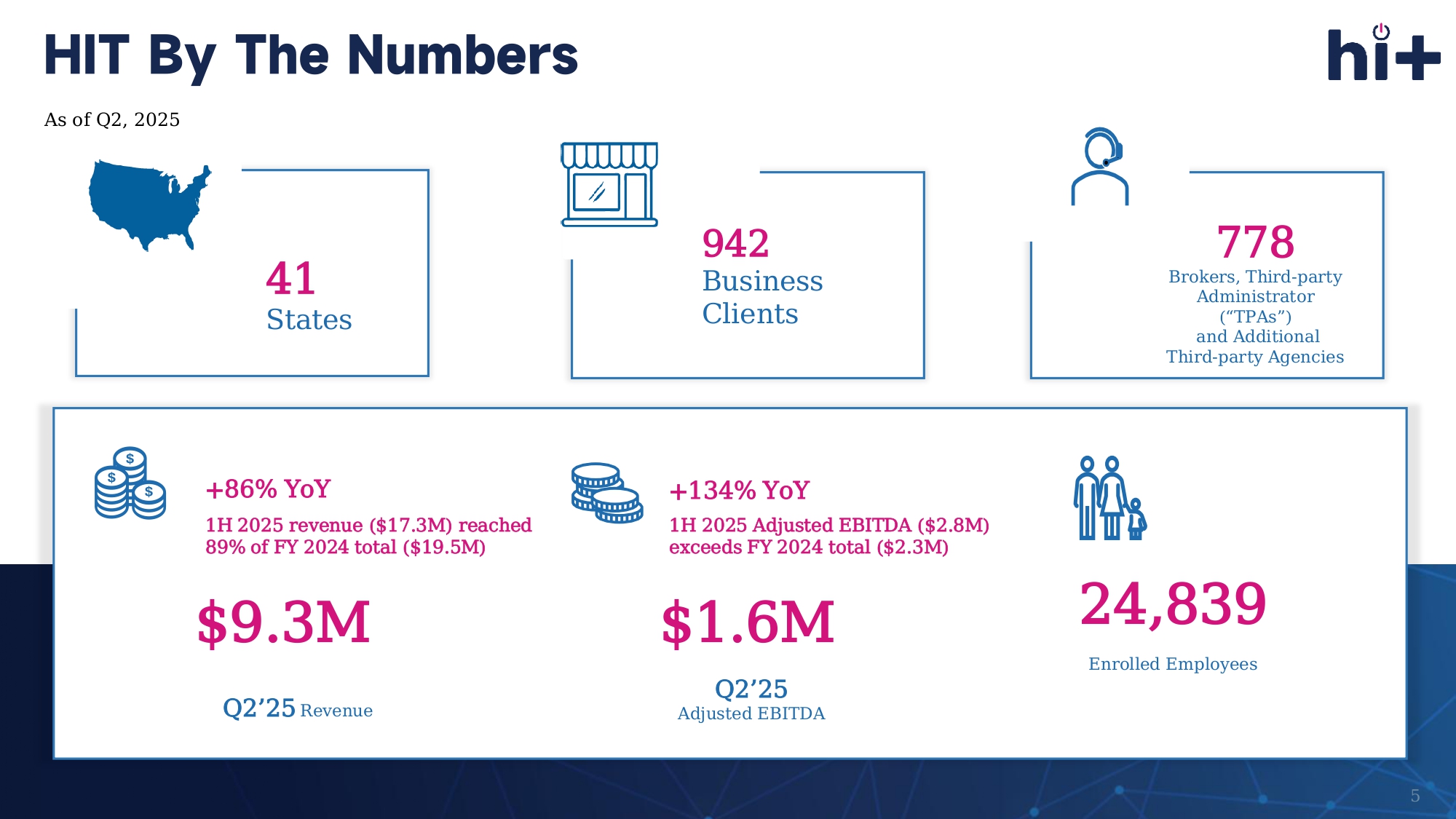 Transforming healthcare Benefits Through Technology Complete wellness 4 HIT By The Numbers $9.3M Q2’25 Revenue $1.6M Q2’25 Adjusted EBITDA 24,839 Enrolled Employees 41 States 942 Business Clients As of Q2, 2025 +86% YoY 1H 2025 revenue ($17.3M) reached 89% of FY 2024 total ($19.5M) +134% YoY 1H 2025 Adjusted EBITDA ($2.8M) exceeds FY 2024 total ($2.3M) 778 Brokers, Third - party Administrator (“TPAs”) and Additional Third - party Agencies 5 U.S. Healthcare Industry 1 $1.7T $4.9T $6.6T U.S Health Insurance 2 . 1. 2. https://www.cms.gov/data - research/statistics - trends - and - reports/national - health - expenditure - data/historical https:// www.statista.com/outlook/fmo/insurances/non - life - insurances/health - insurance/united - states A $6.6 Trillion Market Primed for Disruption Total Addressable Market 6 The Market is Unimaginably Large