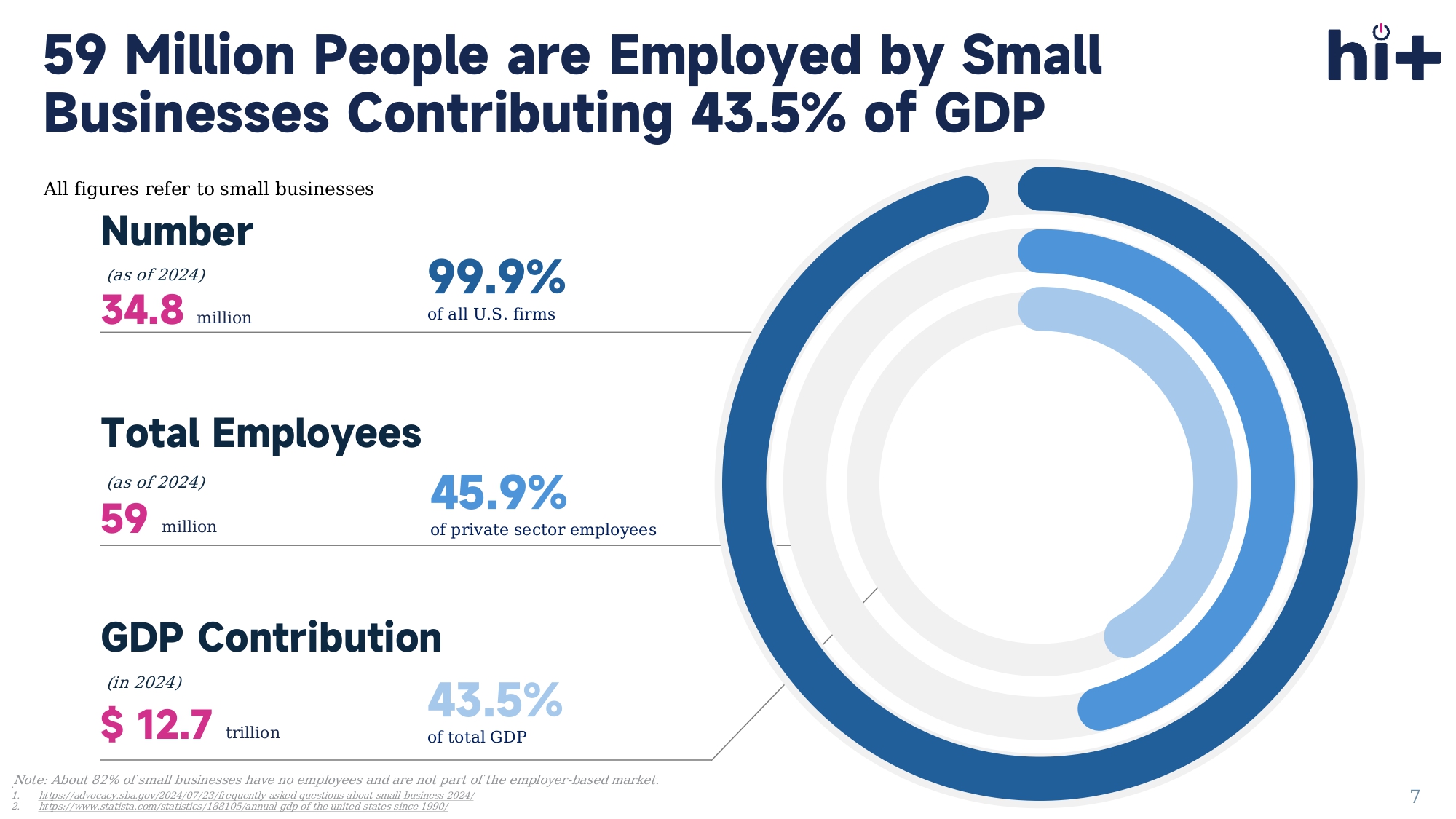 45.9% of private sector employees 43.5% of total GDP 99.9% of all U.S. firms (as of 2024) 34.8 million Total Employees (as of 2024) 59 million GDP Contribution (in 2024) $ 12.7 trillion All figures refer to small businesses Number 59 Million People are Employed by Small Businesses Contributing 43.5% of GDP 7 1. 2. https://advocacy.sba.gov/2024/07/23/frequently - asked - questions - about - small - business - 2024/ https://www.statista.com/statistics/188105/annual - gdp - of - the - united - states - since - 1990/ . Note: About 82% of small businesses have no employees and are not part of the employer - based market.
