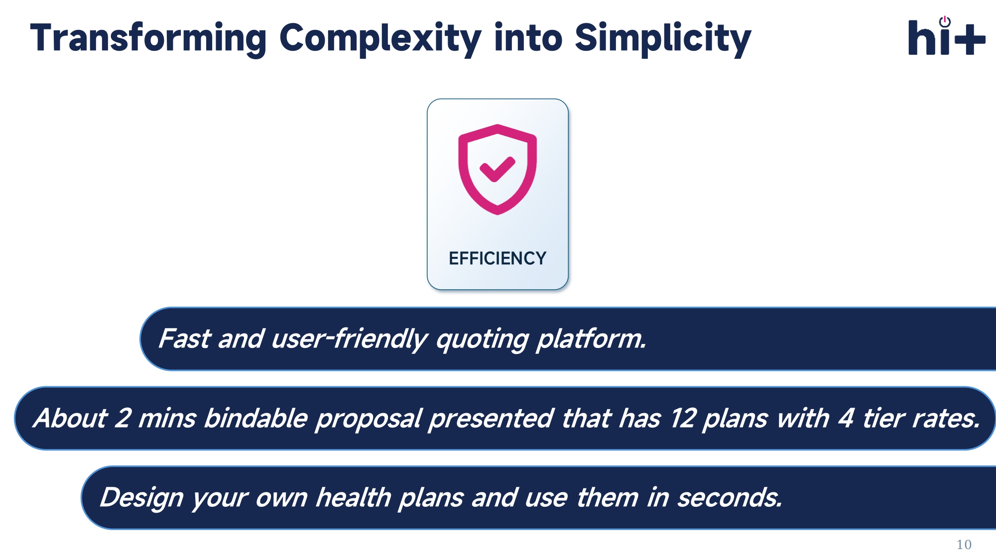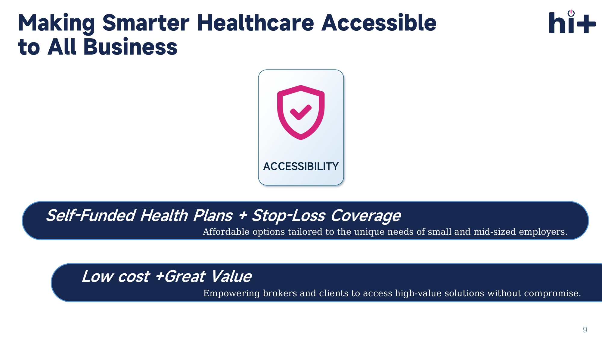 Low cost +Great Value Empowering brokers and clients to access high - value solutions without compromise. ACCESSIBILITY Making Smarter Healthcare Accessible to All Business 9 Fast and user - friendly quoting platform.
