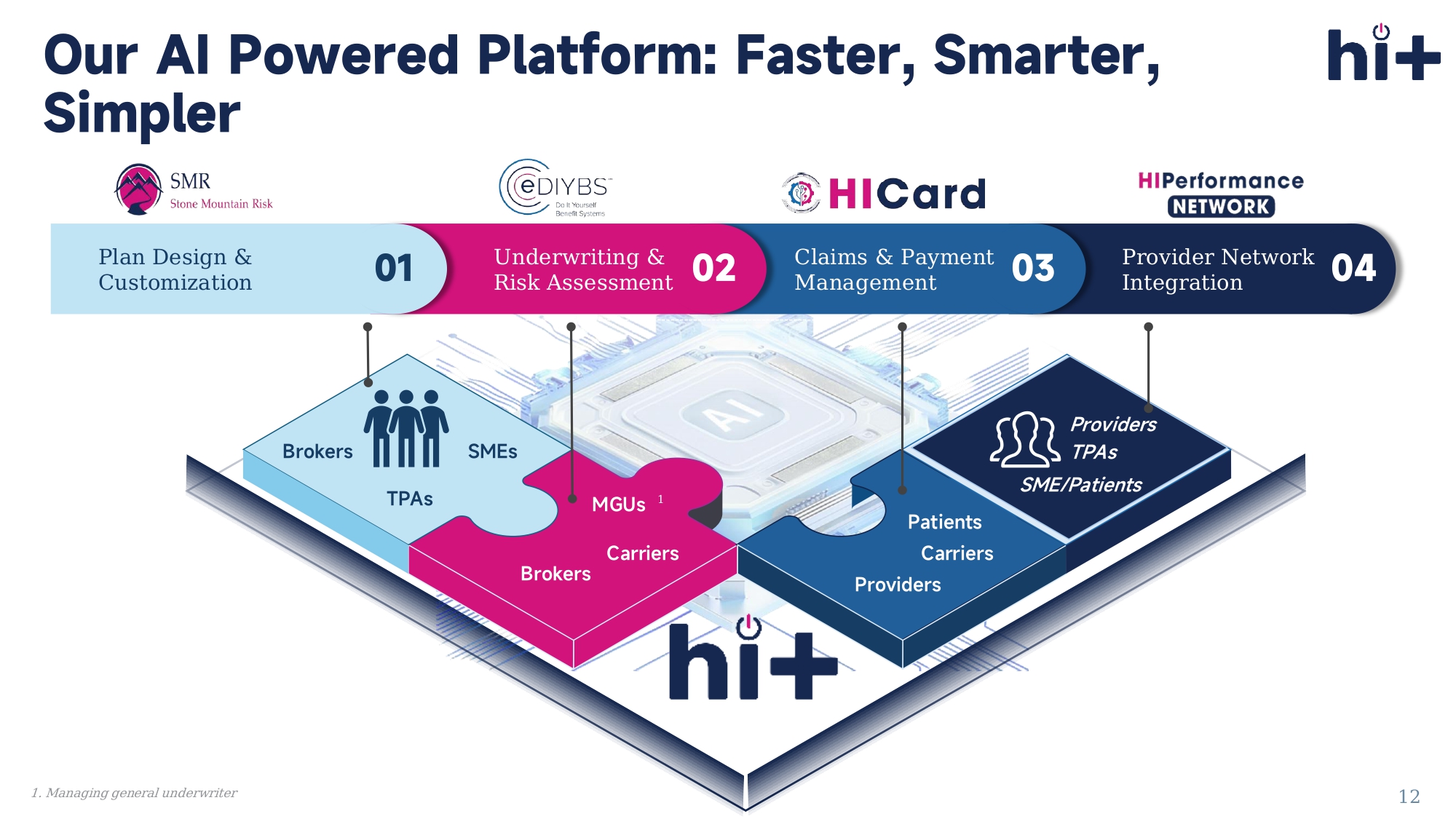 Managing general underwriter 12 Our AI Powered Platform: Faster, Smarter, Simpler Plan Design & Customization Artificial Intelligence is reshaping healthcare by improving access, lowering costs, streamlining operations, and enabling more personalized, patient - centric care.