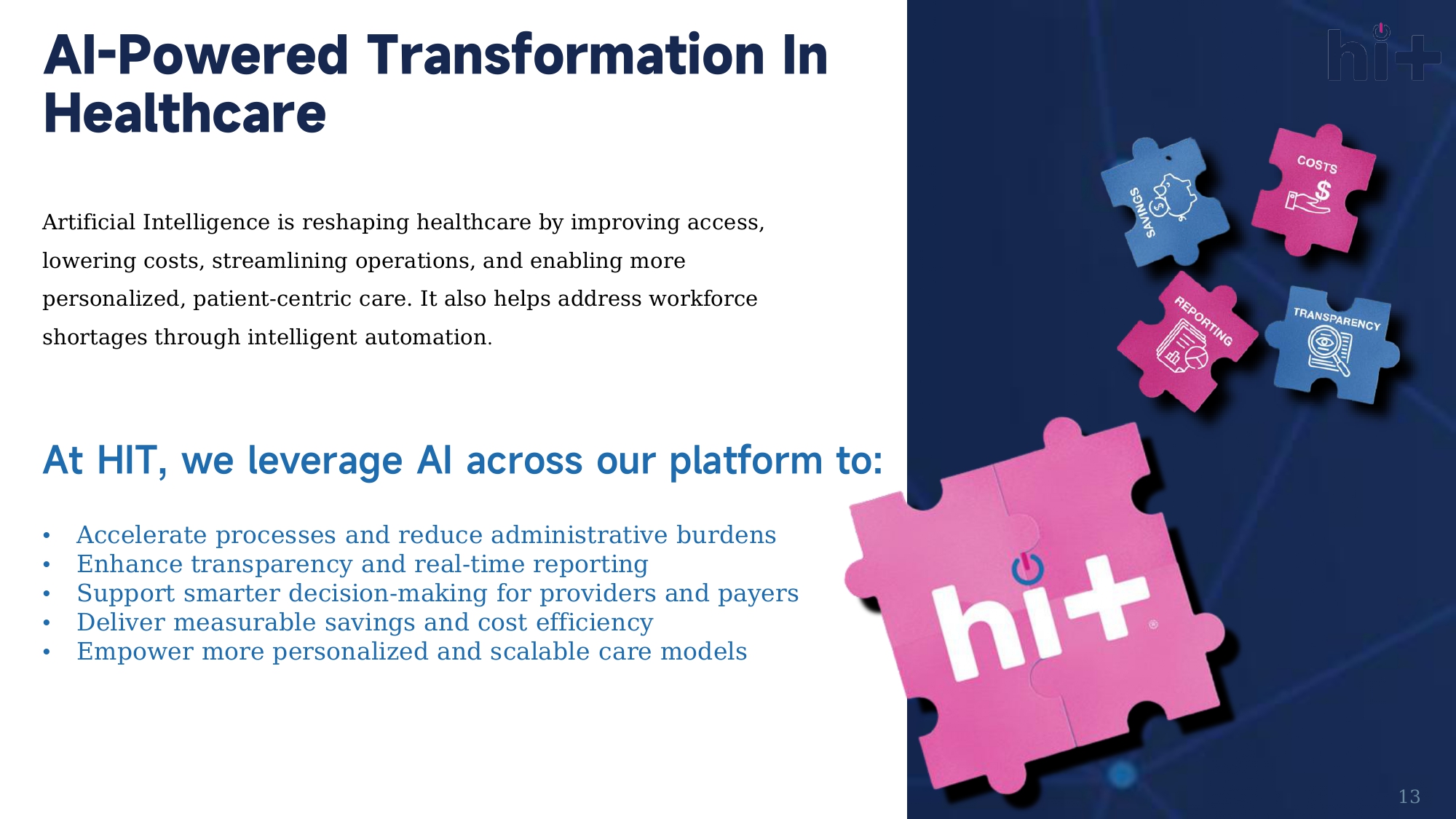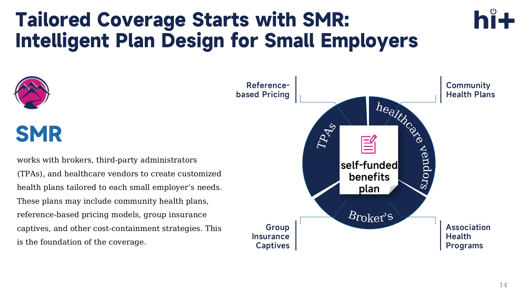 It also helps address workforce shortages through intelligent automation . At HIT, we leverage AI across our platform to: • Accelerate processes and reduce administrative burdens • Enhance transparency and real - time reporting • Support smarter decision - making for providers and payers • Deliver measurable savings and cost efficiency • Empower more personalized and scalable care models AI - Powered Transformation In Healthcare 13 self - funded benefits plan Reference - based Pricing Group Insurance Captives Community Health Plans Association Health Programs SMR works with brokers, third - party administrators (TPAs), and healthcare vendors to create customized health plans tailored to each small employer’s needs.