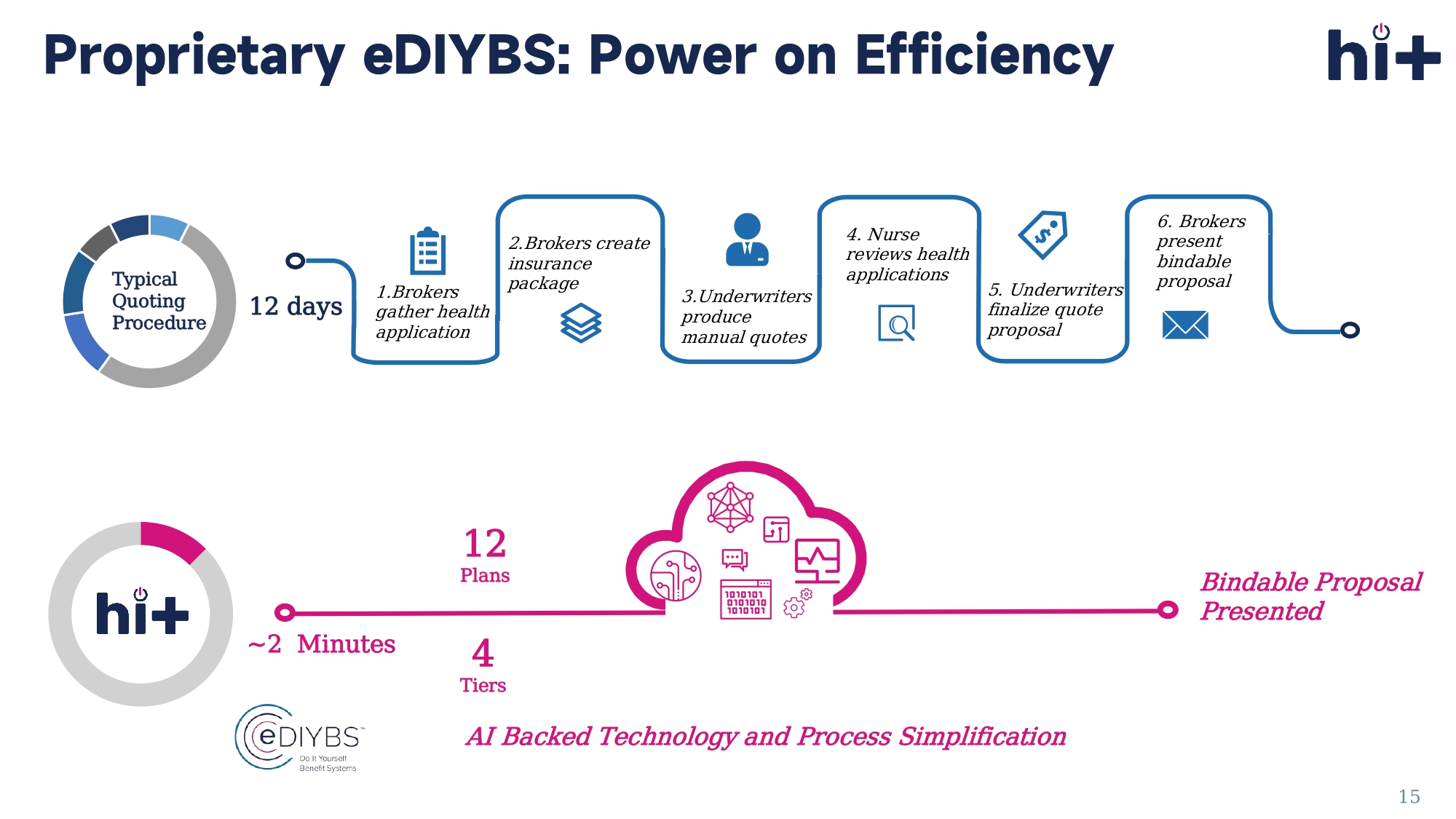 These plans may include community health plans, reference - based pricing models, group insurance captives, and other cost - containment strategies. This is the foundation of the coverage. Tailored Coverage Starts with SMR: Intelligent Plan Design for Small Employers 14 12 days Typical Quoting Procedure Bindable Proposal Presented AI Backed Technology and Process Simplification ~2 Minutes 4 Tiers 12 Plans 1.Brokers gather health application 2.Brokers create insurance package 3.Underwriters produce manual quotes 4.