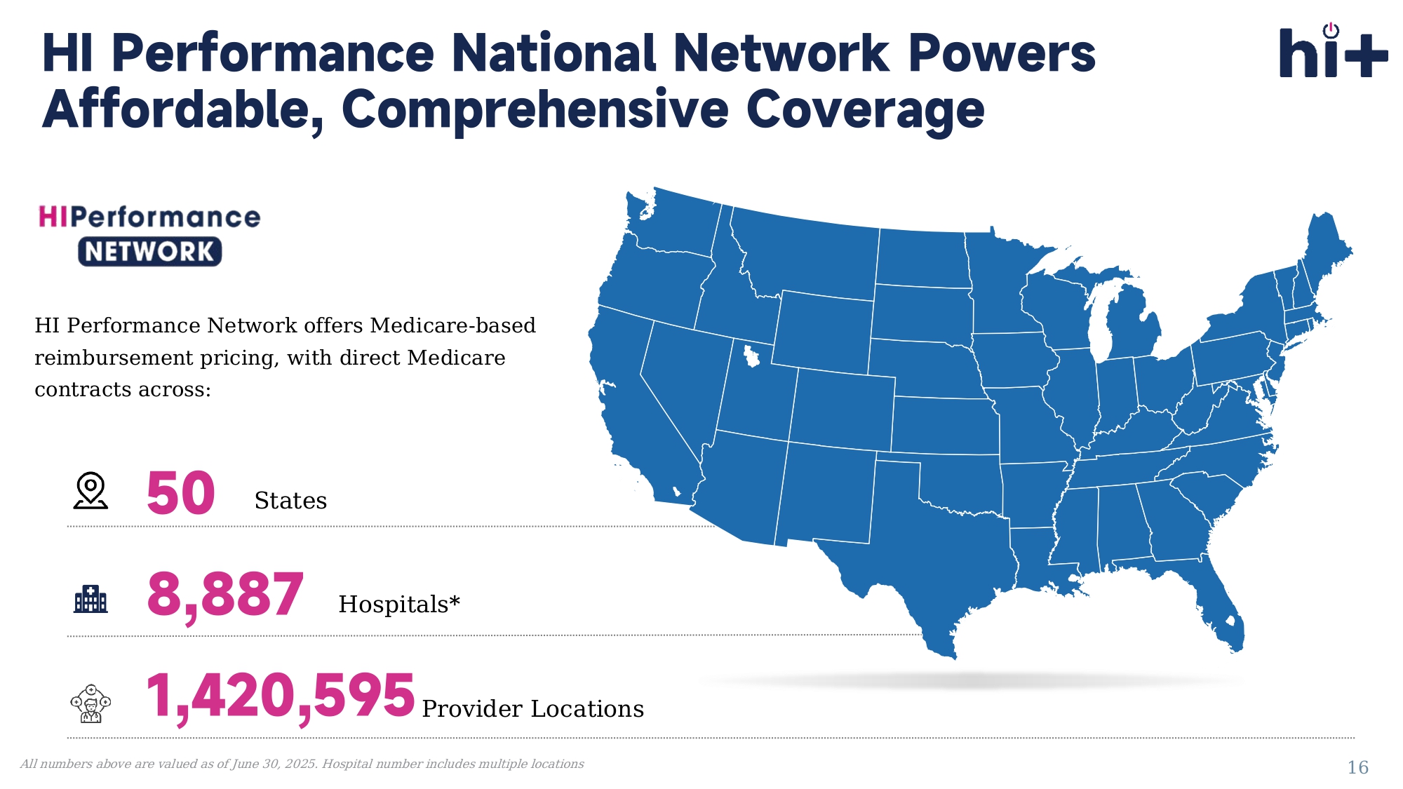 Nurse reviews health applications 5. Underwriters finalize quote proposal 6. Brokers present bindable proposal Proprietary eDIYBS: Power on Efficiency 15 HI Performance Network offers Medicare - based reimbursement pricing, with direct Medicare contracts across: 50 States 8,887 Hospitals* 1,420,595 Provider Locations All numbers above are valued as of June 30, 2025.