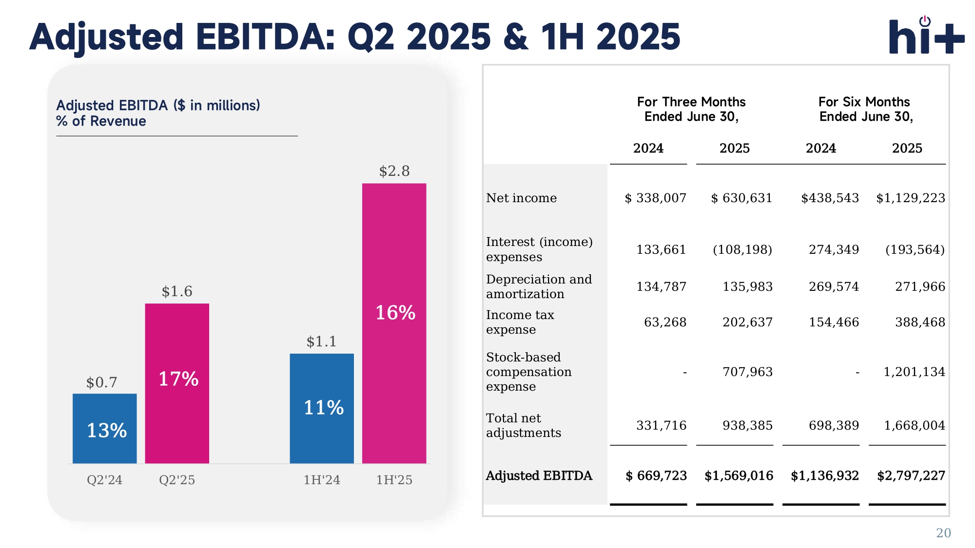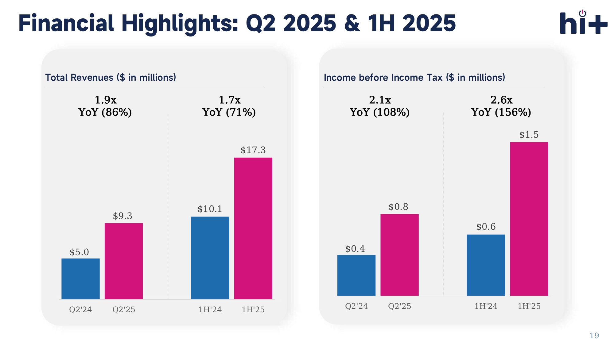 Hospital number includes multiple locations 16 HI Performance National Network Powers Affordable, Comprehensive Coverage Revenue Composition Revenues from underwriting modelling Revenues from Program Fee as % of premiums received as the carrier Key Growth Driver The number of enrolled employees from employers purchased healthcare plan with stoploss medical insurance A flat fee per employee per month (PEPM) Revenue Composition and Key Growth Driver 17 $0.4 $0.8 $0.6 $1.5 Q2'24 Q2'25 1H'24 1H'25 Total Revenues ($ in millions) Income before Income Tax ($ in millions) Financial Highlights: Q2 2025 & 1H 2025 2.6x YoY (156%) 2.1x YoY (108%) 1.9x YoY (86%) 1.7x YoY (71%) 19 $5.0 $9.3 $10.1 $17.3 Q2'24 Q2'25 1H'24 1H'25