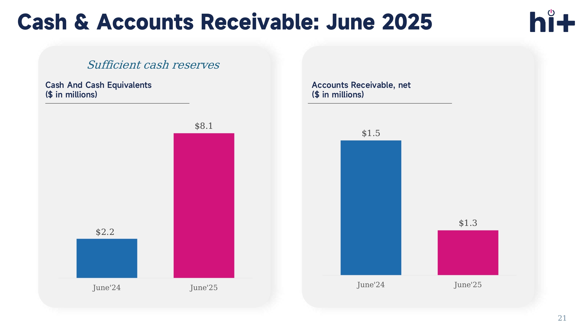 For Six Months Ended June 30, For Three Months Ended June 30, 2025 2024 2025 2024 $1,129,223 $438,543 $ 630,631 $ 338,007 Net income (193,564) 274,349 (108,198) 133,661 Interest (income) expenses 271,966 269,574 135,983 134,787 Depreciation and amortization 388,468 154,466 202,637 63,268 Income tax expense 1,201,134 - 707,963 - Stock - based compensation expense 1,668,004 698,389 938,385 331,716 Total net adjustments $2,797,227 $1,136,932 $1,569,016 $ 669,723 Adjusted EBITDA $0.7 $1.6 $1.1 $2.8 Q2'24 Q2'25 1H'24 1H'25 Adjusted EBITDA ($ in millions) % of Revenue 13% 17% Adjusted EBITDA: Q2 2025 & 1H 2025 20 11% 16% $2.2 $8.1 June'24 June'25 $1.5 $1.3 June'24 June'25 Accounts Receivable, net ($ in millions) Sufficient cash reserves Cash And Cash Equivalents ($ in millions) Cash & Accounts Receivable: June 2025 21