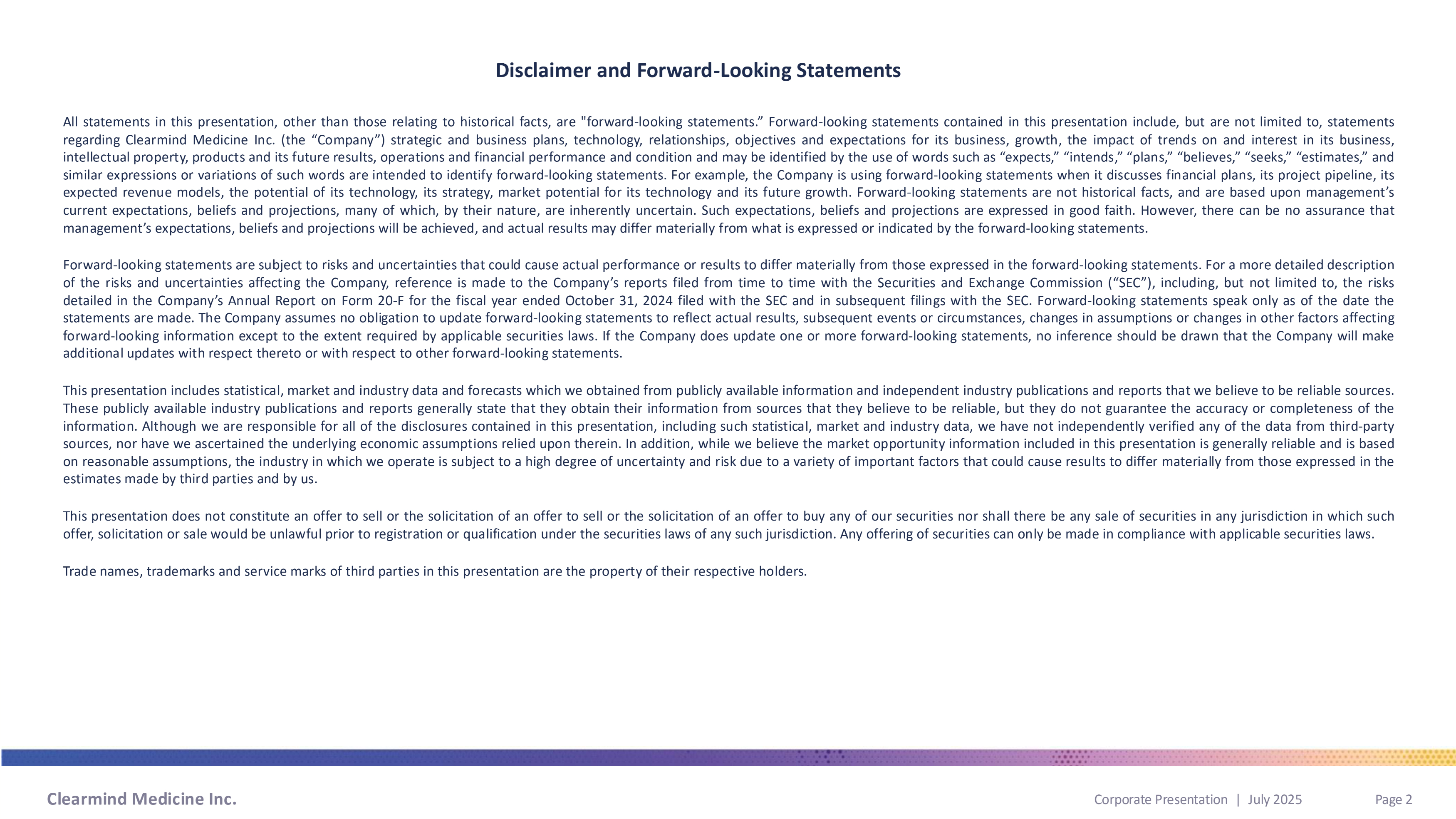 Clearmind Medicine Inc. Page 2 All statements in this presentation, other than those relating to historical facts, are "forward-looking statements . ” Forward - looking statements contained in this presentation include, but are not limited to, statements regarding Clearmind Medicine Inc . (the “Company”) strategic and business plans, technology, relationships, objectives and expectations for its business, growth, the impact of trends on and interest in its business, intellectual property, products and its future results, operations and financial performance and condition and may be identified by the use of words such as “expects,” “intends,” “plans,” “believes,” “seeks,” “estimates,” and similar expressions or variations of such words are intended to identify forward - looking statements . For example, the Company is using forward - looking statements when it discusses financial plans, its project pipeline, its expected revenue models, the potential of its technology, its strategy, market potential for its technology and its future growth . Forward - looking statements are not historical facts, and are based upon management’s current expectations, beliefs and projections, many of which, by their nature, are inherently uncertain . Such expectations, beliefs and projections are expressed in good faith . However, there can be no assurance that management’s expectations, beliefs and projections will be achieved, and actual results may differ materially from what is expressed or indicated by the forward - looking statements . Forward - looking statements are subject to risks and uncertainties that could cause actual performance or results to differ materially from those expressed in the forward - looking statements . For a more detailed description of the risks and uncertainties affecting the Company, reference is made to the Company’s reports filed from time to time with the Securities and Exchange Commission (“SEC”), including, but not limited to, the risks detailed in the Company’s Annual Report on Form 20 - F for the fiscal year ended October 31 , 2024 filed with the SEC and in subsequent filings with the SEC . Forward - looking statements speak only as of the date the statements are made . The Company assumes no obligation to update forward - looking statements to reflect actual results, subsequent events or circumstances, changes in assumptions or changes in other factors affecting forward - looking information except to the extent required by applicable securities laws . If the Company does update one or more forward - looking statements, no inference should be drawn that the Company will make additional updates with respect thereto or with respect to other forward - looking statements . This presentation includes statistical, market and industry data and forecasts which we obtained from publicly available information and independent industry publications and reports that we believe to be reliable sources . These publicly available industry publications and reports generally state that they obtain their information from sources that they believe to be reliable, but they do not guarantee the accuracy or completeness of the information . Although we are responsible for all of the disclosures contained in this presentation, including such statistical, market and industry data, we have not independently verified any of the data from third - party sources, nor have we ascertained the underlying economic assumptions relied upon therein . In addition, while we believe the market opportunity information included in this presentation is generally reliable and is based on reasonable assumptions, the industry in which we operate is subject to a high degree of uncertainty and risk due to a variety of important factors that could cause results to differ materially from those expressed in the estimates made by third parties and by us . This presentation does not constitute an offer to sell or the solicitation of an offer to sell or the solicitation of an offer to buy any of our securities nor shall there be any sale of securities in any jurisdiction in which such offer, solicitation or sale would be unlawful prior to registration or qualification under the securities laws of any such jurisdiction. Any offering of securities can only be made in compliance with applicable securities laws. Trade names, trademarks and service marks of third parties in this presentation are the property of their respective holders.