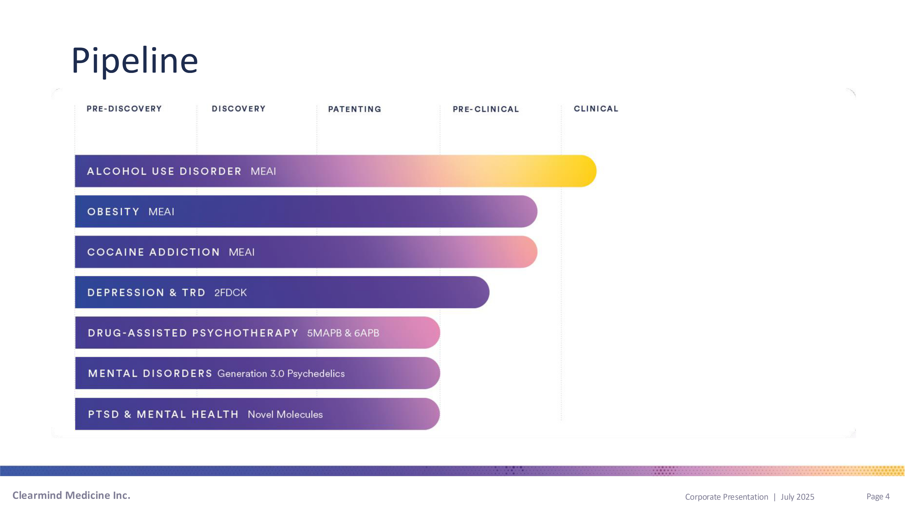 Disclaimer and Forward - Looking Statements Corporate Presentation | July 2025 About Clearmind Clearmind Medicine Inc. Corporate Presentation | July 2025 Why Psychedelics? Psychedelic compounds are increasingly being studied and many believe represent the future for treatment of a variety of mental health disorders. Clearmind’s solutions for addiction, especially alcoholism and obesity, hold the potential to better the lives of millions around the world. Nasdaq public company NASDAQ:CMND FSE:CWY0 Pharmaceutical company developing patent - protected psychedelic medicines to solve widespread mental health disorders Initially targeting addiction market, including alcoholism and obesity IND clearance from FDA Phase I/Iia Clinical trials commenced in 4 sites worldwide 19 patents families. 31 granted in the USA and other major jurisdictions Partnership with leading universities & KOLs Page 3 Pipeline Clearmind Medicine Inc. Page 4 Corporate Presentation | July 2025
