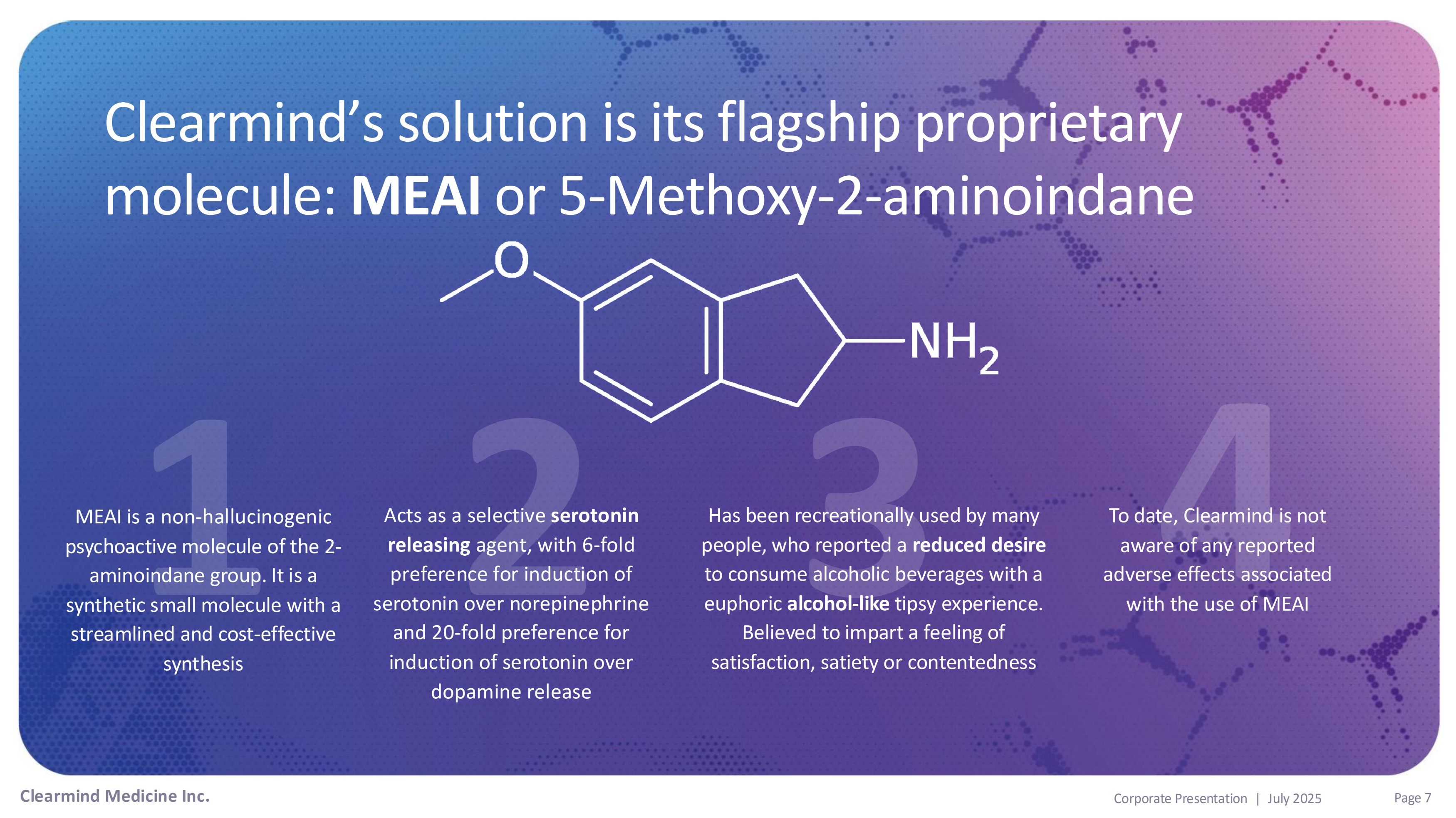 The yearly cost of excessive alcohol use in the US was almost $250 billion in 2010 https://pubmed.ncbi.nlm.nih.gov/26477807/ $28 billion of which has been accounted for as healthcare costs https:// www.cdc.gov/alcohol/images/real_cost_alcohol_use.jpg Alcohol Use Disorder (AUD) among US Veterans Treatment Gap Clearmind Medicine Inc. Page 6 Corporate Presentation | July 2025 Among those diagnosed with AUD annually (300,000+ cases), only about one - third receive any VA specialty addiction treatment. https:// www.hsrd.research.va.gov/publications/forum/spring20/default.c fm?ForumMenu=spring20 - 2 Cost VA's inpatient substance - use – treatment daily cost is approximately $5,228/day as of 2024. https:// www.herc.research.va.gov/include/page.asp?id=inpatient VA studies suggest that 10% of American veterans meet the criteria for AUD. RAND Epstein Family Veterans Policy Research Institute. https:// www.rand.org/pubs/infographics/IGA1363 - 4.html About 11% of veterans using VA healthcare have a substance use disorder. Among veterans who have Substance Use Disorder, more than 80% (nearly 900,000 ) abuse alcohol. Substance Abuse and Mental Health Services Administration. (n.d.). 2018 National Survey on Drug Use and Health: Veterans. Post - 9/11 8.0% of Post - 9/11 Veterans experience AUD. 36.5% of Post - 9/11 Veterans report past - month binge drinking. RAND Epstein Family Veterans Policy Research Institute. https:// www.rand.org/pubs/infographics/IGA1363 - 4.html Clearmind’s solution is its flagship proprietary molecule: MEAI or 5 - Methoxy - 2 - aminoindane MEAI is a non - hallucinogenic psychoactive molecule of the 2 - aminoindane group.