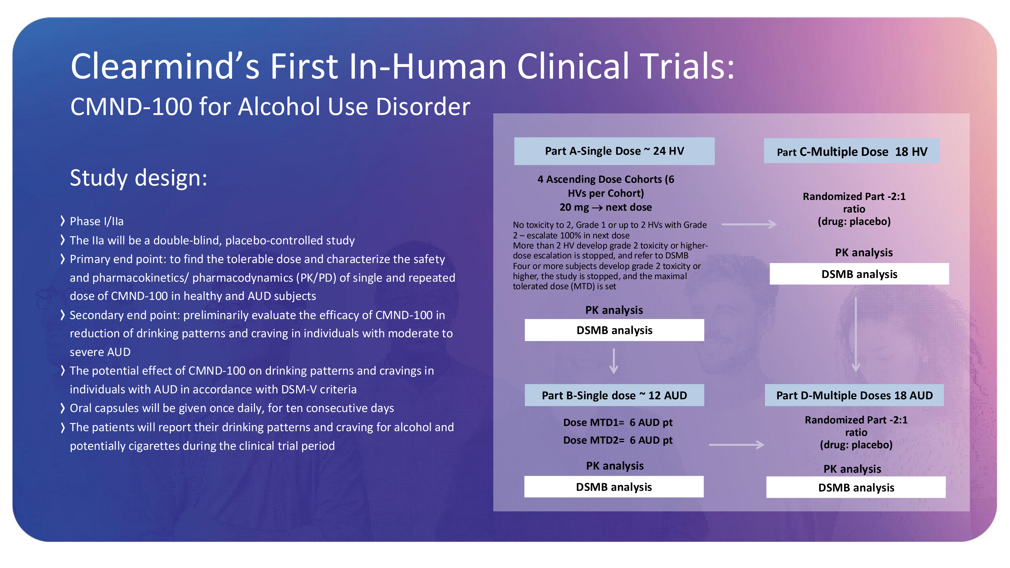 Clearmind’s First In - Human Clinical Trials: CMND - 100 for Alcohol Use Disorder Study design: Phase I/IIa The IIa will be a double - blind, placebo - controlled study Primary end point: to find the tolerable dose and characterize the safety and pharmacokinetics/ pharmacodynamics (PK/PD) of single and repeated dose of CMND - 100 in healthy and AUD subjects Secondary end point: preliminarily evaluate the efficacy of CMND - 100 in reduction of drinking patterns and craving in individuals with moderate to severe AUD The potential effect of CMND - 100 on drinking patterns and cravings in individuals with AUD in accordance with DSM - V criteria Oral capsules will be given once daily, for ten consecutive days The patients will report their drinking patterns and craving for alcohol and potentially cigarettes during the clinical trial period Part A - Single Dose ~ 24 HV PK analysis DSMB analysis Part B - Single dose ~ 12 AUD Dose MTD1= 6 AUD pt Dose MTD2= 6 AUD pt PK analysis DSMB analysis Part C - Multiple Dose 18 HV Randomized Part - 2:1 ratio (drug: placebo) PK analysis DSMB analysis Part D - Multiple Doses 18 AUD 4 Ascending Dose Cohorts (6 HVs per Cohort) 20 mg next dose No toxicity to 2, Grade 1 or up to 2 HVs with Grade 2 – escalate 100% in next dose More than 2 HV develop grade 2 toxicity or higher - dose escalation is stopped, and refer to DSMB Four or more subjects develop grade 2 toxicity or higher, the study is stopped, and the maximal tolerated dose (MTD) is set Randomized Part - 2:1 ratio (drug: placebo) PK analysis DSMB analysis Ongoing clinical programs: Clinical sites Clearmind Medicine Inc. Page 10 Corporate Presentation | July 2025 CMND - 100 for Alcohol Use Disorder Johns Hopkins School of Medicine Baltimore, MD, USA. Principal investigators: Jennifer Ellis, PhD and Professor Eric Strain, MD. Yale School of Medicine, Department of Psychiatry New Haven, CT, USA. Principal investigator: Anahita Bassir Nia, MD. Christopher Pittenger, MD, PhD, Director, Clinical Neuroscience Research Unit, Psychiatry; Director, Yale Program for Psychedelic Science, Psychiatry. Hadassa - University Medical Center Jerusalem, Israel Principal Investigator: Prof. Joseph Karko , MD , Director of the Center for Clinical Research. Tel Aviv Sourasky Medical Center Tel - Aviv, Israel Principal Investigator: Prof. David Zeltser, Deputy Director, R&D and Innovation. Director, Internal Medicine Division