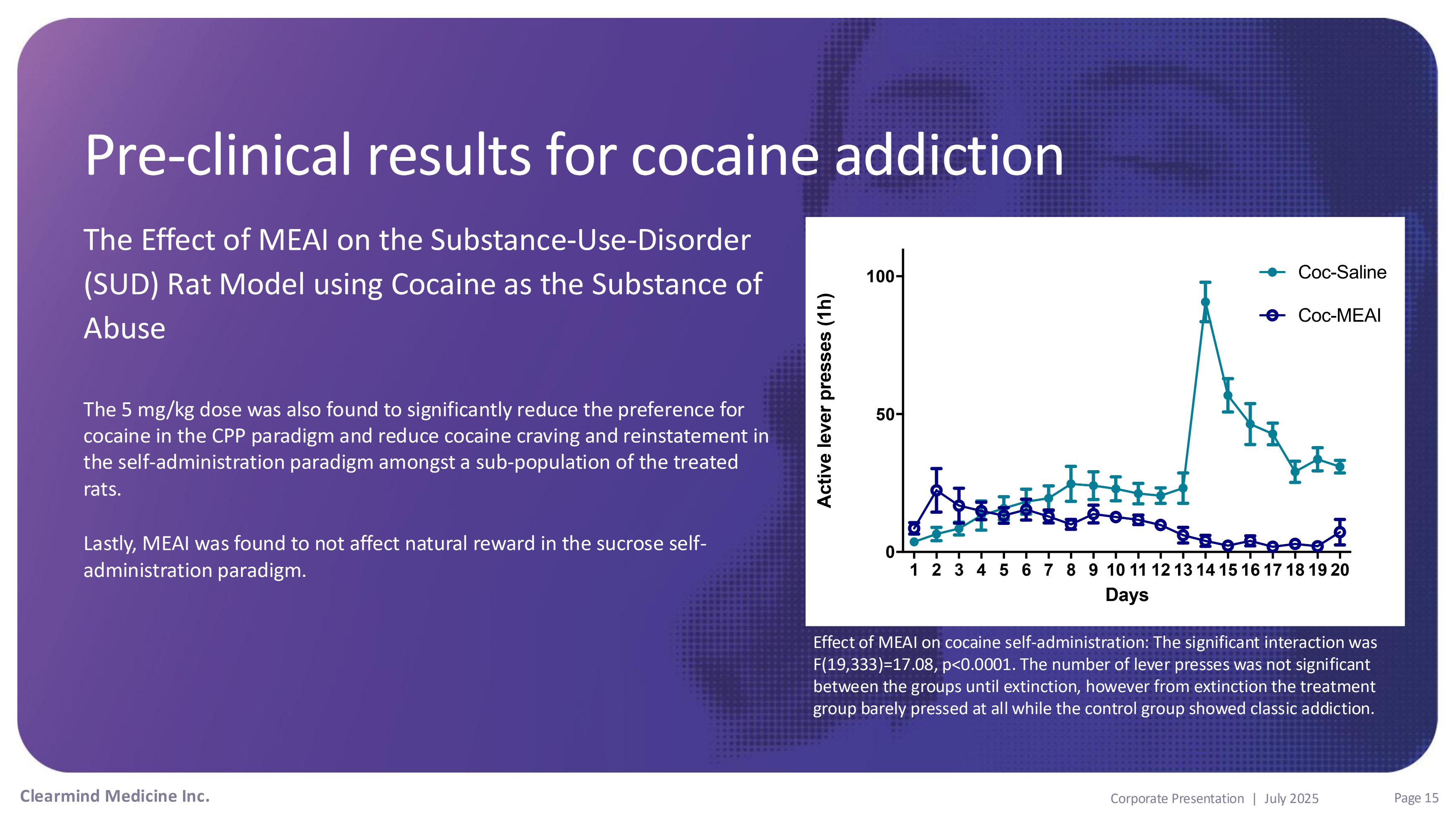 Page 14 Corporate Presentation | July 2025 Pre - clinical results for cocaine addiction The Effect of MEAI on the Substance - Use - Disorder (SUD) Rat Model using Cocaine as the Substance of Abuse The 5 mg/kg dose was also found to significantly reduce the preference for cocaine in the CPP paradigm and reduce cocaine craving and reinstatement in the self - administration paradigm amongst a sub - population of the treated rats. Lastly, MEAI was found to not affect natural reward in the sucrose self - administration paradigm. 0 50 100 Coc - Saline Coc - MEAI Active lever presses (1h) Clearmind Medicine Inc. Page 15 Corporate Presentation | July 2025 1 2 3 4 5 6 7 8 9 10 11 12 13 14 15 16 17 18 19 20 Days Effect of MEAI on cocaine self - administration: The significant interaction was F(19,333)=17.08, p<0.0001. The number of lever presses was not significant between the groups until extinction, however from extinction the treatment group barely pressed at all while the control group showed classic addiction.