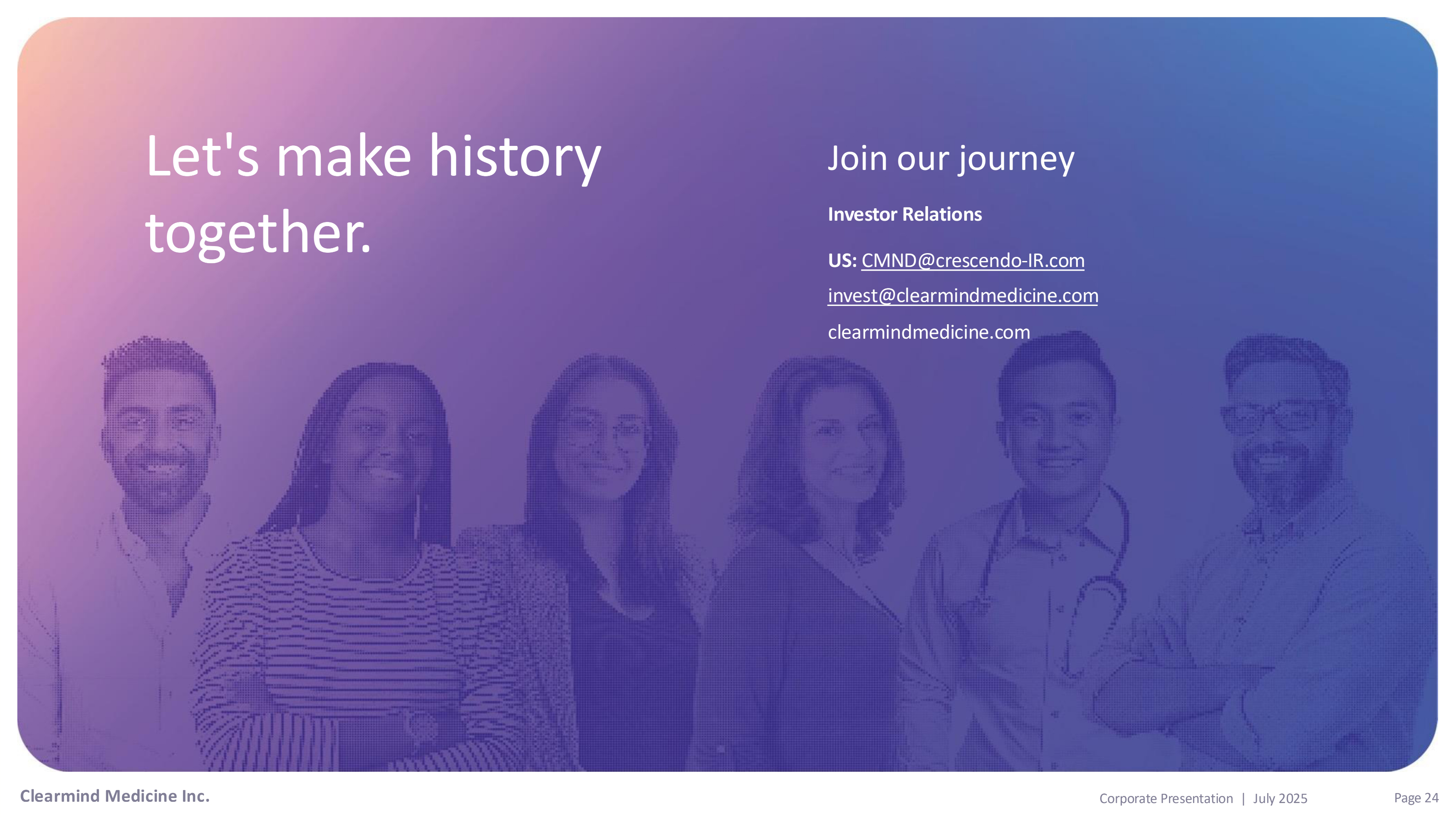 Highly Accomplished Board of Directors Asaf Itzhaik Director Amitay Weiss Chairman of the Board Oz Adler Director Yehonatan Shachar Director Mr . Asaf Itzhaik has served as our Director since November 2022 . Mr . Itzhaik is a seasoned international businessman in retail, BTC, BTB and real estate . He is serving as a director in Tzmiha Ltd (Israel), GIX Internet (Israel), Jeff Brands (Nasdaq), and Rani Zim (Israel) . Mr . Itzhaik has 28 years of experience running an optic brand specializing in athletes . Mr . Yehonatan Shachar has served as our Director since April 15 , 2020 . Mr . Shachar has served as the Chief Executive Officer of Heroic Media Ltd . , a digital marketing agency that works with top Israeli e - commerce brands since February 2020 . Before this role, from June 2019 until February 2021 , Mr . Shachar served as the CEO of Chiron Refineries, where he led a merger with Upsellon brands . Mr . Shachar has an LLB in Law and MBA from the IDC International University in Herzliya, Israel . Mr . Oz Adler has served as our Director since September 2021 . Mr . Adler currently serves as the Chief Executive Officer and Chief Financial Officer of SciSparc Ltd . where he has served since April 2018 and between September 2017 and March 2018 , he served as VP Finance of SciSparc Ltd . From December 2020 to May 2021 , Mr . Adler served as the Chief Financial Officer of Medigus Ltd . Mr . Adler also worked in the audit department of Kost Forer Gabbay & Kasierer, a member of Ernst & Young Global between December 2012 and August 2017 . Mr . Adler currently serves on the board of directors of numerous private and publicly traded companies, including Elbit Imaging Ltd . (TASE : EMITF), Rail Vision Ltd . (NASDAQ : RVSN), Jeffs’ Brands Ltd . , Polyrizon Ltd . and Charging Robotics Ltd . Mr . Adler is a certified public accountant in Israel and holds a BA degree in Accounting and Business Management from The College of Management, Israel . Mr . Amitay Weiss has served Chairman of our Board of Directors since August 19 , 2019 . Mr . Weiss served as the Chief Executive Officer of SciSparc Ltd . from August 2020 until January 2022 , and since January 2022 , Mr . Weiss has served as the Chairman of SciScparc’s Board of Directors . In addition, Mr . Weiss currently serves as Chairman of the Board of Directors of both Automax Ltd . (TASE : AMX) and Save Foods, Inc . In 2016 , Mr . Weiss founded Amity Weiss Management Ltd . and now serves as its chief executive officer . From 2001 until 2015 , Mr . Weiss served as vice president of business marketing & development and in various other positions at Bank Poalei Agudat Israel Ltd . of the First International Bank of Israel group . Mr . Weiss holds a BA in economics from New England College, as well as MBA and LLB from Ono Academic College in Israel, an Israeli branch of University of Manchester . Hila Kiron - Revach Director Ms . Hila Kiron - Revach has served as our director since September 2024 . Ms . Kiron - Revach has served on the board of directors of Rail Vision Ltd . (Nasdaq : RVSN) since January 2024 . Ms . Kiron - Revach has served as a member of the board of directors of Geffen Biomed Ltd . since 2014 and has been a member of the board of directors of Zmiha Investment House Ltd . since 2021 . In 2021 , Ms . Kiron - Revach served as a professional advisor to the chairman of the board of directors and acting secretary of Eilat Ashkelon Pipeline Company . From 2015 to 2021 , Ms . Kiron - Revach served as a senior professional advisor to ministers in the Israeli government, including the minister of foreign affairs and minister of transportation . From 2012 until 2015 , Ms . Kiron - Revach served as CEO of Hamil 38 – the Israeli Center for National Master Plan to Strengthen Existing Building in the Face of Earthquakes, Tama 38 Ltd . and as an attorney at Tabakman & Co . Law Firm . Ms . Kiron - Revach holds an LLB from the Netanya Academic College and is a licensed attorney in Israel . Clearmind Medicine Inc. Page 23 Corporate Presentation | July 2025 Let's make history t o g e t h e r . Clearmind Medicine Inc. Page 24 Corporate Presentation | July 2025 Join our journey Investor Relations US: CMND@crescendo - IR.com invest@clearmindmedicine.com clearmindmedicine.com