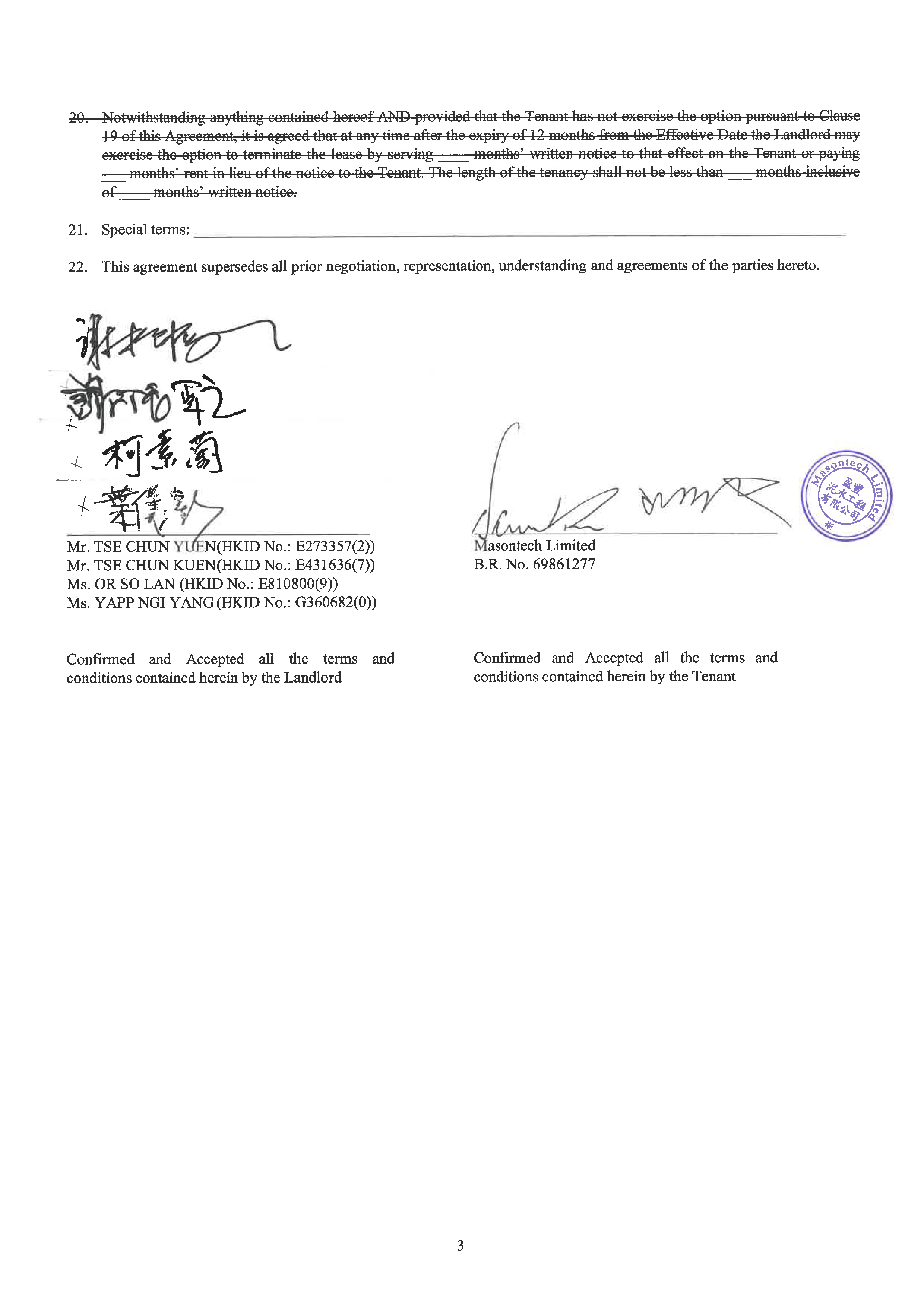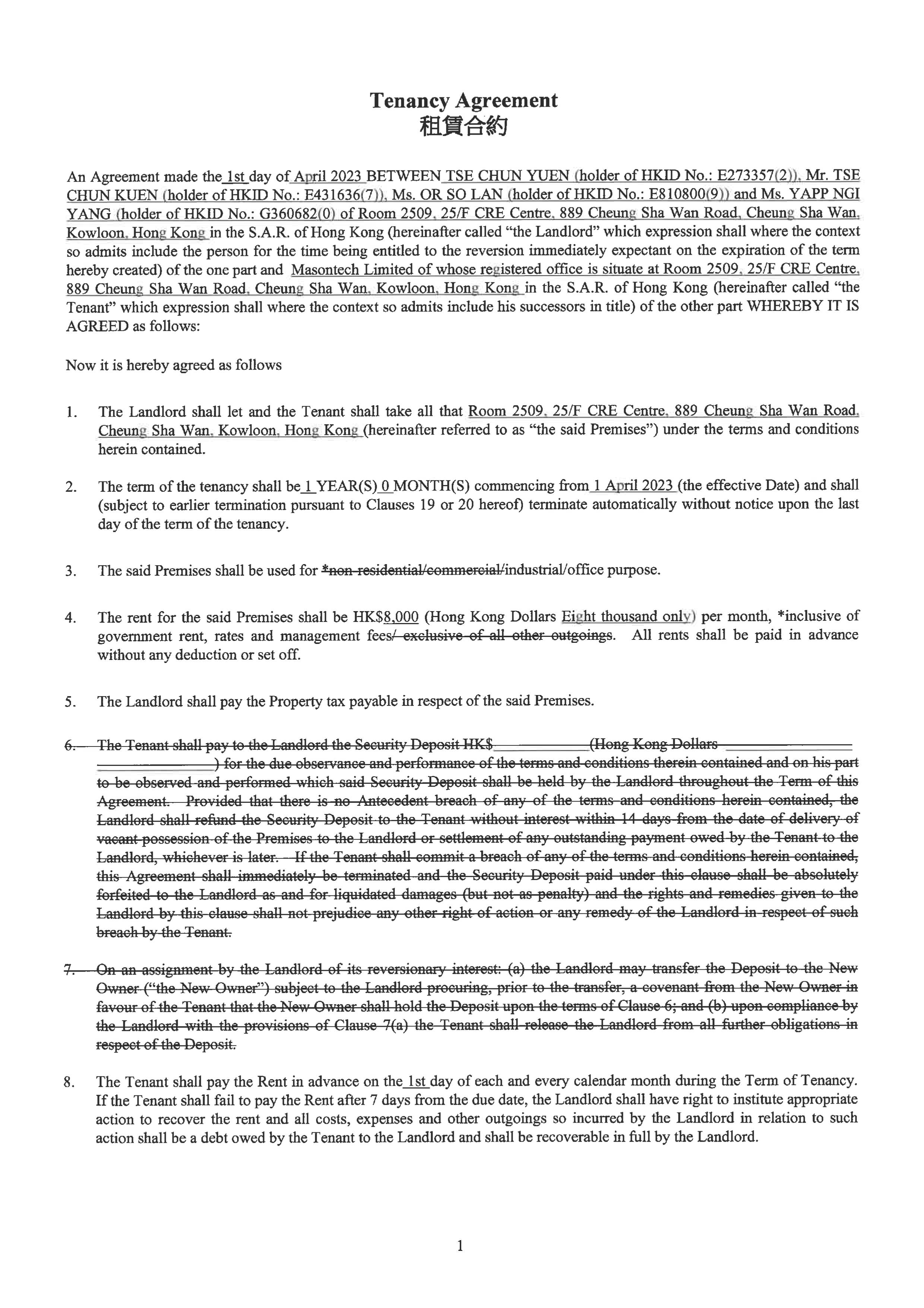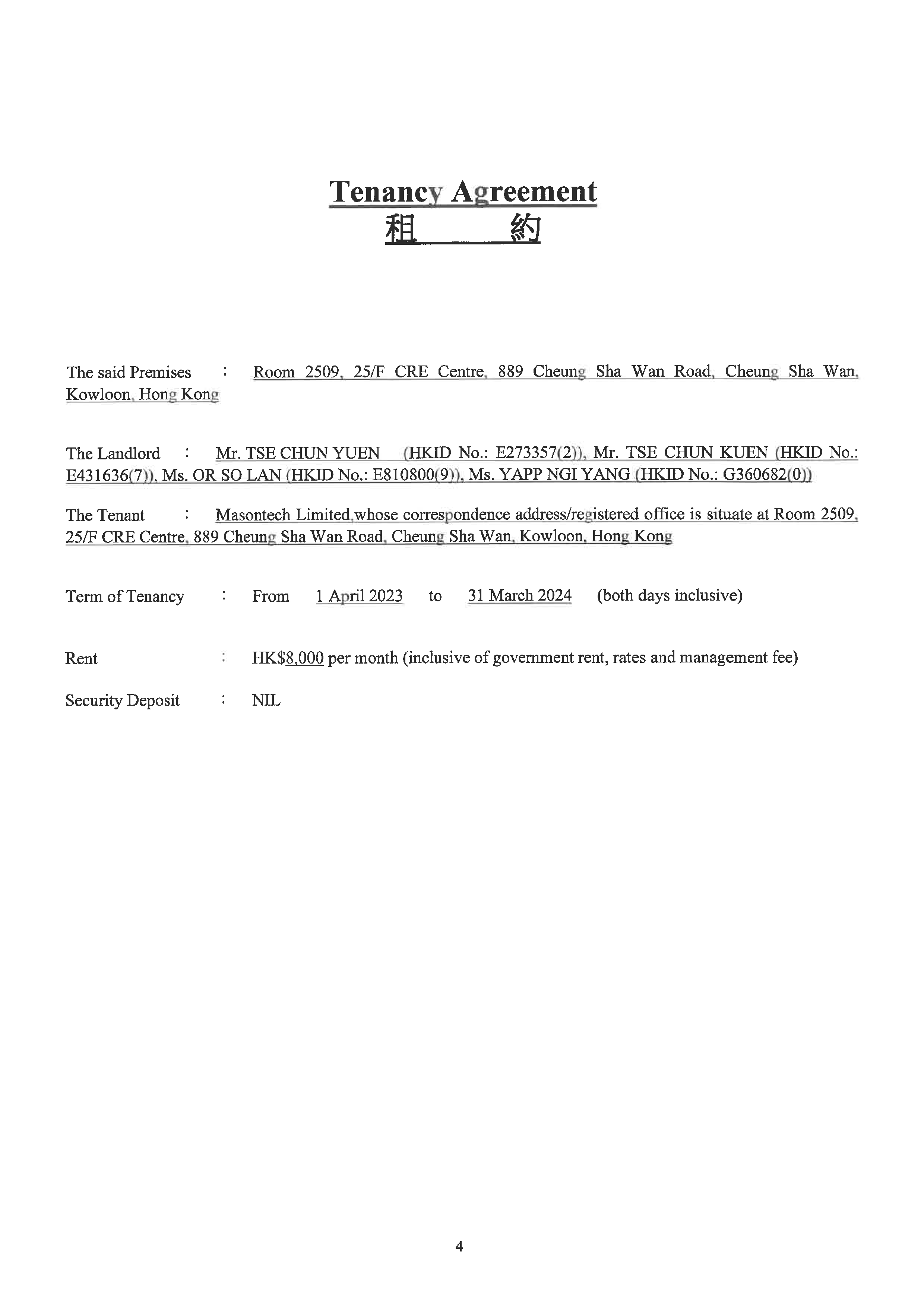 An Agreement made the 1st day of April 2025 BETWEEN TSE CHUN YUEN (holder of HKID No.: E273357(2)), Mr. TSE CHUN KUEN (holder of HKID No.: E431636(7)), Ms. OR SO LAN (holder of HKID No.: E810800(9)) and Ms. YAPP NGI YANG (holder of HKID No.: G360682(0) of Room 2508, 25/F CRE Centre, 889 Cheung Sha Wan Road, Cheung Sha Wan, Kowloon, Hong Kong in the S.A.R. of Hong Kong (hereinafter called “the Landlord” which expression shall where the context so admits include the person for the time being entitled to the reversion immediately expectant on the expiration of the term hereby created) of the one part and Masontech Limited of whose registered office is situate at Room 2508, 25/F CRE Centre, 889 Cheung Sha Wan Road, Cheung Sha Wan, Kowloon, Hong Kong in the S.A.R. of Hong Kong (hereinafter called “the Tenant” which expression shall where the context so admits include his successors in title) of the other part WHEREBY IT IS AGREED as follows: