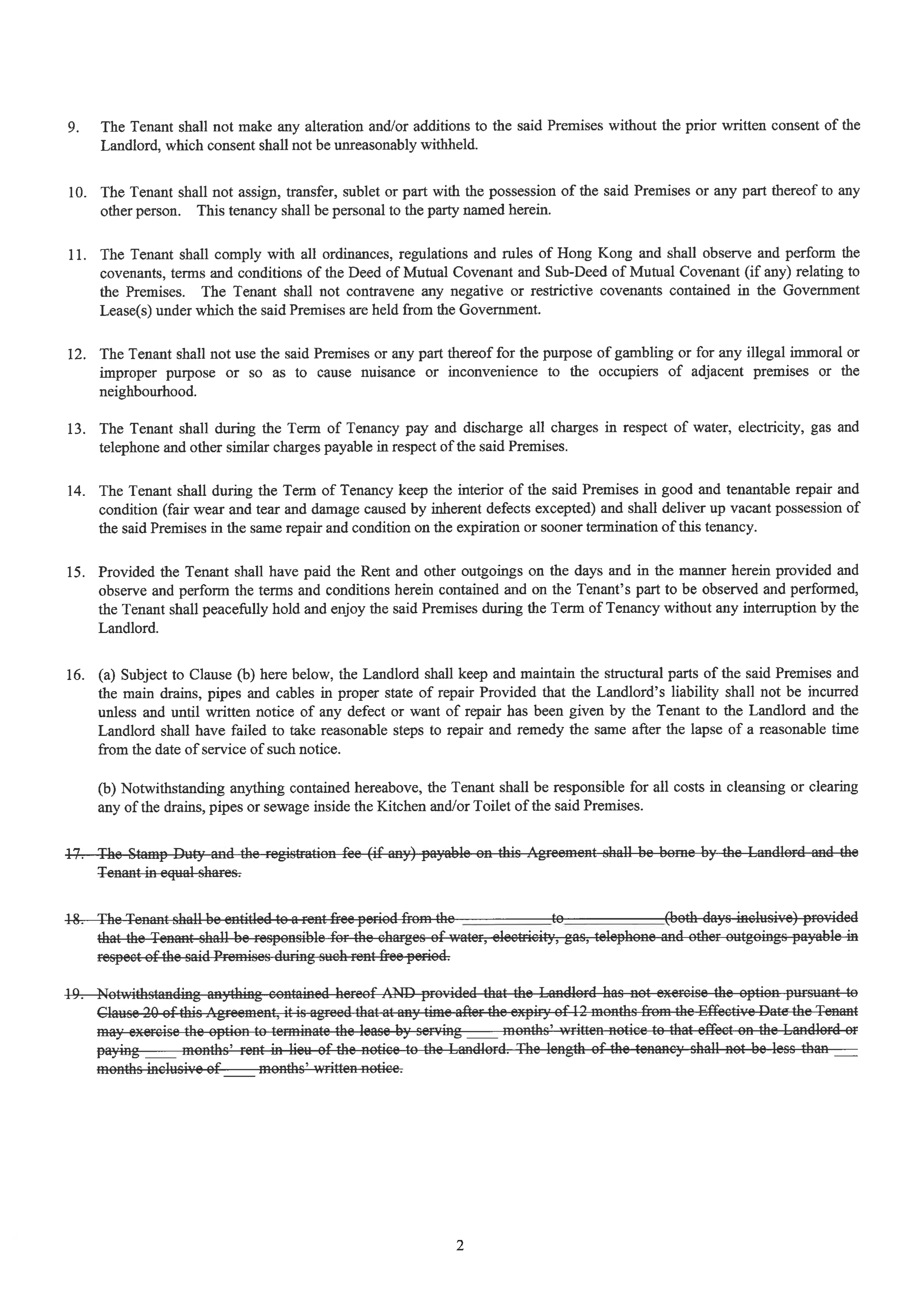 | 11. | The Tenant shall comply with all ordinances, regulations and rules of Hong Kong and shall observe and perform the covenants, terms and conditions of the Deed of Mutual Covenant and Sub-Deed of Mutual Covenant (if any) relating to the Premises. The Tenant shall not contravene any negative or restrictive covenants contained in the Government Lease(s) under which the said Premises are held from the Government. |