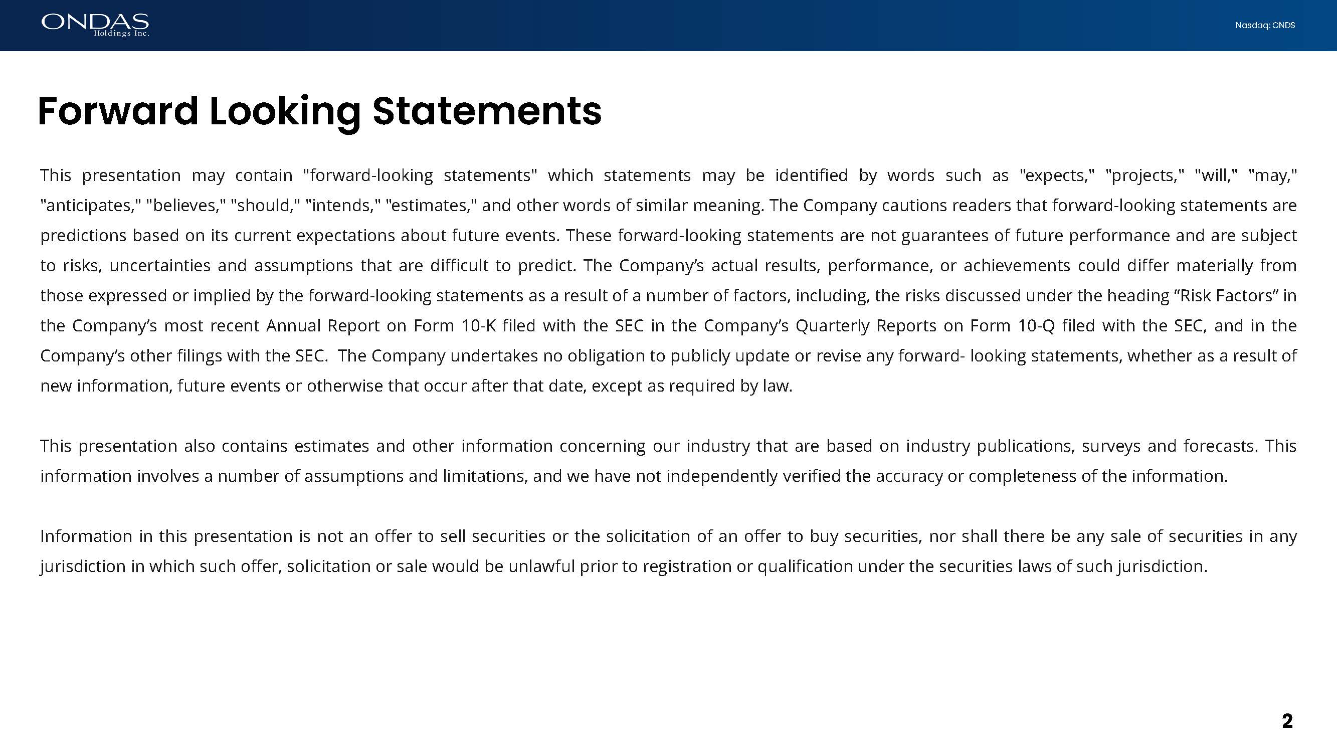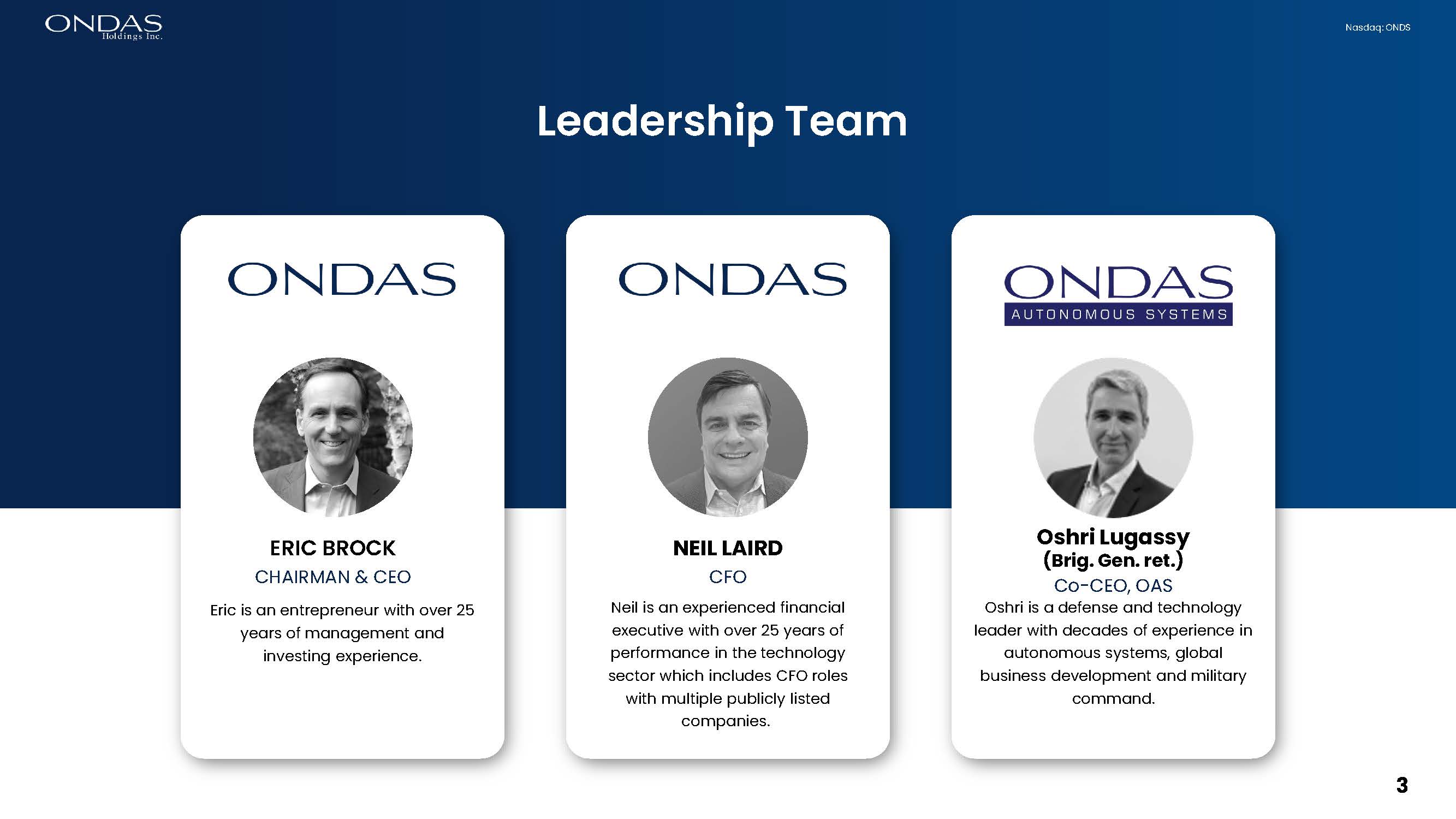 Nasdaq: ONDS This presentation may contain "forward - looking statements" which statements may be identified by words such as "expects," "projects," "will," "may," "anticipates," "believes," "should," "intends," "estimates," and other words of similar meaning . The Company cautions readers that forward - looking statements are predictions based on its current expectations about future events . These forward - looking statements are not guarantees of future performance and are subject to risks, uncertainties and assumptions that are difficult to predict . The Company’s actual results, performance, or achievements could differ materially from those expressed or implied by the forward - looking statements as a result of a number of factors, including, the risks discussed under the heading “Risk Factors” in the Company’s most recent Annual Report on Form 10 - K filed with the SEC in the Company’s Quarterly Reports on Form 10 - Q filed with the SEC, and in the Company’s other filings with the SEC . The Company undertakes no obligation to publicly update or revise any forward - looking statements, whether as a result of new information, future events or otherwise that occur after that date, except as required by law . This presentation also contains estimates and other information concerning our industry that are based on industry publications, surveys and forecasts . This information involves a number of assumptions and limitations, and we have not independently verified the accuracy or completeness of the information . Information in this presentation is not an offer to sell securities or the solicitation of an offer to buy securities, nor shall there be any sale of securities in any jurisdiction in which such offer, solicitation or sale would be unlawful prior to registration or qualification under the securities laws of such jurisdiction . 2 Forward Looking Statements Nasdaq: ONDS Leadership Team NEIL LAIRD CFO Neil is an experienced financial executive with over 25 years of performance in the technology sector which includes CFO roles with multiple publicly listed companies.