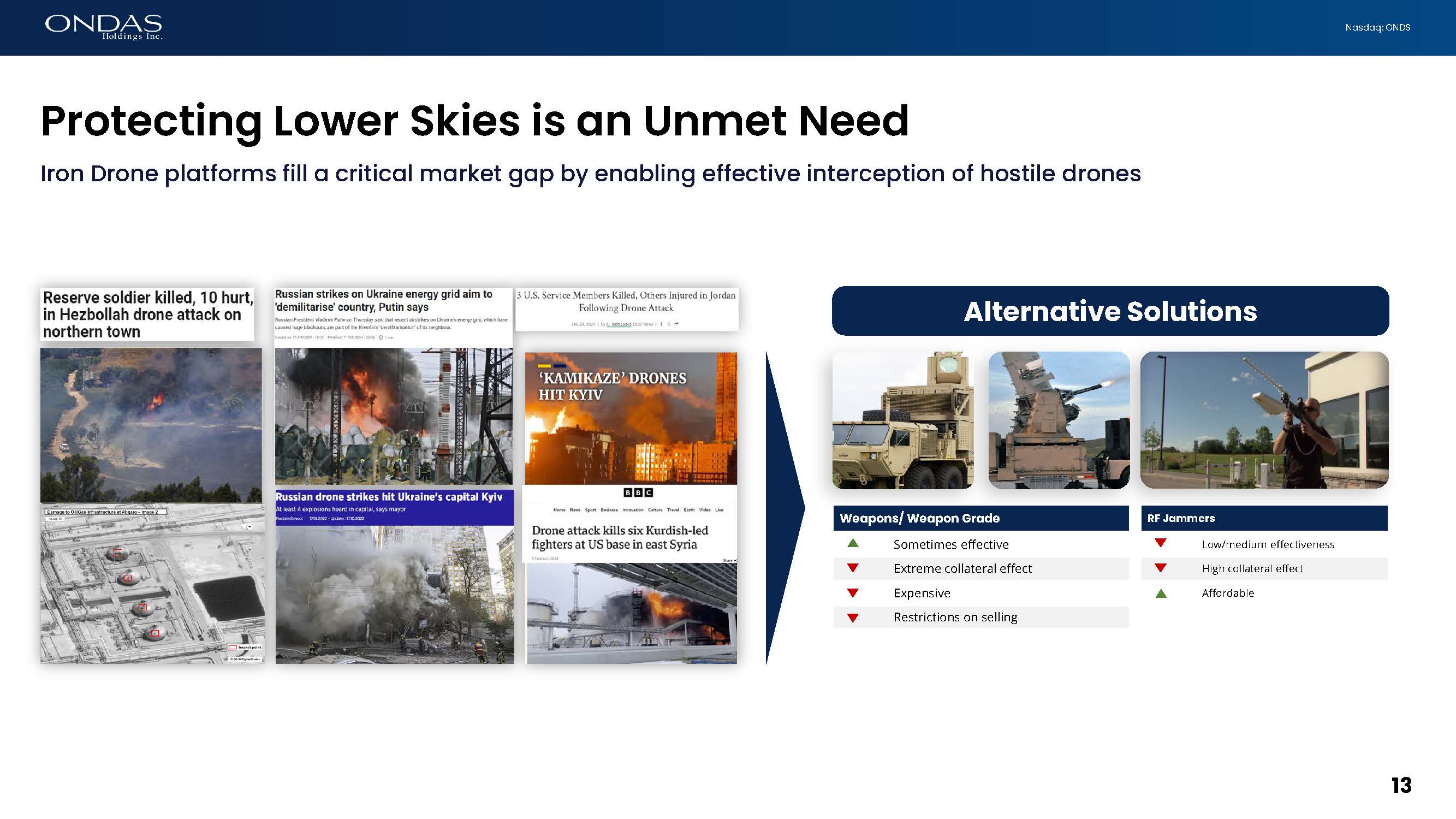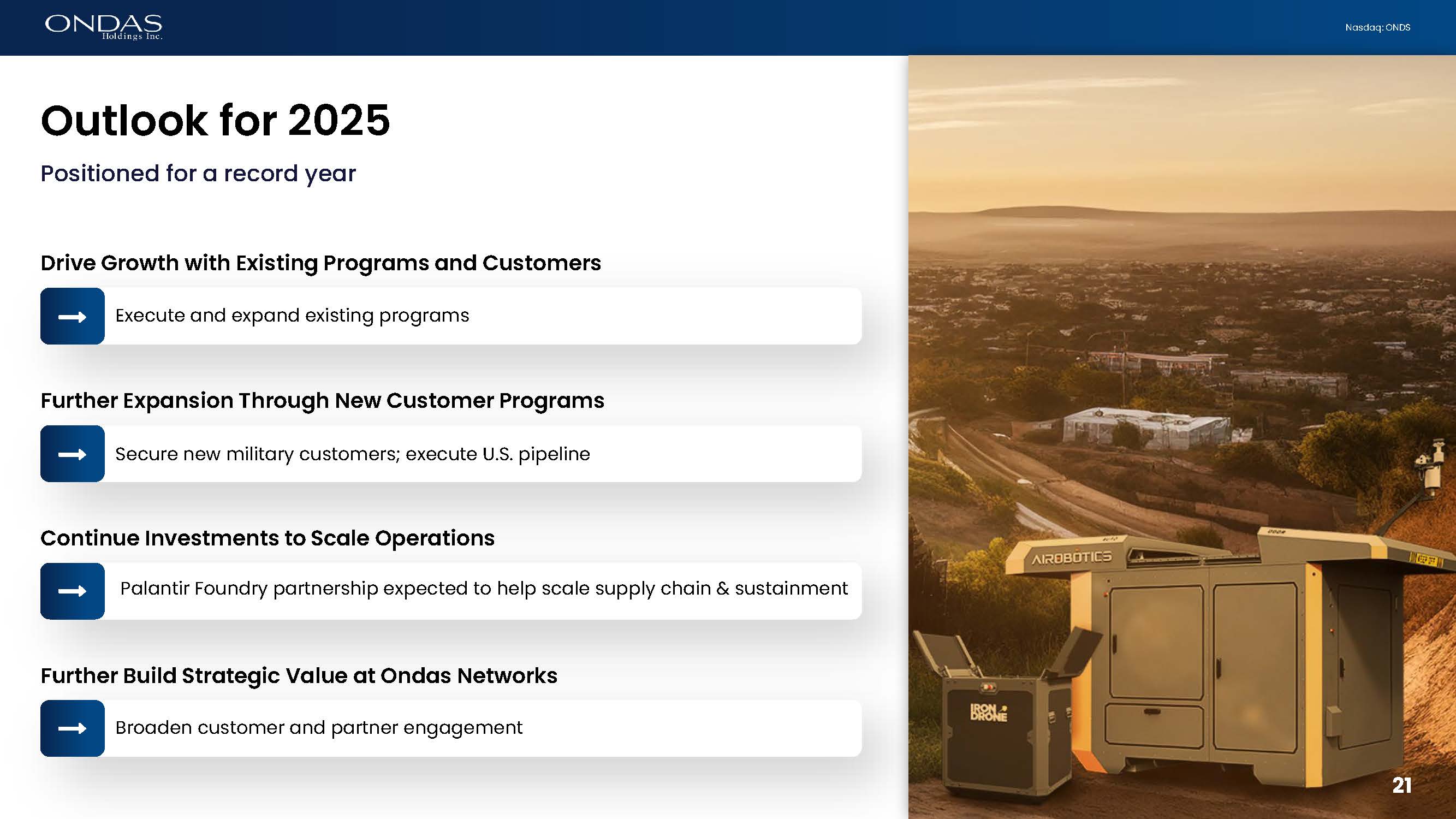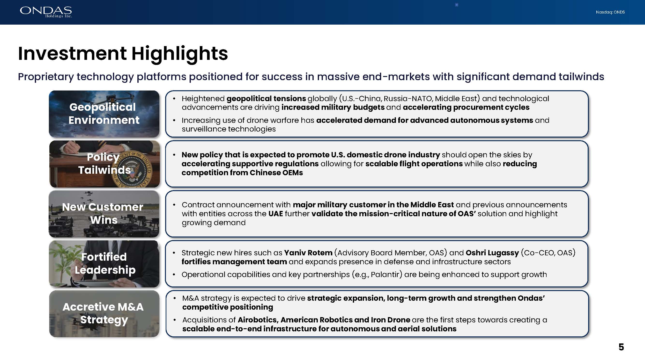 Nasdaq: ONDS Investment Highlights Proprietary technology platforms positioned for success in massive end - markets with significant demand tailwinds • Heightened geopolitical tensions globally (U.S. - China, Russia - NATO, Middle East) and technological advancements are driving increased military budgets and accelerating procurement cycles • Increasing use of drone warfare has accelerated demand for advanced autonomous systems and surveillance technologies Geopolitical Environment • Strategic new hires such as Yaniv Rotem (Advisory Board Member, OAS) and Oshri Lugassy (Co - CEO, OAS) fortifies management team and expands presence in defense and infrastructure sectors • Operational capabilities and key partnerships (e.g., Palantir) are being enhanced to support growth Fortified Leadership • Contract announcement with major military customer in the Middle East and previous announcements with entities across the UAE further validate the mission - critical nature of OAS’ solution and highlight growing demand New Customer Wins • M&A strategy is expected to drive strategic expansion, long - term growth and strengthen Ondas’ competitive positioning • Acquisitions of Airobotics, American Robotics and Iron Drone are the first steps towards creating a scalable end - to - end infrastructure for autonomous and aerial solutions Accretive M&A Strategy • New policy that is expected to promote U.S.
