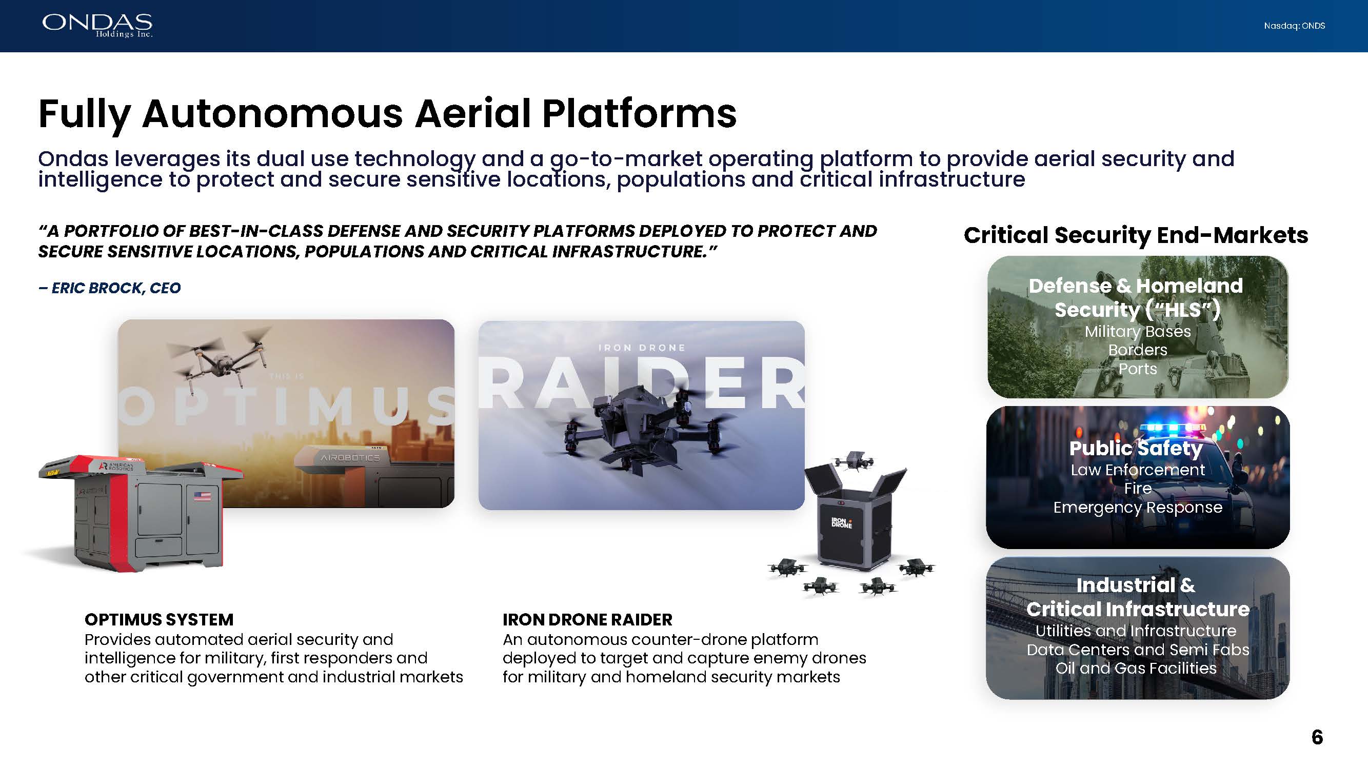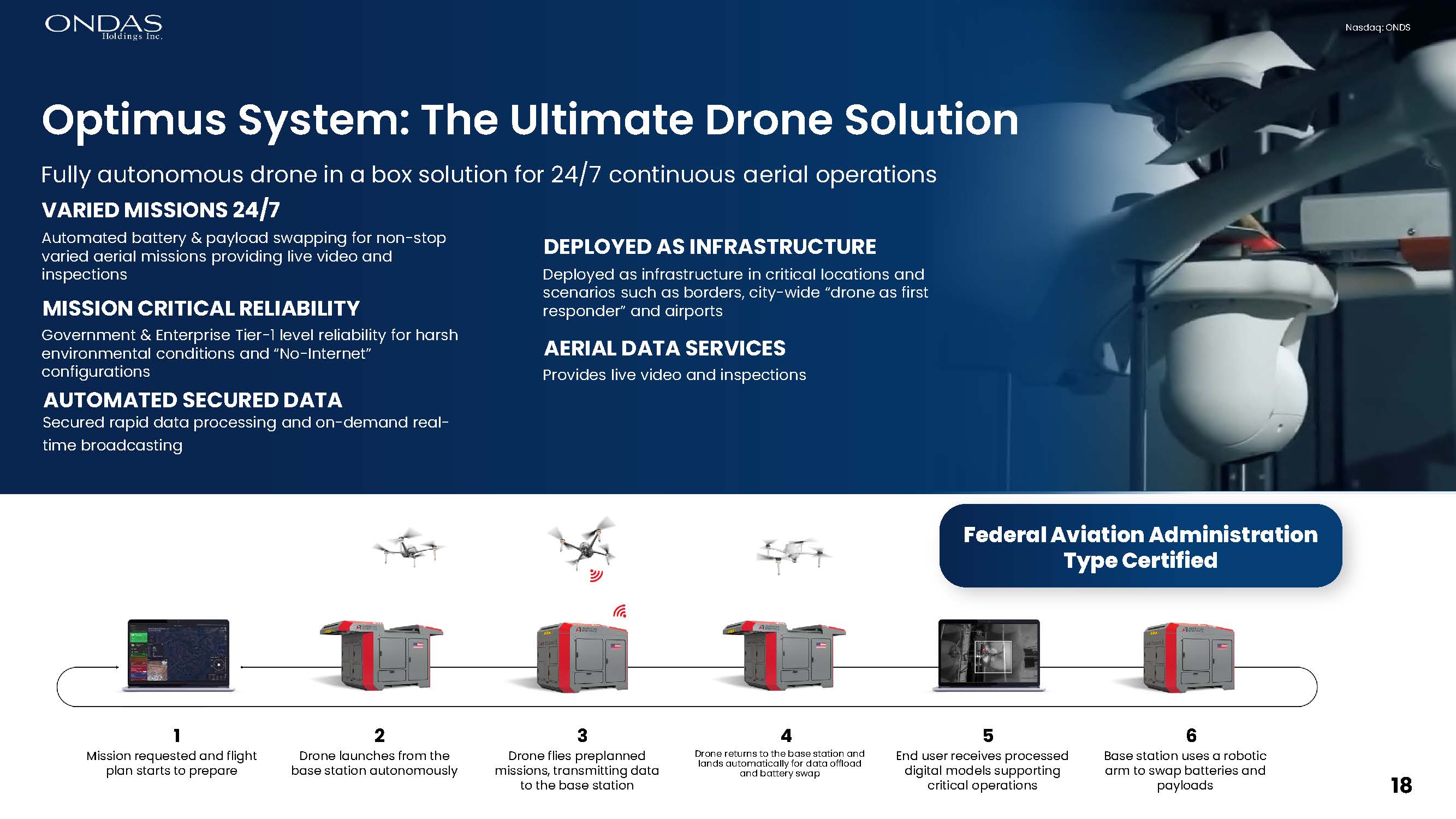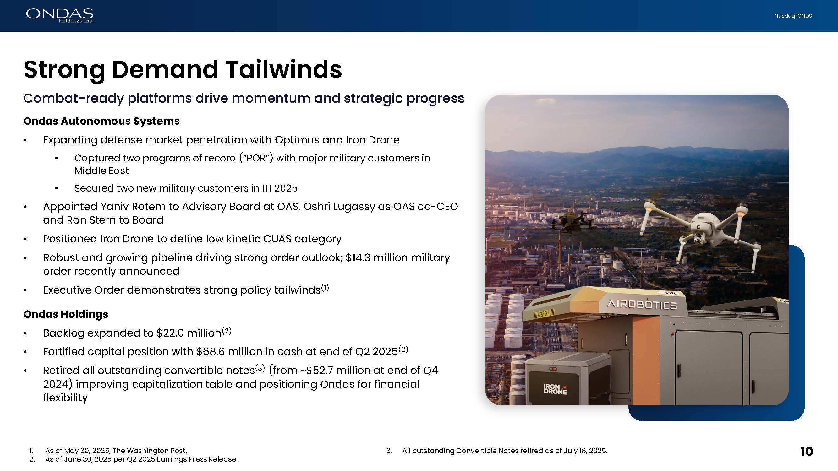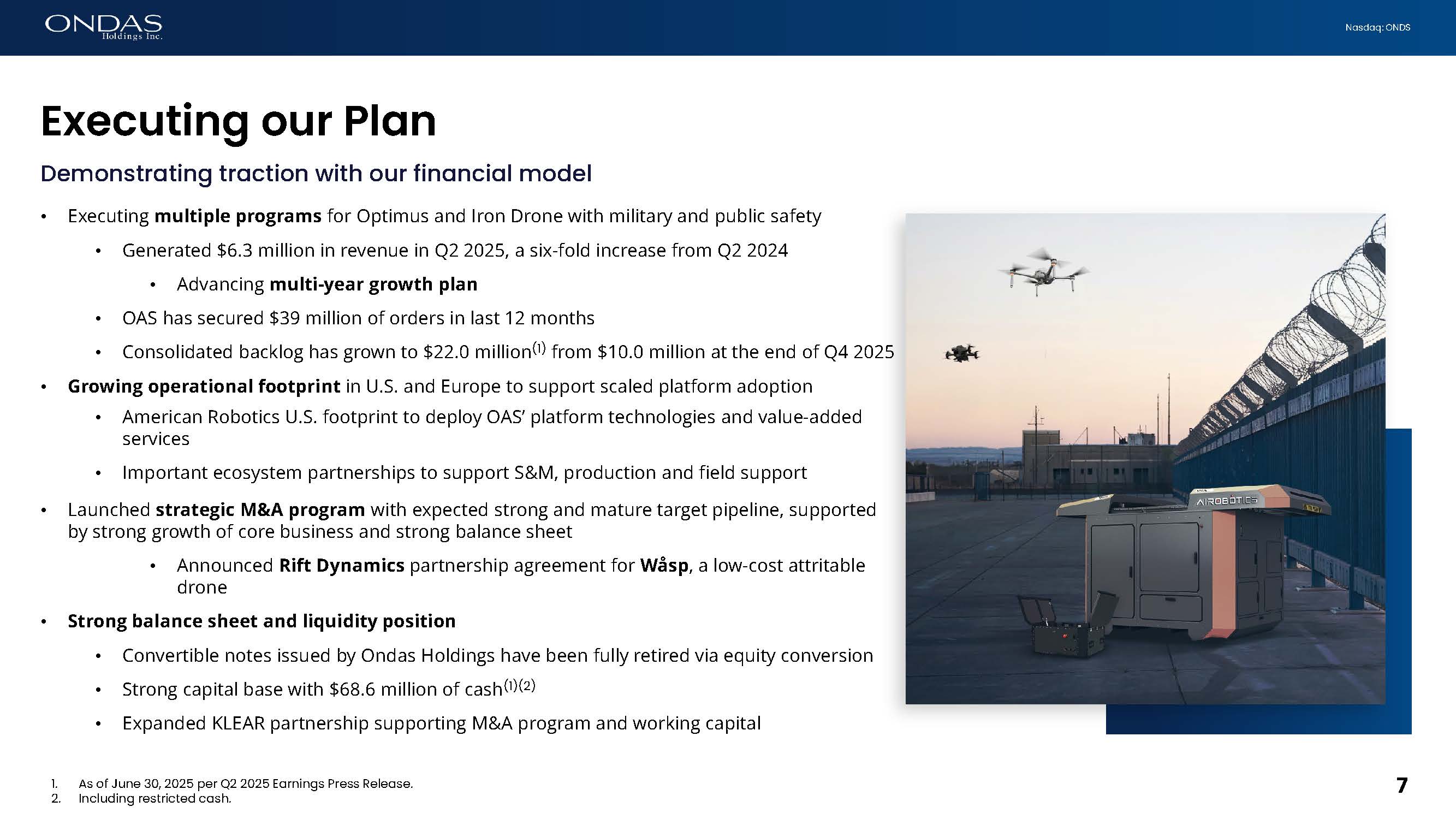 domestic drone industry should open the skies by accelerating supportive regulations allowing for scalable flight operations while also reducing competition from Chinese OEMs Policy Tailwinds 5 Nasdaq: ONDS “A PORTFOLIO OF BEST - IN - CLASS DEFENSE AND SECURITY PLATFORMS DEPLOYED TO PROTECT AND SECURE SENSITIVE LOCATIONS, POPULATIONS AND CRITICAL INFRASTRUCTURE.” – ERIC BROCK, CEO Fully Autonomous Aerial Platforms Ondas leverages its dual use technology and a go - to - market operating platform to provide aerial security and intelligence to protect and secure sensitive locations, populations and critical infrastructure IRON DRONE RAIDER An autonomous counter - drone platform deployed to target and capture enemy drones for military and homeland security markets OPTIMUS SYSTEM Provides automated aerial security and intelligence for military, first responders and other critical government and industrial markets Critical Security End - Markets Defense & Homeland Security (“HLS”) Military Bases Borders Ports Public Safety Law Enforcement Fire Emergency Response Industrial & Critical Infrastructure Utilities and Infrastructure Data Centers and Semi Fabs Oil and Gas Facilities 6 7 Nasdaq: ONDS Executing our Plan Demonstrating traction with our financial model • Executing multiple programs for Optimus and Iron Drone with military and public safety • Generated $6.3 million in revenue in Q2 2025, a six - fold increase from Q2 2024 • Advancing multi - year growth plan • OAS has secured $39 million of orders in last 12 months • Consolidated backlog has grown to $22.0 million (1) from $10.0 million at the end of Q4 2025 • Growing operational footprint in U.S. and Europe to support scaled platform adoption • American Robotics U.S. footprint to deploy OAS’ platform technologies and value - added services • Important ecosystem partnerships to support S&M, production and field support • Launched strategic M&A program with expected strong and mature target pipeline, supported by strong growth of core business and strong balance sheet • Announced Rift Dynamics partnership agreement for Wåsp , a low - cost attritable drone • Strong balance sheet and liquidity position • Convertible notes issued by Ondas Holdings have been fully retired via equity conversion • Strong capital base with $68.6 million of cash (1)(2) • Expanded KLEAR partnership supporting M&A program and working capital 1. As of June 30, 2025 per Q2 2025 Earnings Press Release. 2. Including restricted cash.