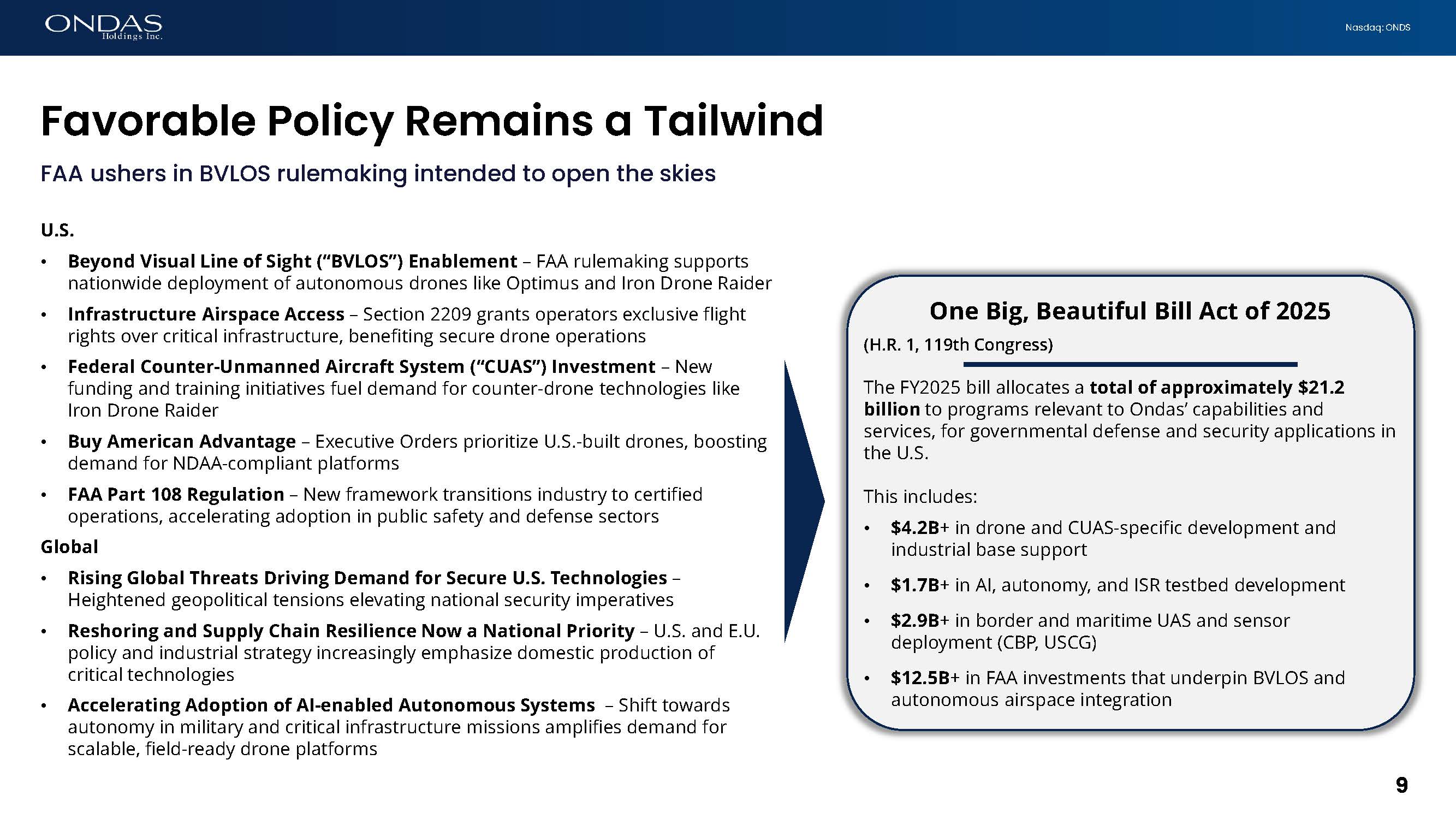 rights with early traction via American Robotics Go - to - Market Velocity Veteran team from Nordic Unmanned, Kongsberg, and Norwegian Special Forces, led by Knut Roar Wiig (NU founder) Leadership 8 Nasdaq: ONDS Favorable Policy Remains a Tailwind FAA ushers in BVLOS rulemaking intended to open the skies U.S. • Beyond Visual Line of Sight (“BVLOS”) Enablement – FAA rulemaking supports nationwide deployment of autonomous drones like Optimus and Iron Drone Raider • Infrastructure Airspace Access – Section 2209 grants operators exclusive flight rights over critical infrastructure, benefiting secure drone operations • Federal Counter - Unmanned Aircraft System (“CUAS”) Investment – New funding and training initiatives fuel demand for counter - drone technologies like Iron Drone Raider • Buy American Advantage – Executive Orders prioritize U.S. - built drones, boosting demand for NDAA - compliant platforms • FAA Part 108 Regulation – New framework transitions industry to certified operations, accelerating adoption in public safety and defense sectors Global • Rising Global Threats Driving Demand for Secure U.S. Technologies – Heightened geopolitical tensions elevating national security imperatives • Reshoring and Supply Chain Resilience Now a National Priority – U.S. and E.U. policy and industrial strategy increasingly emphasize domestic production of critical technologies • Accelerating Adoption of AI - enabled Autonomous Systems – Shift towards autonomy in military and critical infrastructure missions amplifies demand for scalable, field - ready drone platforms One Big, Beautiful Bill Act of 2025 (H.R. 1, 119th Congress) The FY2025 bill allocates a total of approximately $21.2 billion to programs relevant to Ondas’ capabilities and services, for governmental defense and security applications in the U.S.