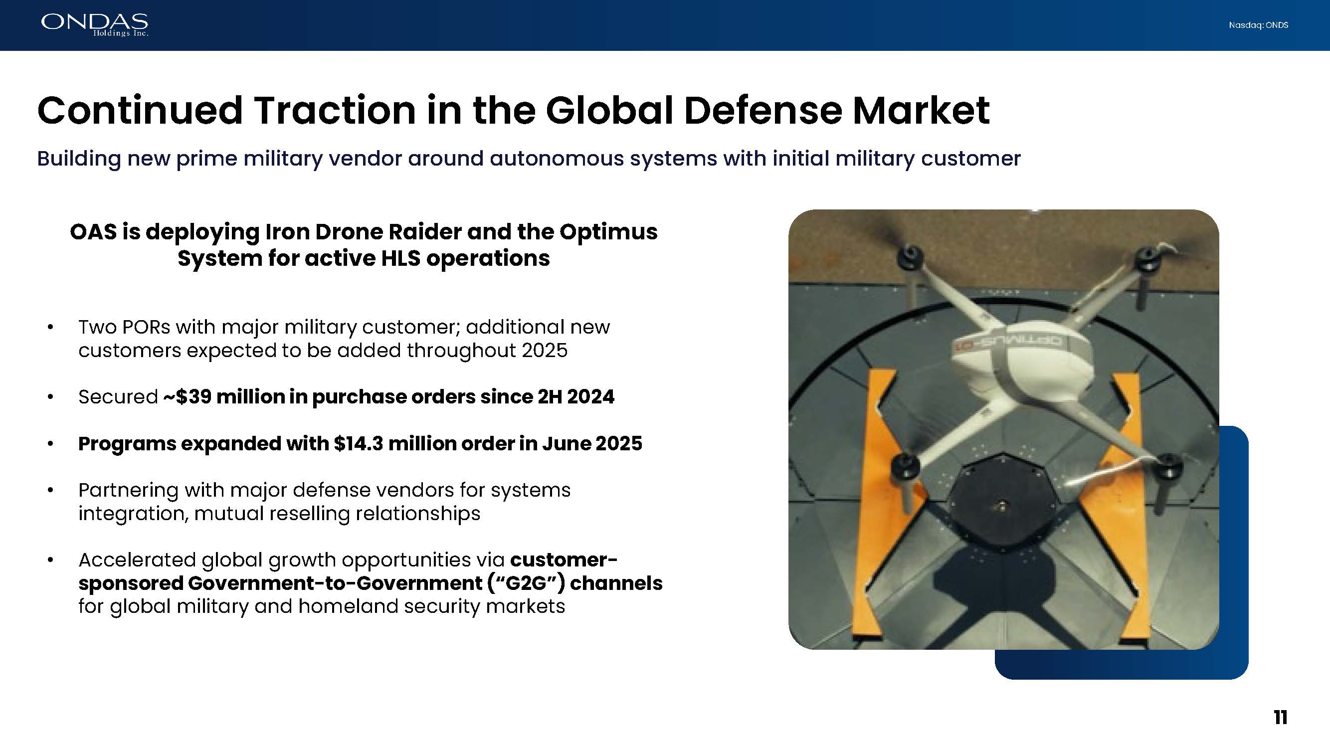 This includes: • $4.2B + in drone and CUAS - specific development and industrial base support • $1.7B + in AI, autonomy, and ISR testbed development • $2.9B + in border and maritime UAS and sensor deployment (CBP, USCG) • $12.5B + in FAA investments that underpin BVLOS and autonomous airspace integration 9 10 Nasdaq: ONDS Strong Demand Tailwinds Combat - ready platforms drive momentum and strategic progress Ondas Autonomous Systems • Expanding defense market penetration with Optimus and Iron Drone • Captured two programs of record (“POR”) with major military customers in Middle East • Secured two new military customers in 1H 2025 • Appointed Yaniv Rotem to Advisory Board at OAS, Oshri Lugassy as OAS co - CEO and Ron Stern to Board • Positioned Iron Drone to define low kinetic CUAS category • Robust and growing pipeline driving strong order outlook; $14.3 million military order recently announced • Executive Order demonstrates strong policy tailwinds (1) Ondas Holdings • Backlog expanded to $22.0 million (2) • Fortified capital position with $68.6 million in cash at end of Q2 2025 (2) • Retired all outstanding convertible notes (3) (from ~$52.7 million at end of Q4 2024) improving capitalization table and positioning Ondas for financial flexibility 1. As of May 30, 2025, The Washington Post. 2. As of June 30, 2025 per Q2 2025 Earnings Press Release. 3. All outstanding Convertible Notes retired as of July 18, 2025.