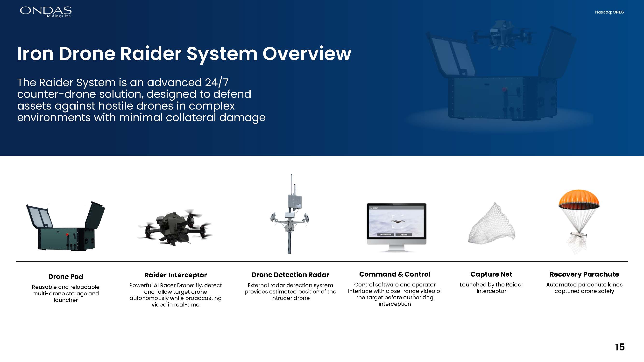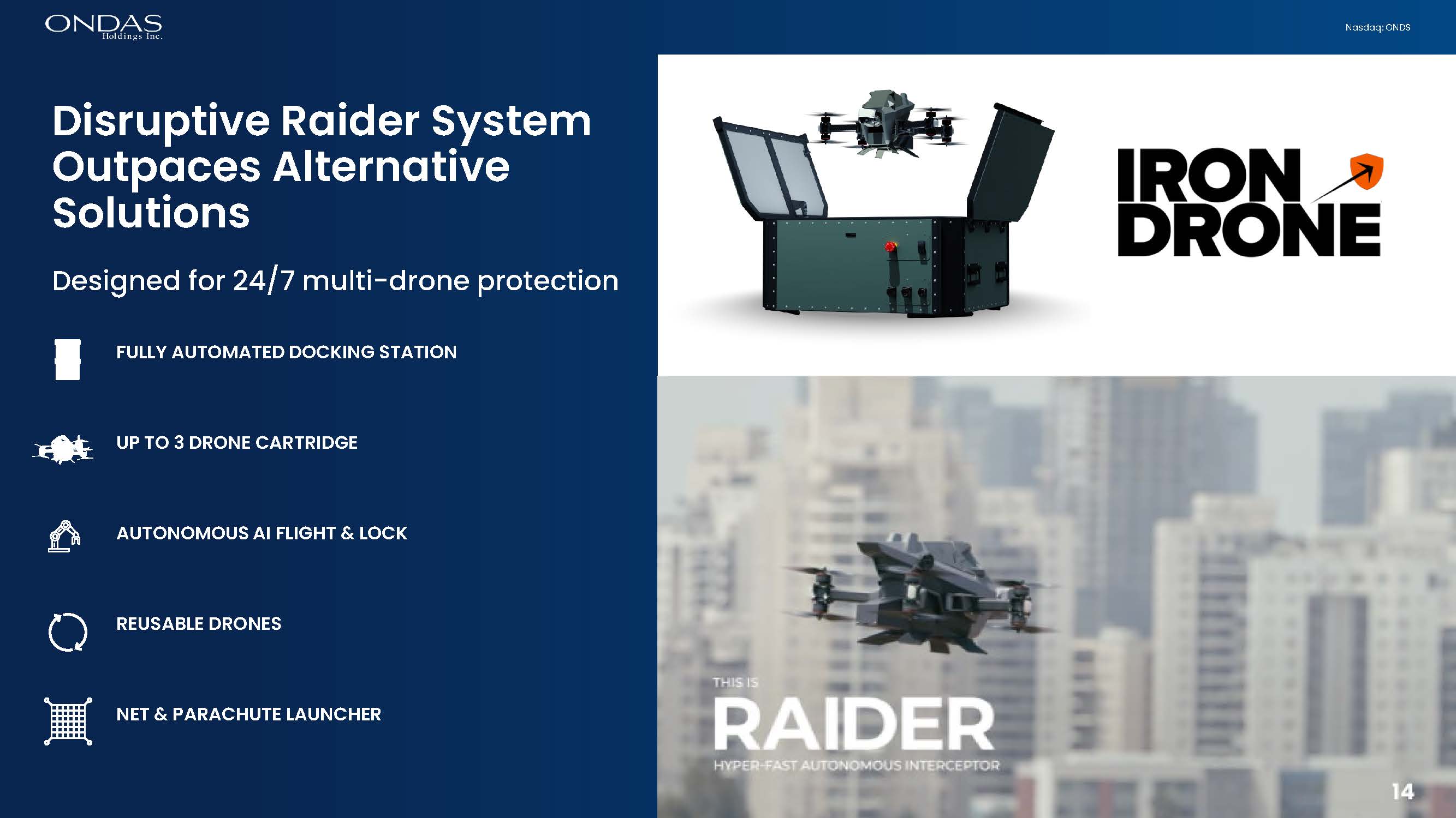Nasdaq: ONDS Alternative Solutions Protecting Lower Skies is an Unmet Need Iron Drone platforms fill a critical market gap by enabling effective interception of hostile drones Weapons/ Weapon Grade Sometimes effective Extreme collateral effect Expensive Restrictions on selling RF Jammers Low/medium effectiveness High collateral effect Affordable 13 Nasdaq: ONDS UP TO 3 DRONE CARTRIDGE AUTONOMOUS AI FLIGHT & LOCK FULLY AUTOMATED DOCKING STATION NET & PARACHUTE LAUNCHER REUSABLE DRONES Disruptive Raider System Outpaces Alternative Solutions Designed for 24/7 multi - drone protection 14 14