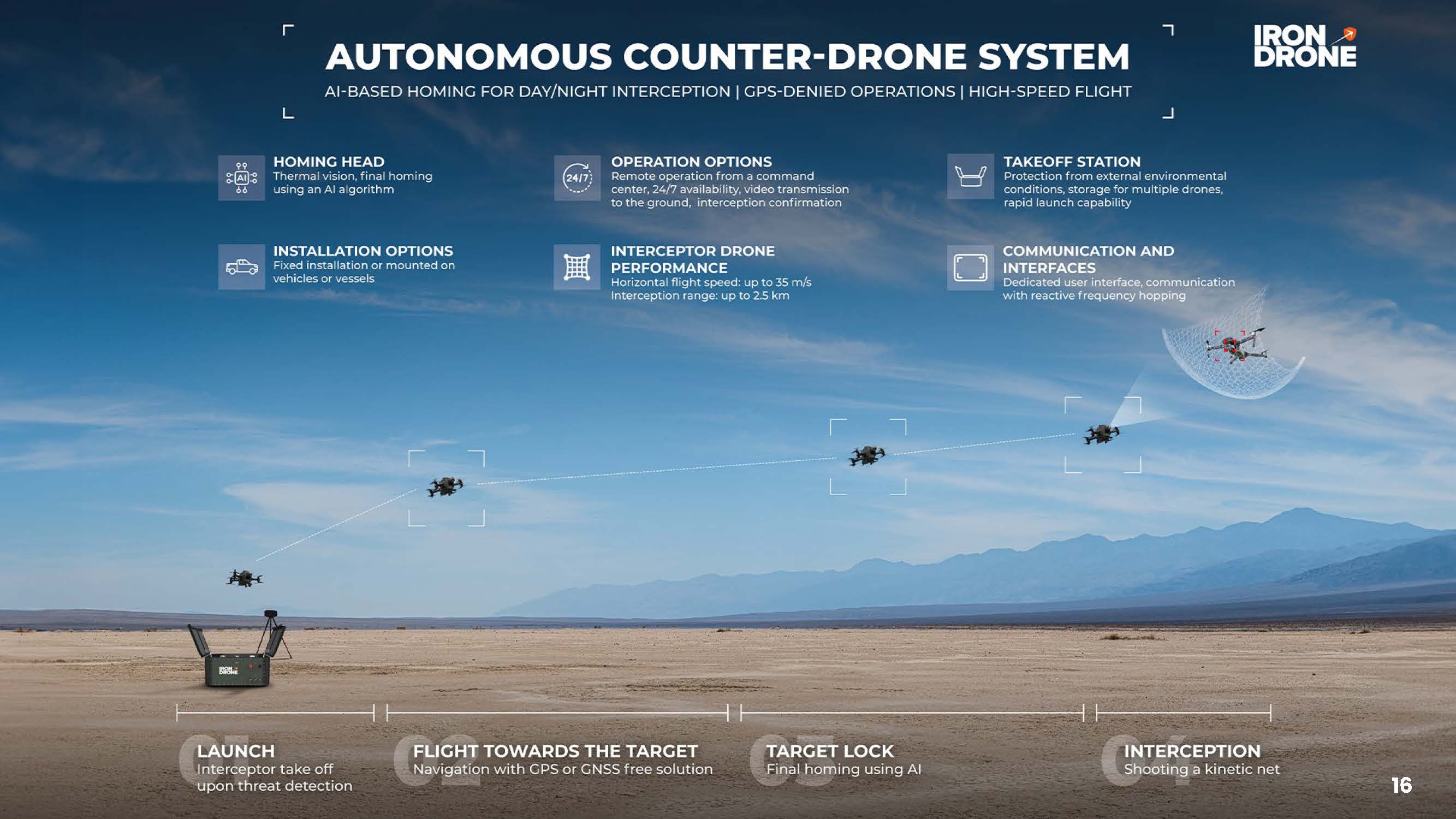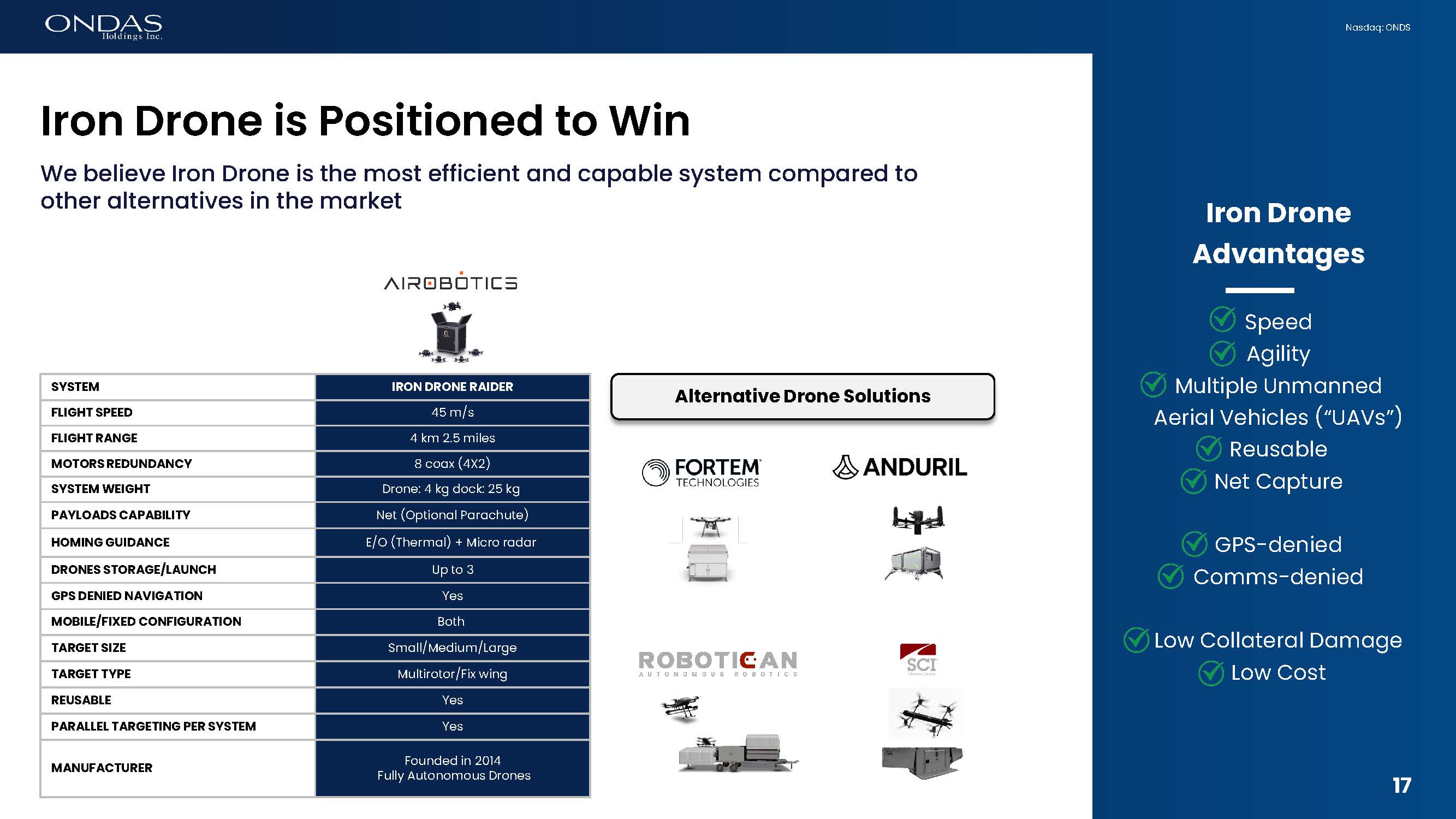 Nasdaq: ONDS The Raider System is an advanced 24/7 counter - drone solution, designed to defend assets against hostile drones in complex environments with minimal collateral damage Nasdaq: ONDS Drone Pod Reusable and reloadable multi - drone storage and launcher Drone Detection Radar External radar detection system provides estimated position of the intruder drone Command & Control Control software and operator interface with close - range video of the target before authorizing interception Raider Interceptor Powerful AI Racer Drone: fly, detect and follow target drone autonomously while broadcasting video in real - time Capture Net Launched by the Raider interceptor Recovery Parachute Automated parachute lands captured drone safely Iron Drone Raider System Overview 15 17 Nasdaq: ONDS IRON DRONE RAIDER SYSTEM 45 m/s FLIGHT SPEED 4 km 2.5 miles FLIGHT RANGE 8 coax (4X2) MOTORS REDUNDANCY Drone: 4 kg dock: 25 kg SYSTEM WEIGHT Net (Optional Parachute) PAYLOADS CAPABILITY E/O (Thermal) + Micro radar HOMING GUIDANCE Up to 3 DRONES STORAGE/LAUNCH Yes GPS DENIED NAVIGATION Both MOBILE/FIXED CONFIGURATION Small/Medium/Large TARGET SIZE Multirotor/Fix wing TARGET TYPE Yes REUSABLE Yes PARALLEL TARGETING PER SYSTEM Founded in 2014 Fully Autonomous Drones MANUFACTURER Iron Drone is Positioned to Win We believe Iron Drone is the most efficient and capable system compared to other alternatives in the market Iron Drone Advantages Speed Agility Multiple Unmanned Aerial Vehicles (“UAVs”) Reusable Net Capture GPS - denied Comms - denied Low Collateral Damage Low Cost Alternative Drone Solutions 17