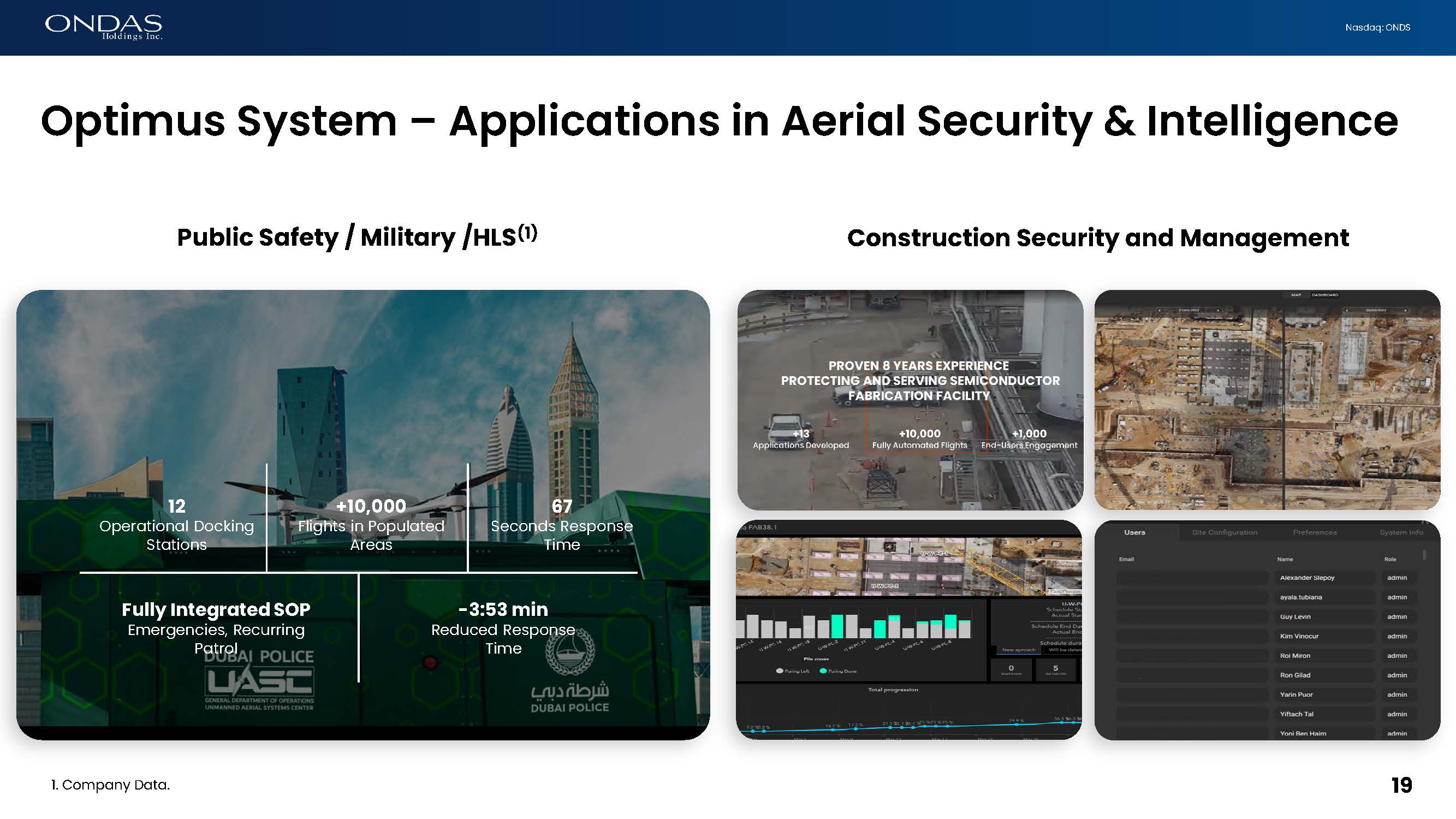 18 Nasdaq: ONDS Optimus System: The Ultimate Drone Solution varied aerial missions providing live video and inspections MISSION CRITICAL RELIABILITY Government & Enterprise Tier - 1 level reliability for harsh environmental conditions and “No - Internet” configurations AUTOMATED SECURED DATA Secured rapid data processing and on - demand real - time broadcasting Fully autonomous drone in a box solution for 24/7 continuous aerial operations VARIED MISSIONS 24/7 Automated battery & payload swapping for non - stop 1 Mission requested and flight plan starts to prepare 2 Drone launches from the base station autonomously 3 Drone flies preplanned missions, transmitting data to the base station 4 Drone returns to the base station and lands automatically for data offload and battery swap 5 End user receives processed digital models supporting critical operations 6 Base station uses a robotic arm to swap batteries and payloads Nasdaq: ONDS Federal Aviation Administration Type Certified DEPLOYED AS INFRASTRUCTURE Deployed as infrastructure in critical locations and scenarios such as borders, city - wide “drone as first responder” and airports AERIAL DATA SERVICES Provides live video and inspections 19 Nasdaq: ONDS Public Safety / Military /HLS (1) Construction Security and Management Optimus System – Applications in Aerial Security & Intelligence 1.