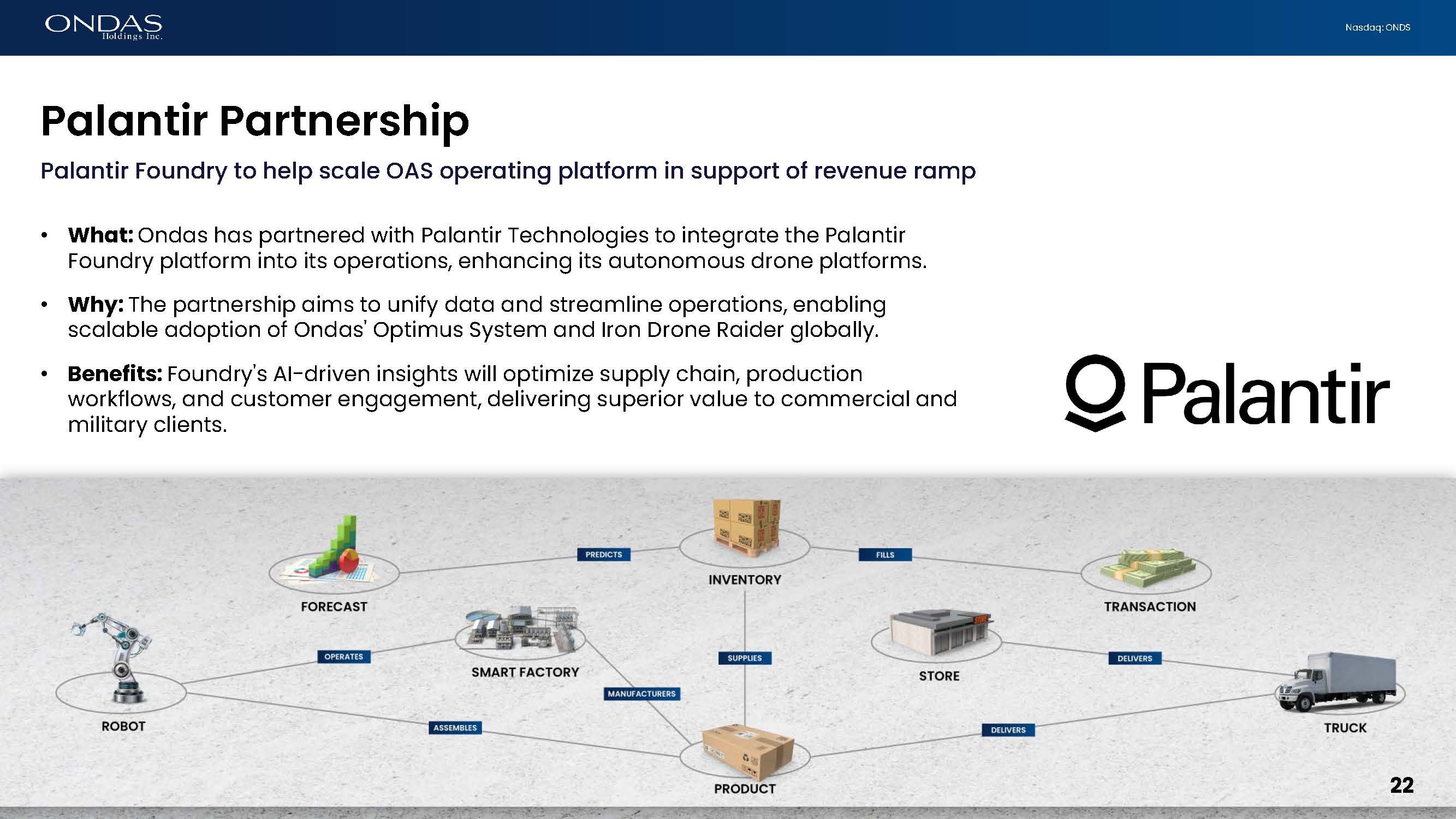 Nasdaq: ONDS Outlook for 2025 Positioned for a record year Drive Growth with Existing Programs and Customers Execute and expand existing programs Further Expansion Through New Customer Programs Secure new military customers; execute U.S. pipeline Continue Investments to Scale Operations Palantir Foundry partnership expected to help scale supply chain & sustainment Further Build Strategic Value at Ondas Networks Broaden customer and partner engagement 21 21 Nasdaq: ONDS Palantir Partnership Palantir Foundry to help scale OAS operating platform in support of revenue ramp • What: Ondas has partnered with Palantir Technologies to integrate the Palantir Foundry platform into its operations, enhancing its autonomous drone platforms.