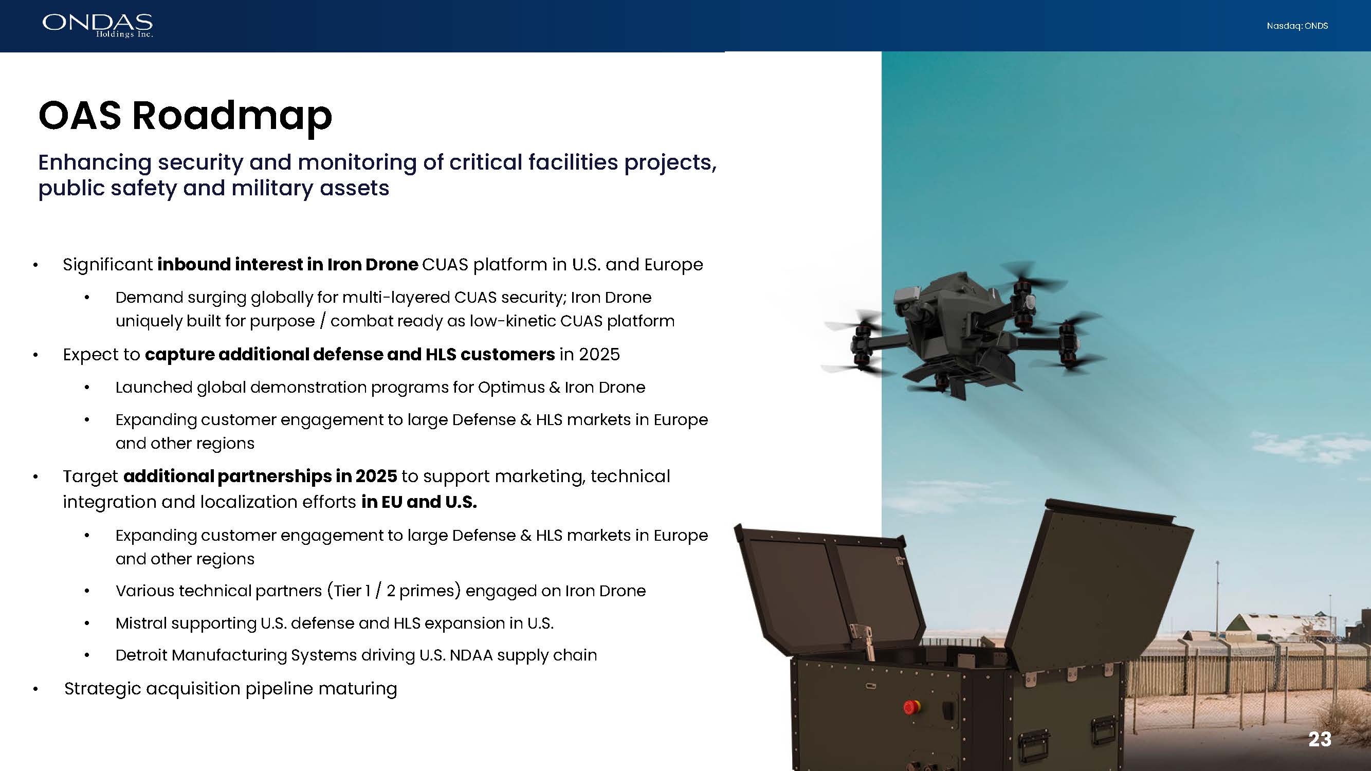 21 22 Nasdaq: ONDS • Significant inbound interest in Iron Drone CUAS platform in U.S. and Europe • Demand surging globally for multi - layered CUAS security; Iron Drone uniquely built for purpose / combat ready as low - kinetic CUAS platform • Expect to capture additional defense and HLS customers in 2025 • Launched global demonstration programs for Optimus & Iron Drone • Expanding customer engagement to large Defense & HLS markets in Europe and other regions • Target additional partnerships in 2025 to support marketing, technical integration and localization efforts in EU and U.S. • Expanding customer engagement to large Defense & HLS markets in Europe and other regions • Various technical partners (Tier 1 / 2 primes) engaged on Iron Drone • Mistral supporting U.S. defense and HLS expansion in U.S. • Detroit Manufacturing Systems driving U.S.