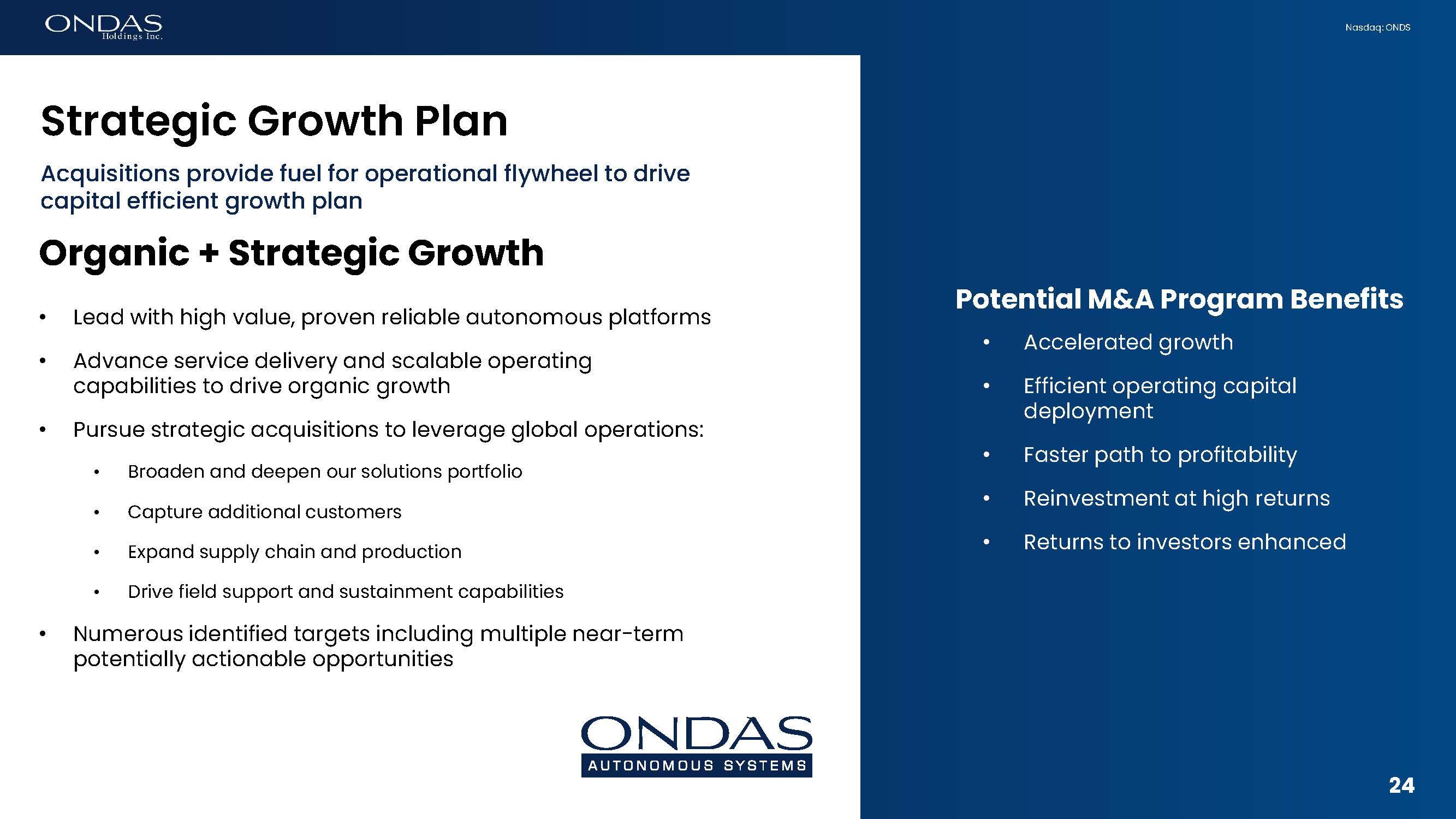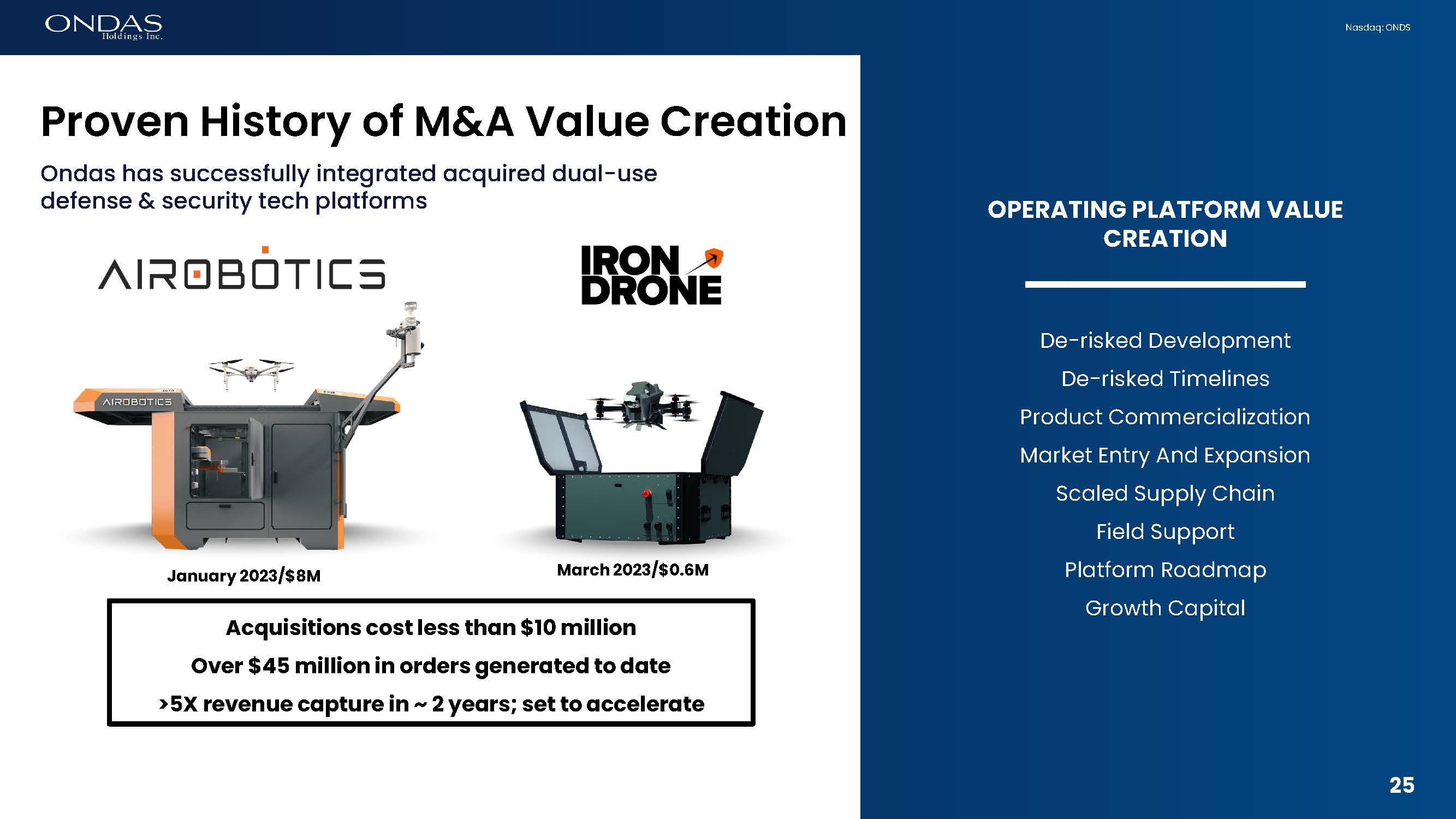 NDAA supply chain • Strategic acquisition pipeline maturing 21 23 OAS Roadmap Enhancing security and monitoring of critical facilities projects, public safety and military assets Nasdaq: ONDS Strategic Growth Plan Potential M&A Program Benefits • Accelerated growth • Efficient operating capital deployment • Faster path to profitability • Reinvestment at high returns • Returns to investors enhanced 21 24 Acquisitions provide fuel for operational flywheel to drive capital efficient growth plan Organic + Strategic Growth • Lead with high value, proven reliable autonomous platforms • Advance service delivery and scalable operating capabilities to drive organic growth • Pursue strategic acquisitions to leverage global operations: • Broaden and deepen our solutions portfolio • Capture additional customers • Expand supply chain and production • Drive field support and sustainment capabilities • Numerous identified targets including multiple near - term potentially actionable opportunities Nasdaq: ONDS OPERATING PLATFORM VALUE CREATION De - risked Development De - risked Timelines Product Commercialization Market Entry And Expansion Scaled Supply Chain Field Support Platform Roadmap Growth Capital Proven History of M&A Value Creation Ondas has successfully integrated acquired dual - use defense & security tech platforms Acquisitions cost less than $10 million Over $45 million in orders generated to date >5X revenue capture in ~ 2 years; set to accelerate January 2023/$8M March 2023/$0.6M 21 25