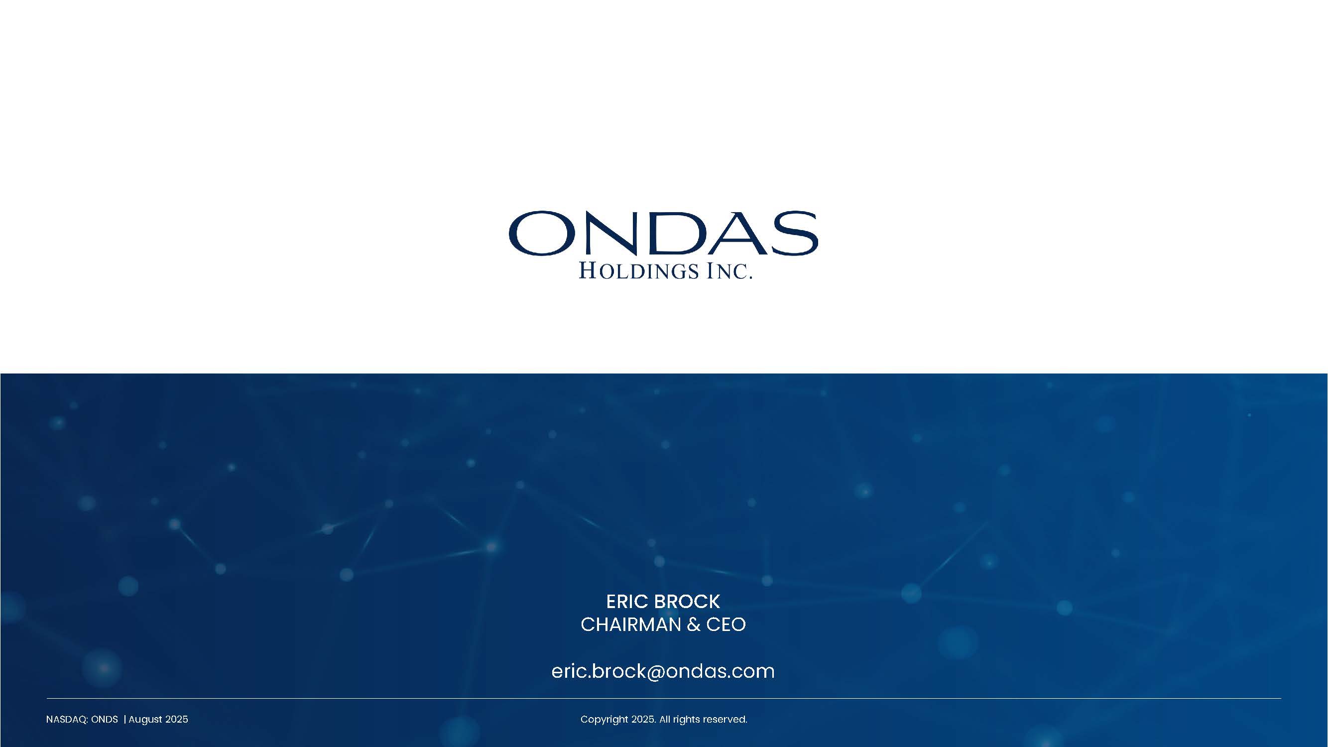 Nasdaq: ONDS Investment Highlights Proprietary technology platforms positioned for success in massive end - markets with significant demand tailwinds • Heightened geopolitical tensions globally (U.S. - China, Russia - NATO, Middle East) and technological advancements are driving increased military budgets and accelerating procurement cycles • Increasing use of drone warfare has accelerated demand for advanced autonomous systems and surveillance technologies Geopolitical Environment • Strategic new hires such as Yaniv Rotem (Advisory Board Member, OAS) and Oshri Lugassy (Co - CEO, OAS) fortifies management team and expands presence in defense and infrastructure sectors • Operational capabilities and key partnerships (e.g., Palantir) are being enhanced to support growth Fortified Leadership • Contract announcement with major military customer in the Middle East and previous announcements with entities across the UAE further validate the mission - critical nature of OAS’ solution and highlight growing demand New Customer Wins • M&A strategy is expected to drive strategic expansion, long - term growth and strengthen Ondas’ competitive positioning • Acquisitions of Airobotics, American Robotics and Iron Drone are the first steps towards creating a scalable end - to - end infrastructure for autonomous and aerial solutions Accretive M&A Strategy • New policy that is expected to promote U.S. domestic drone industry should open the skies by accelerating supportive regulations allowing for scalable flight operations while also reducing competition from Chinese OEMs Policy Tailwinds 26 Nasdaq: ONDS 27 ERIC BROCK CHAIRMAN & CEO eric.brock@ondas.com NASDAQ: ONDS | August 2025 Copyright 2025.