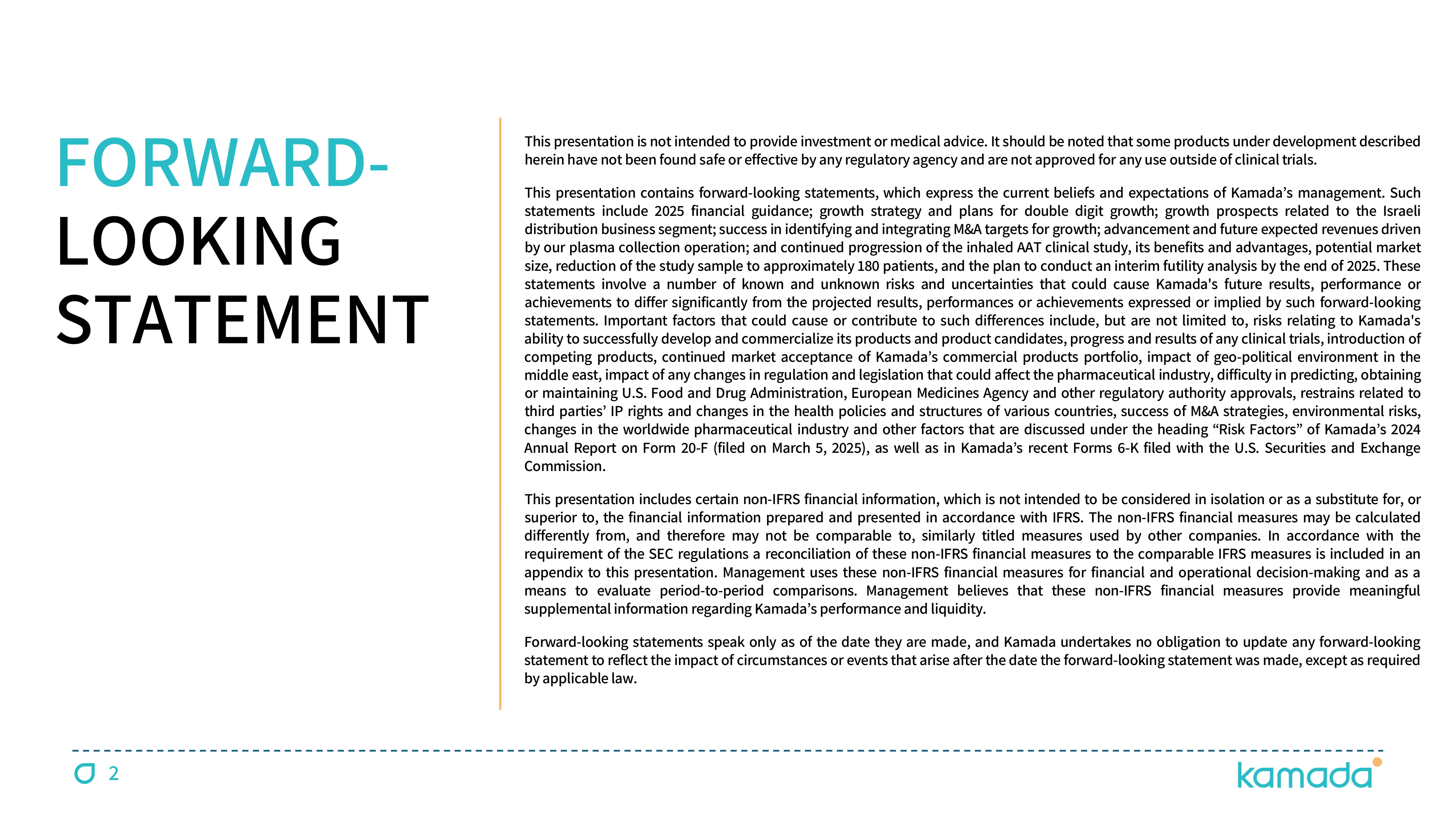 This release includes forward-looking statements within the meaning of Section 21E of the U.S. Securities Exchange Act of 1934, as amended, and the safe harbor provisions of the U.S. Private Securities Litigation Reform Act of 1995. Forward-looking statements are statements that are not historical facts, including statements regarding: 1) increasing its adjusted EBITDA guidance to a range of $40 million to $44 million and reiteration of 2025 full-year guidance of $178 million to $182 million, 2) double digit growth in fiscal year 2025, 3) continued investment in the Company’s four strategic growth pillars, consisting of organic commercial growth, business development and M&A transactions, plasma collection operations, and advancement of the pivotal Phase 3 Inhaled AAT program, 4) continued progress of the InnovAATe clinical trial and conducting an interim futility analysis by the end of 2025, 5) continued focus on securing commercial-stage business development and M&A opportunities to expand the portfolio of marketed products to support continued long-term profitable growth, 6) plasma collection center in Houston, TX, supporting 50 donor beds, with planned capacity of approximately 50,000 liters per year and is anticipated to be one of the largest sites for specialty plasma collection in the U.S., and 7) expected annual revenues contribution from sales of normal source plasma collected in the Houston collection centers at $8 million to $10 million at full capacity. Forward-looking statements are based on Kamada’s current knowledge and its present beliefs and expectations regarding possible future events and are subject to risks, uncertainties and assumptions. Forward-looking statements are based on Kamada’s current knowledge and its present beliefs and expectations regarding possible future events and are subject to risks, uncertainties and assumptions. Actual results and the timing of events could differ materially from those anticipated in these forward-looking statements as a result of several factors including, but not limited to the evolving nature of the conflicts in the Middle East and the impact of such conflicts in Israel, the Middle East and the rest of the world, the impact of these conflicts on market conditions and the general economic, industry and political conditions in Israel, the U.S. and globally, effect of tariffs on overall international trade and specifically on Kamada’s ability to continue maintaining expected sales and profit levels in light of such tariffs, the effect on establishment and timing of business initiatives, Kamada’s ability to leverage new business opportunities and integrate it with its existing product portfolio, unexpected results of clinical and development programs, regulatory delays, and other risks detailed in Kamada’s filings with the U.S. Securities and Exchange Commission (the “SEC”) including those discussed in its most recent Annual Report on Form 20-F and in any subsequent reports on Form 6-K, each of which is on file or furnished with the SEC and available at the SEC’s website at www.sec.gov. The forward-looking statements made herein speak only as of the date of this announcement and Kamada undertakes no obligation to update publicly such forward-looking statements to reflect subsequent events or circumstances, except as otherwise required by law.