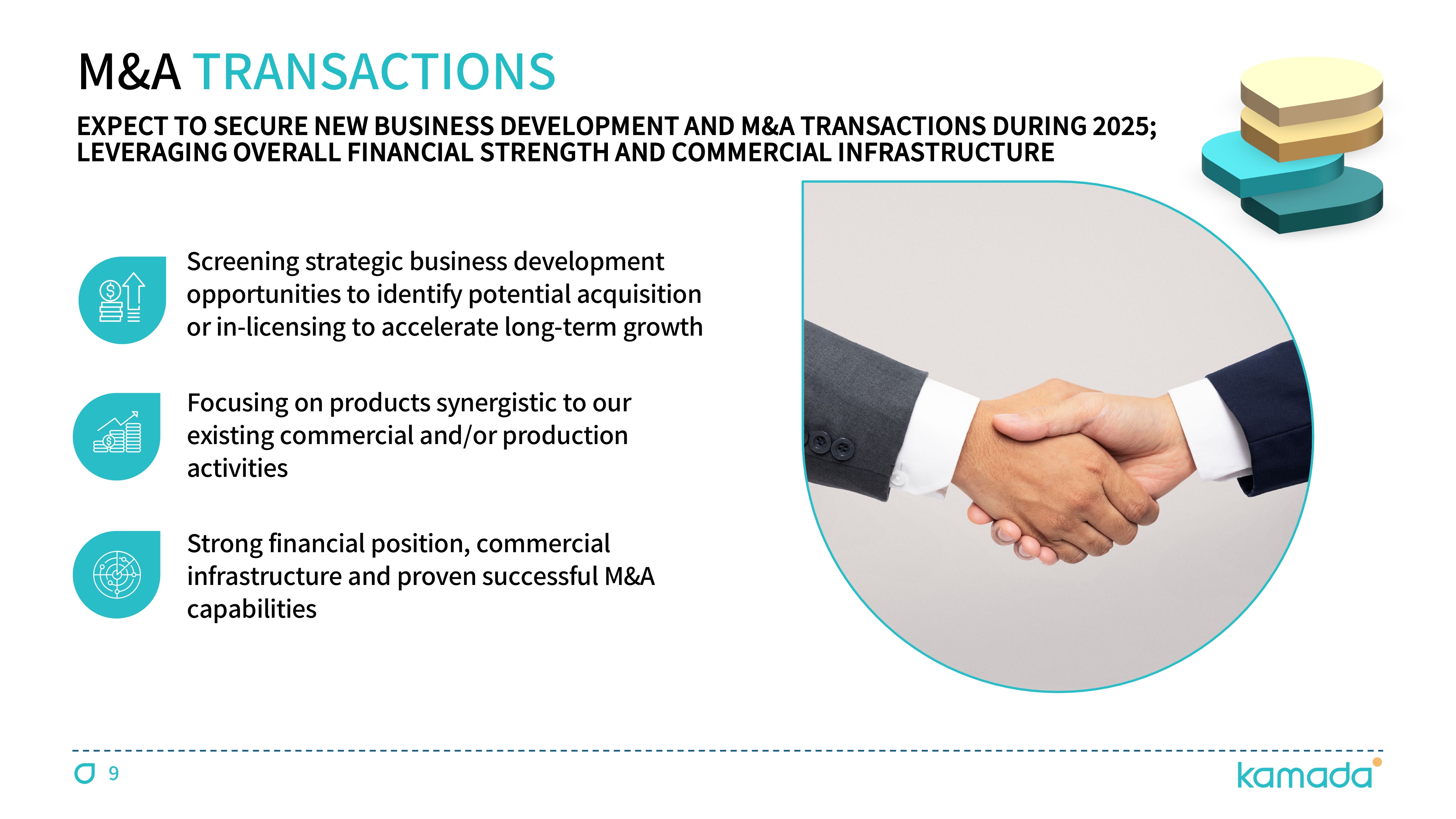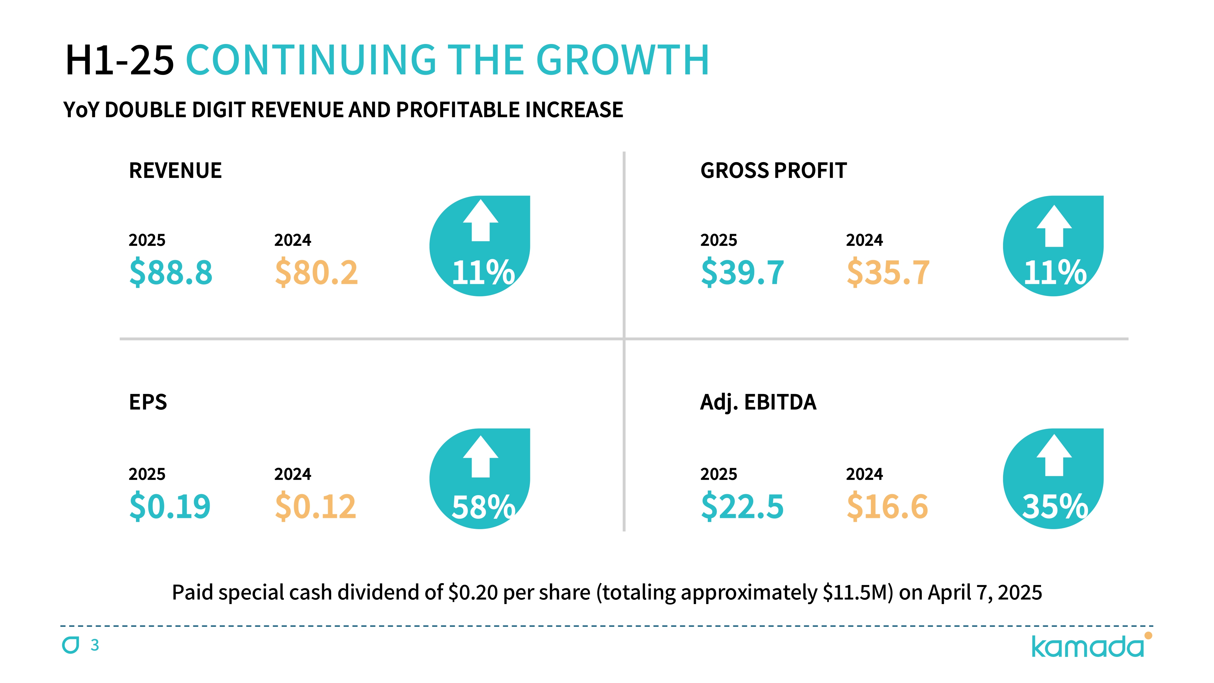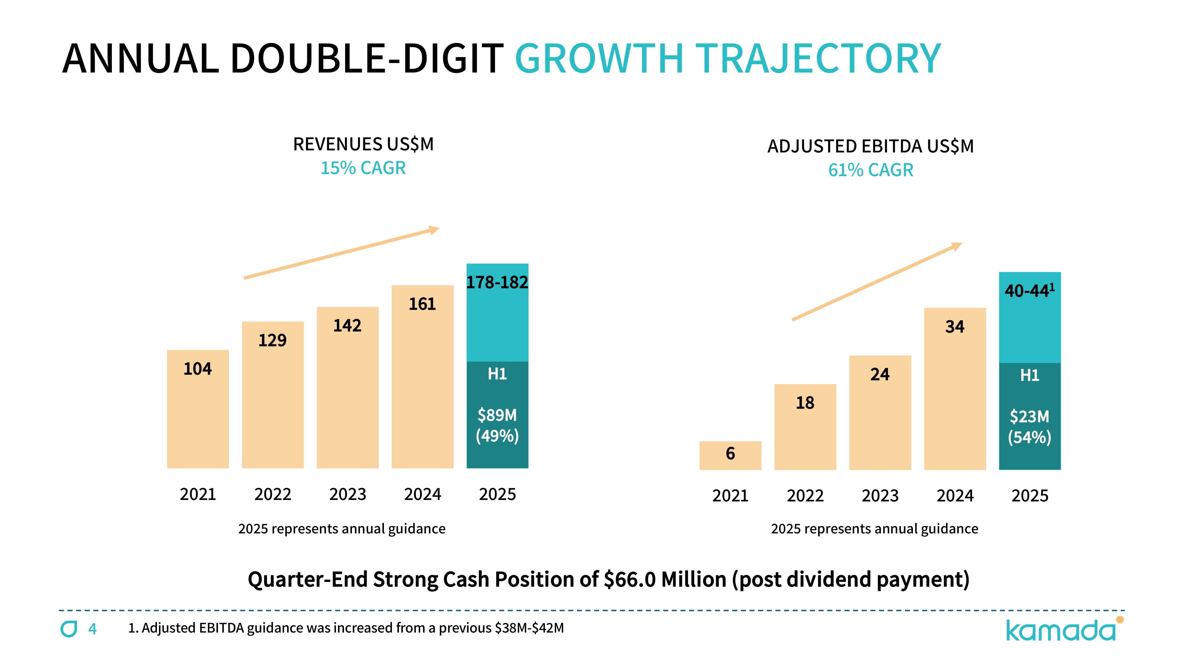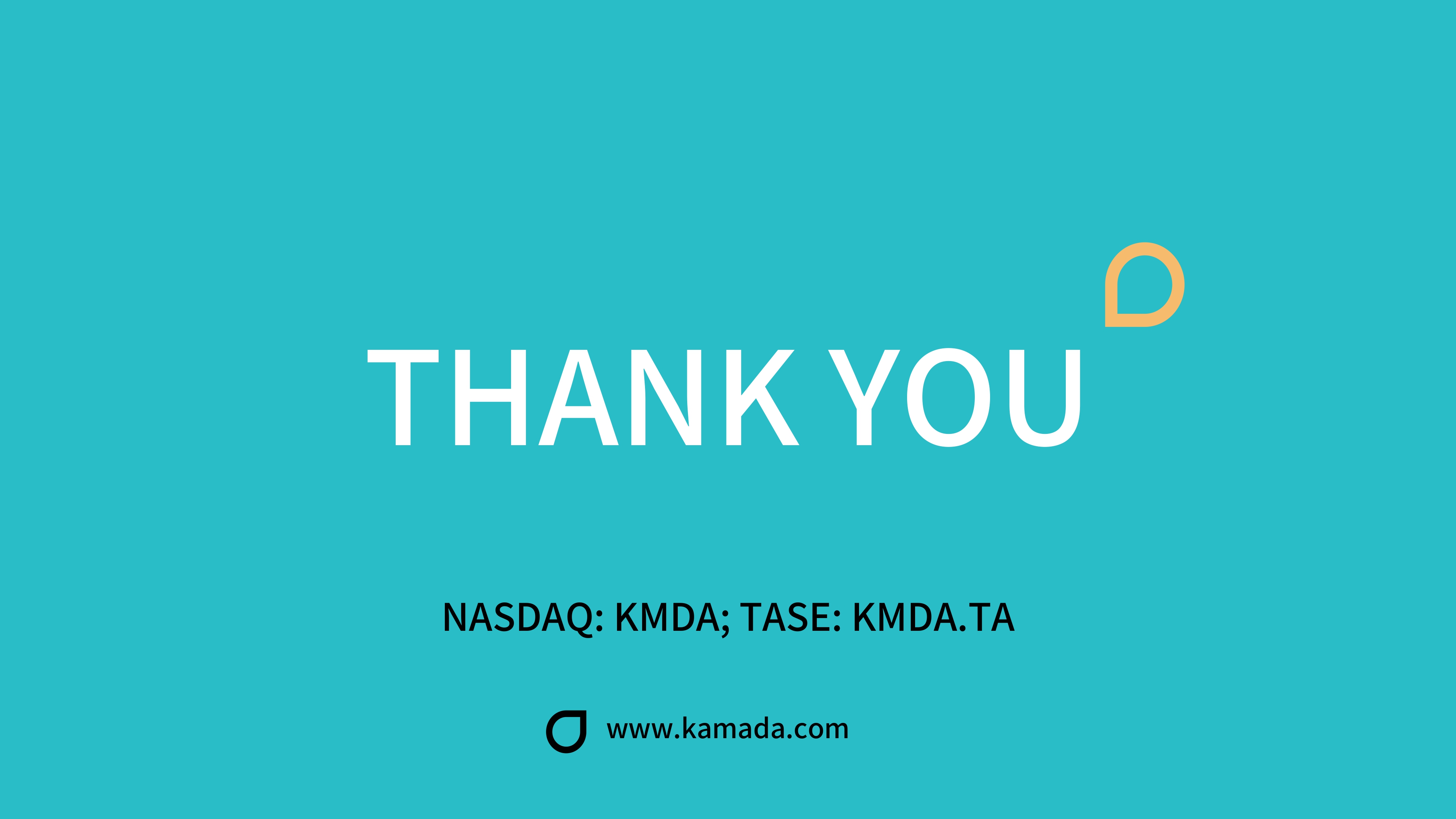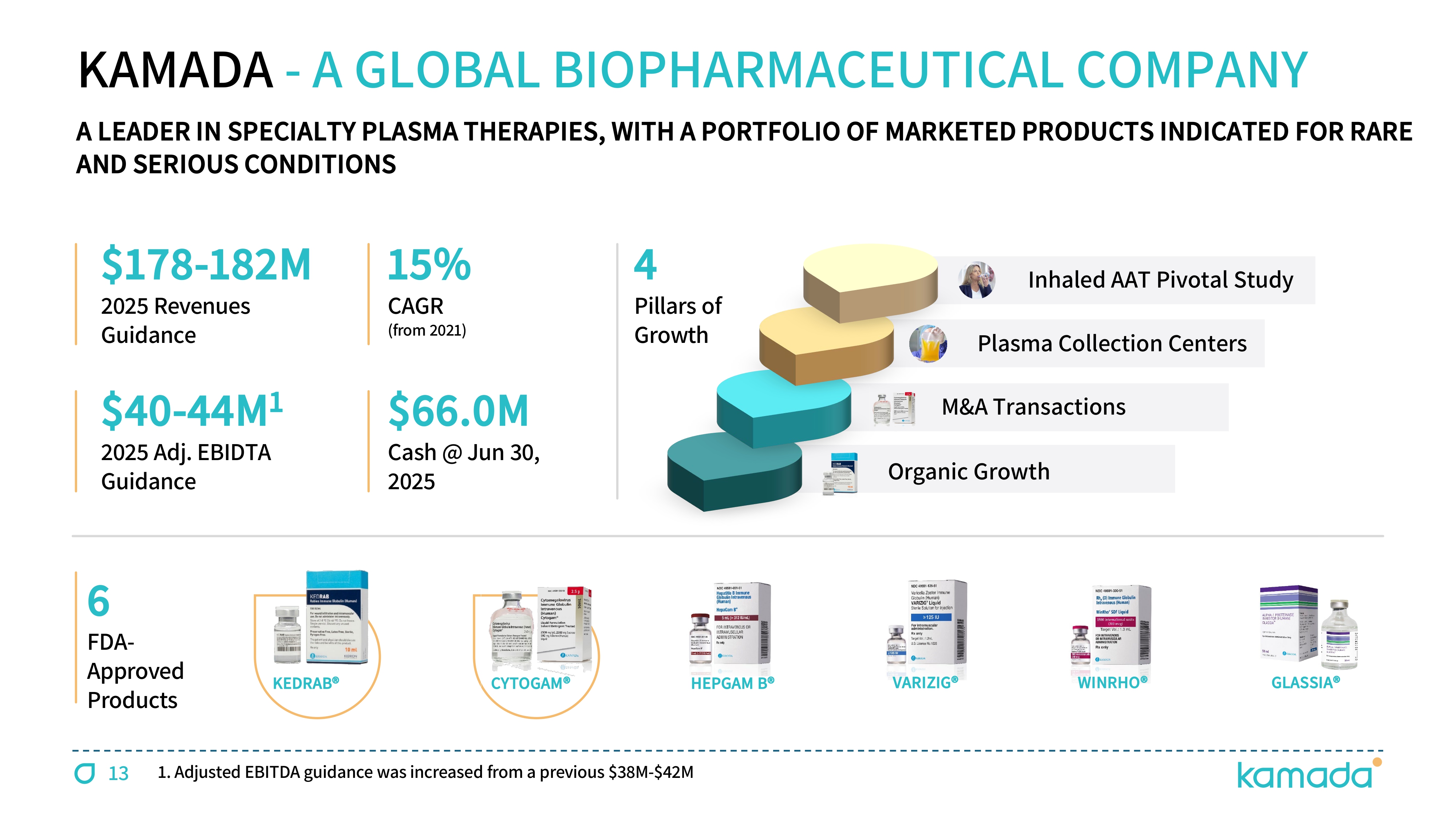 Kamada is increasing its adjusted EBITDA guidance from a range of $38 million to $42 million to a range of $40 million to $44 million and continues to expect to generate fiscal year 2025 total revenues in the range of $178 million to $182 million, representing double digit top- and bottom-line growth year-over-year.