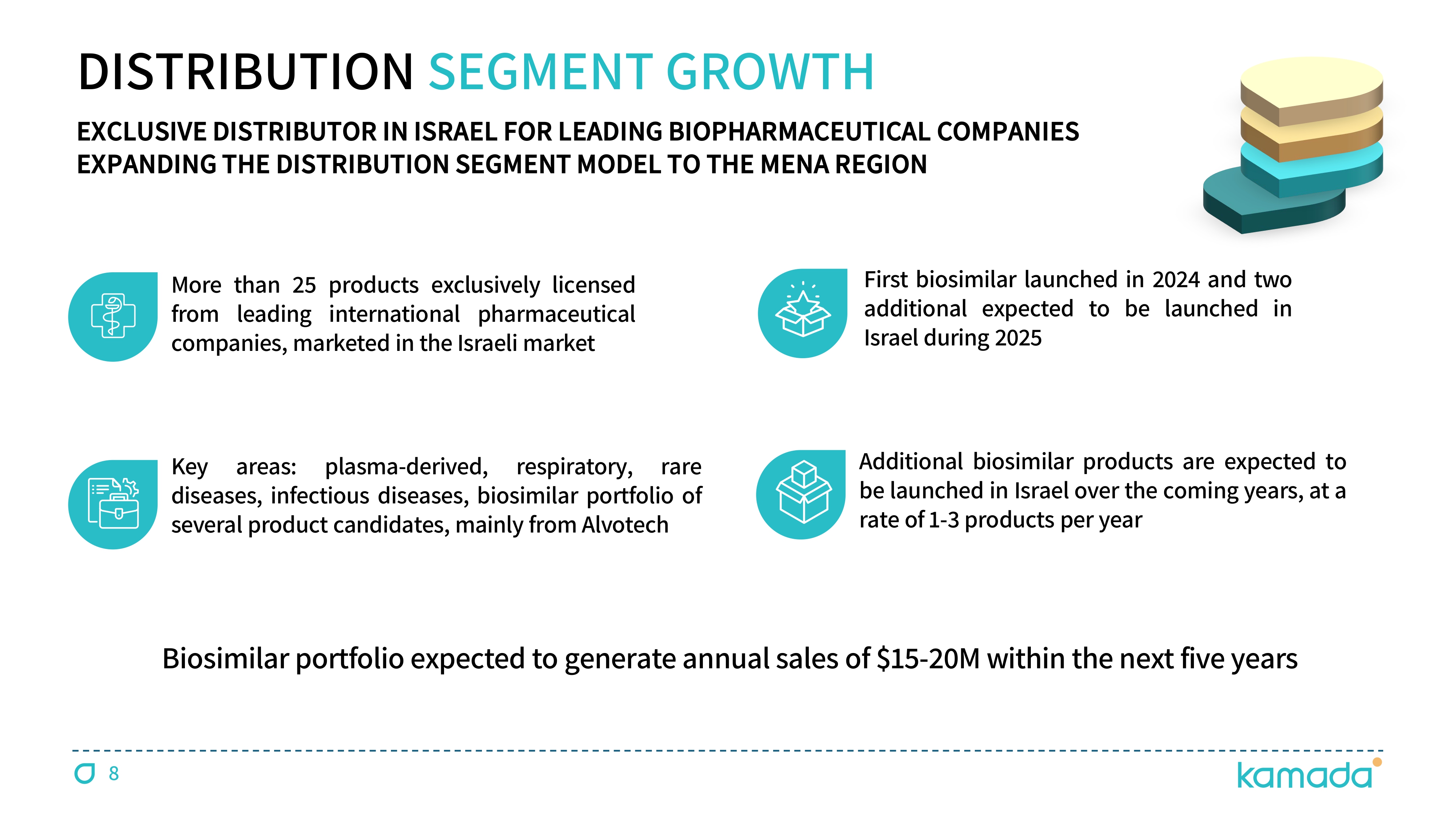 Kamada Ltd. (the “Company”) is a global biopharmaceutical company with a portfolio of marketed products indicated for rare and serious conditions and a leader in the specialty plasma-derived therapies field. The Company’s strategy is focused on driving profitable growth through four primary growth pillars: First, organic growth from its commercial activities, including continued investment in the commercialization and life cycle management of its proprietary products, which include six FDA-approved specialty plasma-derived products: KEDRAB®, CYTOGAM®, GLASSIA®, WINRHO SDF®, VARIZIG® and HEPAGAM B®, as well as KAMRAB®, KAMRHO (D)® and two types of equine-based anti-snake venom products, and the products in the distribution segment portfolio, mainly through the launch of several biosimilar products in Israel. Second: the Company aims to secure significant new business development, in-licensing, collaboration and/or merger and acquisition opportunities, which are anticipated to enhance the Company’s marketed products portfolio and leverage its financial strength and existing commercial infrastructure to drive long-term growth. Third: the Company is expanding its plasma collection operations to support revenue growth through the sale of normal source plasma to other plasma-derived manufacturers, and to support its increasing demand for hyper-immune plasma. The Company currently owns three operating plasma collection centers in the United States, in Beaumont Texas, Houston Texas, and San Antonio, Texas. Lastly, the Company is leveraging its manufacturing, research and development expertise to advance the development and commercialization of additional product candidates, targeting areas of significant unmet medical need, with the lead product candidate Inhaled AAT, for which the Company is continuing to progress the InnovAATe clinical trial, a randomized, double-blind, placebo-controlled, pivotal Phase 3 trial. FIMI Opportunity Funds, the leading private equity firm in Israel, is the Company’s controlling shareholder, beneficially owning approximately 38% of the outstanding ordinary shares.