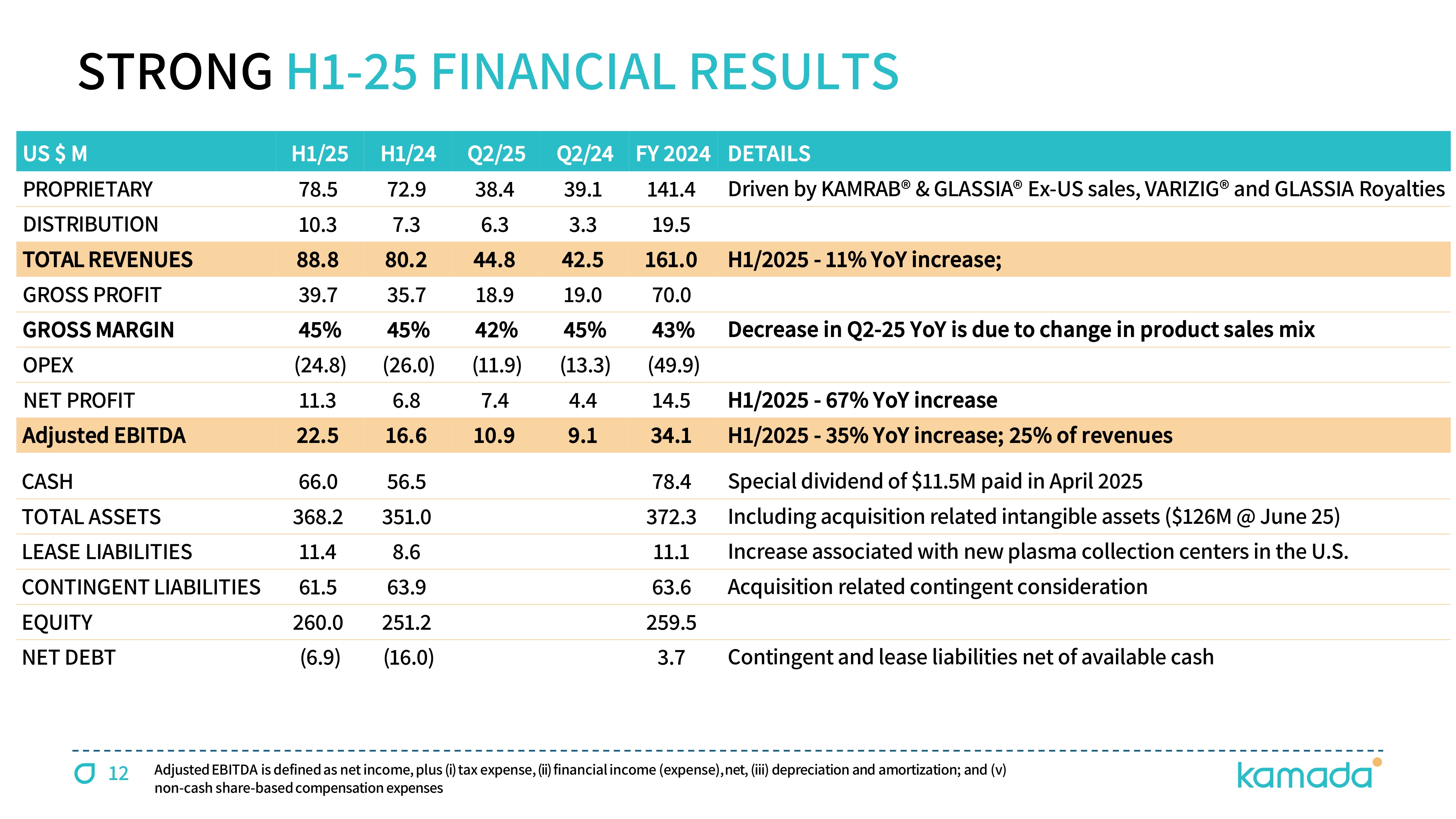 “Results for the second quarter and first half of 2025 were strong, and we continue to generate significant profitable growth through the diversity of our commercial product portfolio and disciplined management of operational expenses,” said Amir London, Kamada’s Chief Executive Officer. “Total revenues for the first half of the year were $88.8 million, representing an 11% increase year-over-year, and adjusted EBITDA was $22.5 million, up 35% year-over-year, representing a 25% margin of revenues. Based on our strong performance in the first half of the year and positive outlook for the remainder of 2025, we are increasing our annual adjusted EBITDA guidance of between $40 million to $44 million and reiterating our full-year 2025 revenue guidance of between $178 million to $182 million.”