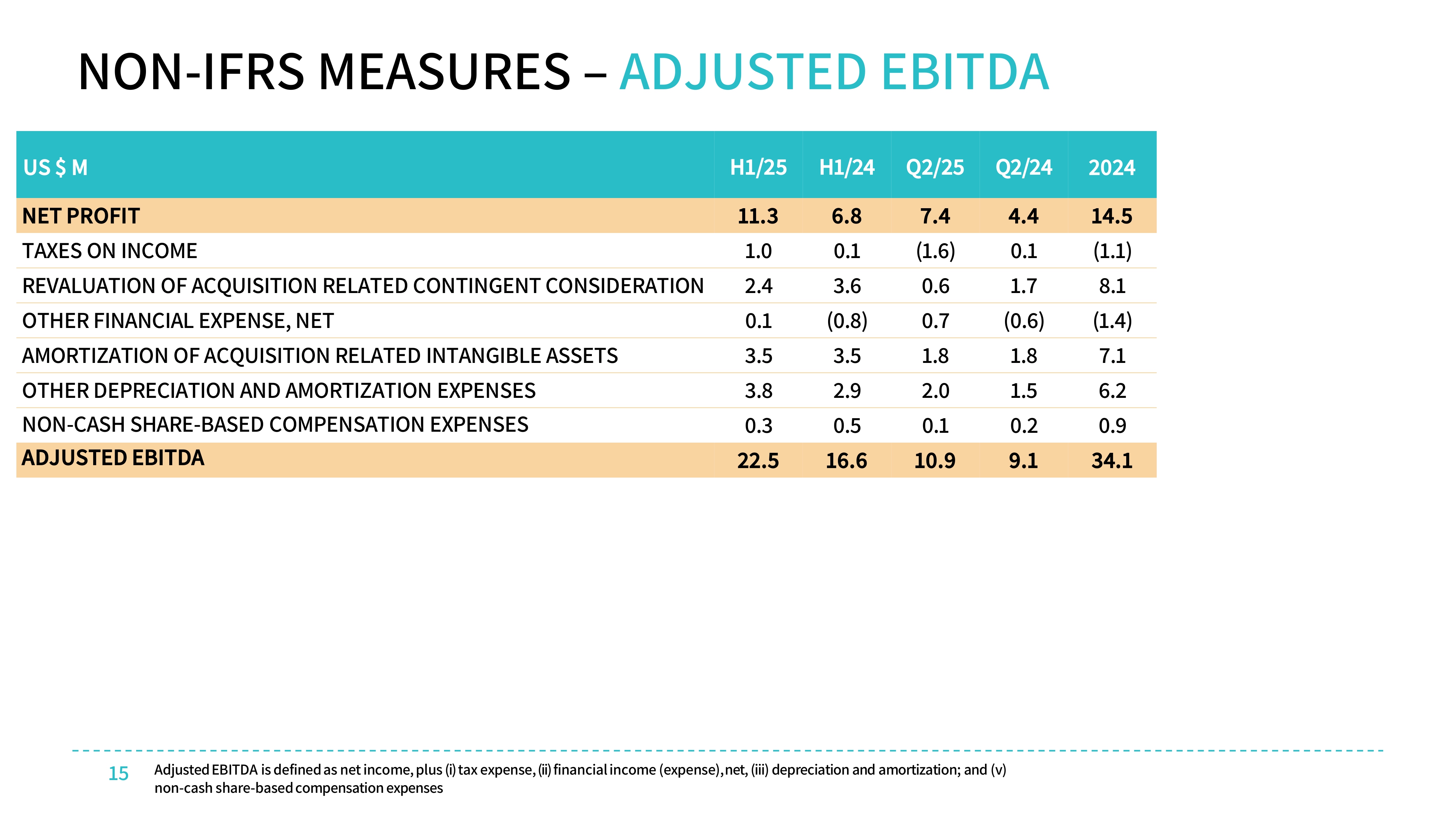 We present EBITDA and adjusted EBITDA because we use these non-IFRS financial measures to assess our operational performance, for financial and operational decision-making, and as a means to evaluate period-to-period comparisons on a consistent basis. Management believes these non-IFRS financial measures are useful to investors because: (1) they allow for greater transparency with respect to key metrics used by management in its financial and operational decision-making and provide investors with a meaningful perspective on the current underlying performance of the Company’s core ongoing operations; and (2) they exclude the impact of certain items that are not directly attributable to our core operating performance and that may obscure trends in the core operating performance of the business. Non-IFRS financial measures have limitations as an analytical tool and should not be considered in isolation from, or as a substitute for, our IFRS results. We expect to continue reporting non-IFRS financial measures, adjusting for the items described below, and we expect to continue to incur expenses similar to certain of the non-cash, non-IFRS adjustments described below. Accordingly, unless otherwise stated, the exclusion of these and other similar items in the presentation of non-IFRS financial measures should not be construed as an inference that these items are unusual, infrequent or non-recurring. EBITDA and adjusted EBITDA are not recognized terms under IFRS and do not purport to be an alternative to IFRS terms as an indicator of operating performance or any other IFRS measure. Moreover, because not all companies use identical measures and calculations, the presentation of EBITDA and adjusted EBITDA may not be comparable to other similarly titled measures of other companies. EBITDA is defined as net income (loss), plus income tax expense, plus or minus financial income or expenses, net, plus or minus income or expense in respect of securities measured at fair value, net, plus or minus income or expenses in respect of currency exchange differences and derivatives instruments, net, plus depreciation and amortization expense, whereas adjusted EBITDA is the EBITDA plus non-cash share-based compensation expenses and certain other costs.
