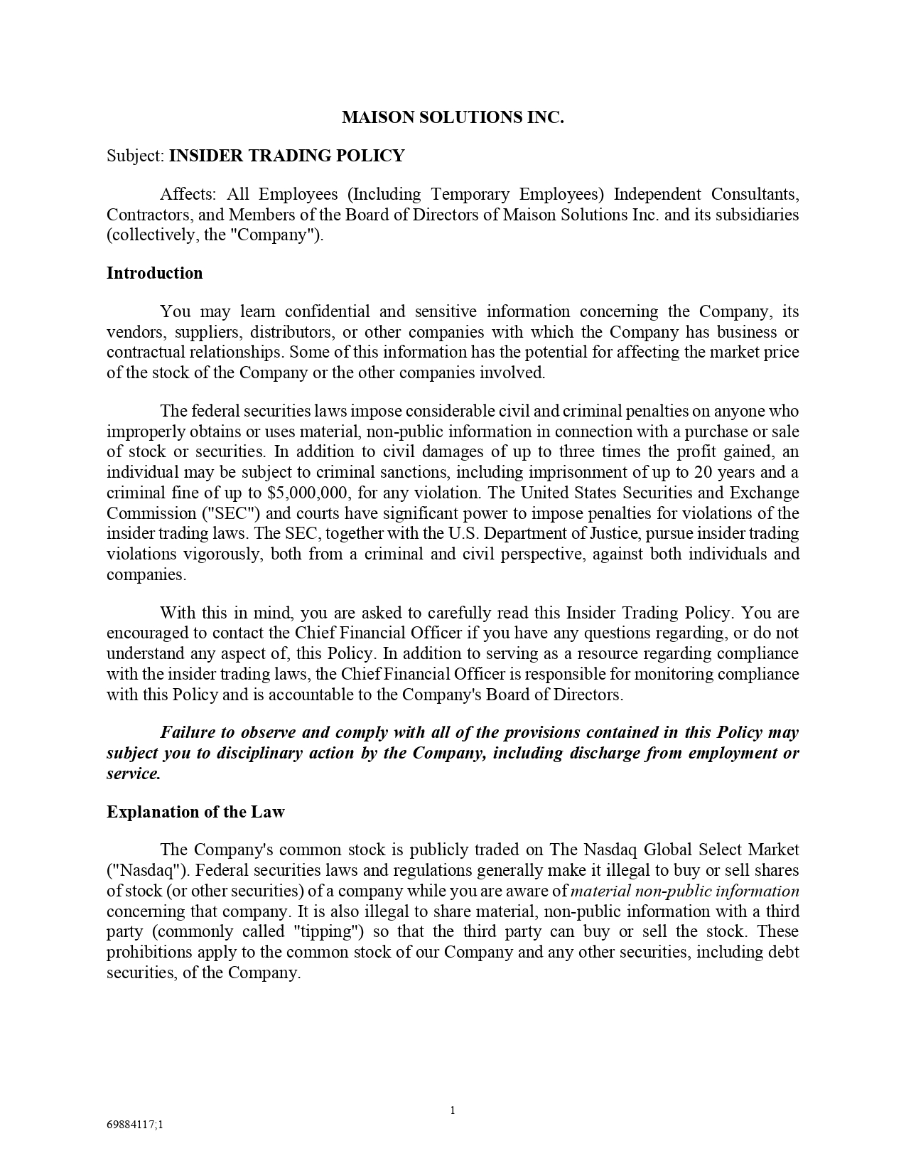 MAISON SOLUTIONS INC. Subject: INSIDER TRADING POLICY Affects : All Employees (Including Temporary Employees) Independent Consultants, Contractors, and Members of the Board of Directors of Maison Solutions Inc . and its subsidiaries (collectively, the "Company") . Introduction You may learn confidential and sensitive information concerning the Company, its vendors, suppliers, distributors, or other companies with which the Company has business or contractual relationships . Some of this information has the potential for affecting the market price of the stock of the Company or the other companies involved . The federal securities laws impose considerable civil and criminal penalties on anyone who improperly obtains or uses material, non - public information in connection with a purchase or sale of stock or securities . In addition to civil damages of up to three times the profit gained, an individual may be subject to criminal sanctions, including imprisonment of up to 20 years and a criminal fine of up to $ 5 , 000 , 000 , for any violation . The United States Securities and Exchange Commission ("SEC") and courts have significant power to impose penalties for violations of the insider trading laws . The SEC, together with the U . S . Department of Justice, pursue insider trading violations vigorously, both from a criminal and civil perspective, against both individuals and companies . With this in mind, you are asked to carefully read this Insider Trading Policy . You are encouraged to contact the Chief Financial Officer if you have any questions regarding, or do not understand any aspect of, this Policy . In addition to serving as a resource regarding compliance with the insider trading laws, the Chief Financial Officer is responsible for monitoring compliance with this Policy and is accountable to the Company's Board of Directors . Failure to observe and comply with all of the provisions contained in this Policy may subject you to disciplinary action by the Company, including discharge from employment or service . Explanation of the Law The Company's common stock is publicly traded on The Nasdaq Global Select Market ("Nasdaq") . Federal securities laws and regulations generally make it illegal to buy or sell shares of stock (or other securities) of a company while you are aware of material non - public information concerning that company . It is also illegal to share material, non - public information with a third party (commonly called "tipping") so that the third party can buy or sell the stock . These prohibitions apply to the common stock of our Company and any other securities, including debt securities, of the Company .
