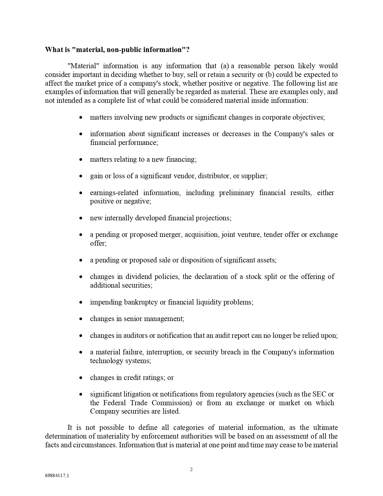 1 69884117;1 What is "material, non - public information"? "Material" information is any information that (a) a reasonable person likely would consider important in deciding whether to buy, sell or retain a security or (b) could be expected to affect the market price of a company's stock, whether positive or negative . The following list are examples of information that will generally be regarded as material . These are examples only, and not intended as a complete list of what could be considered material inside information : matters involving new products or significant changes in corporate objectives; information about significant increases or decreases in the Company's sales or financial performance; matters relating to a new financing; gain or loss of a significant vendor, distributor, or supplier; earnings - related information, including preliminary financial results, either positive or negative; new internally developed financial projections; a pending or proposed merger, acquisition, joint venture, tender offer or exchange offer; a pending or proposed sale or disposition of significant assets; changes in dividend policies, the declaration of a stock split or the offering of additional securities; impending bankruptcy or financial liquidity problems; changes in senior management; changes in auditors or notification that an audit report can no longer be relied upon; a material failure, interruption, or security breach in the Company's information technology systems; changes in credit ratings; or significant litigation or notifications from regulatory agencies (such as the SEC or the Federal Trade Commission) or from an exchange or market on which Company securities are listed . It is not possible to define all categories of material information, as the ultimate determination of materiality by enforcement authorities will be based on an assessment of all the facts and circumstances .